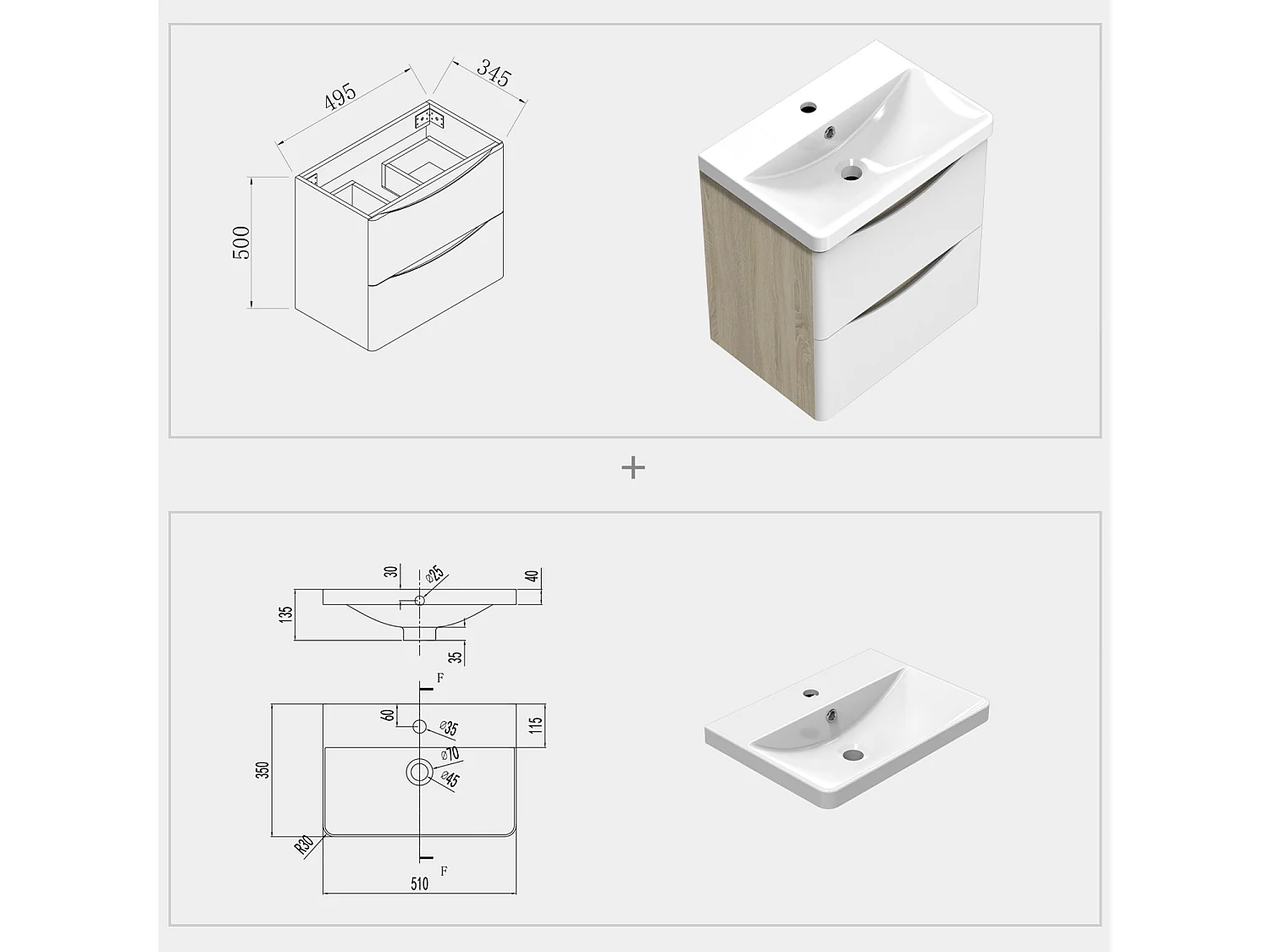 AICA Badezimmerschrank hängend 50cm Mineralguss waschbecken mit Unterschrank - Eiche & Weiß - SEMAL