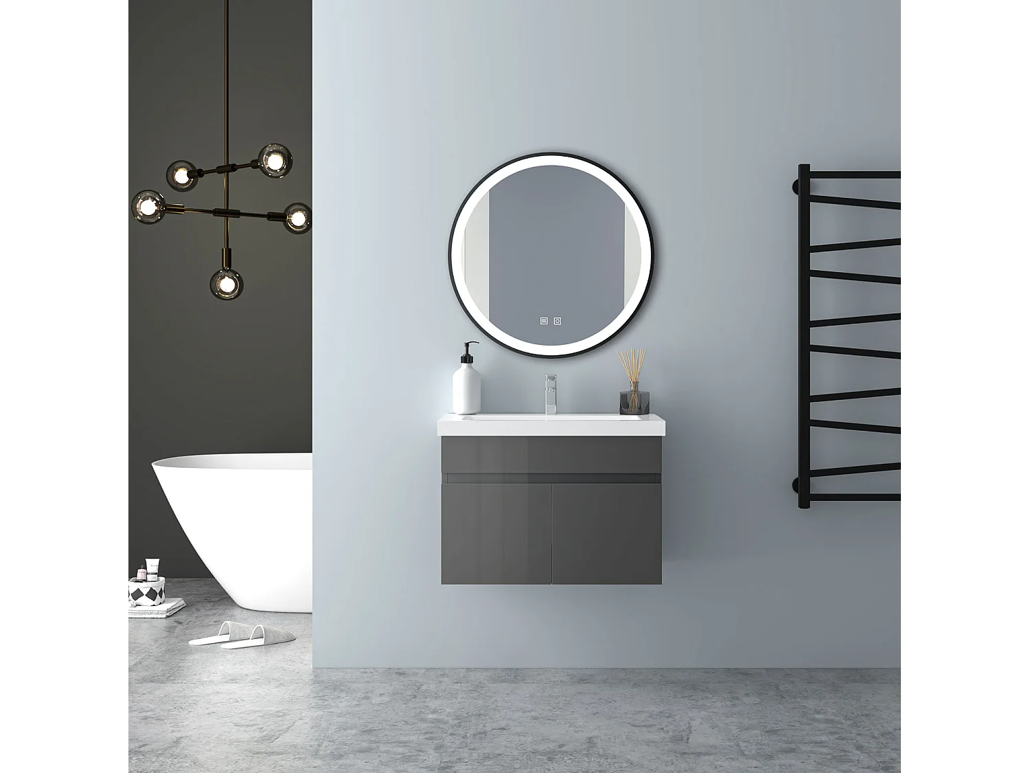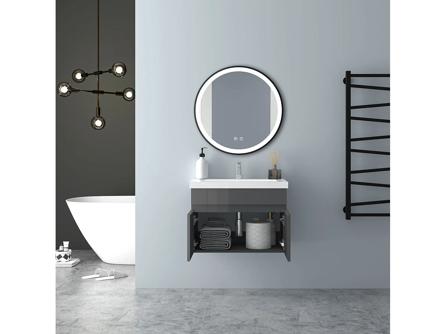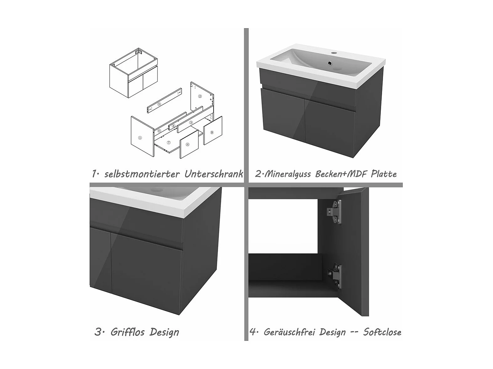 AICA Badezimmerschränke 60cm Mineralguss Waschtisch mit Unterschrank - Hochglanz Dunkelgrau Hängeschrank - MARO