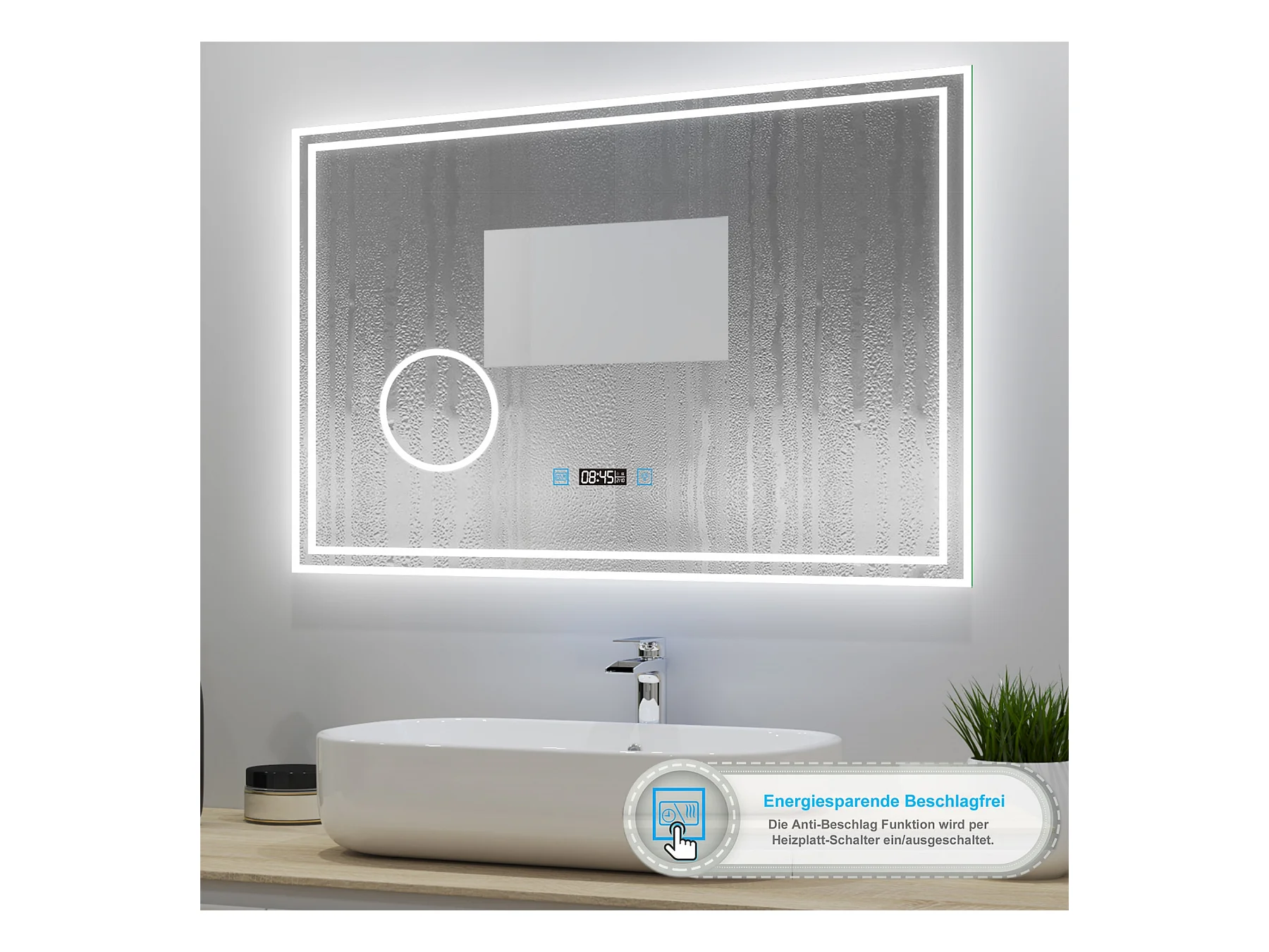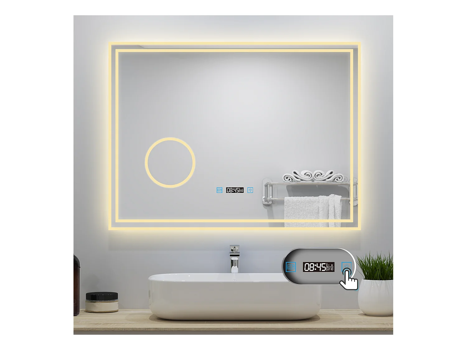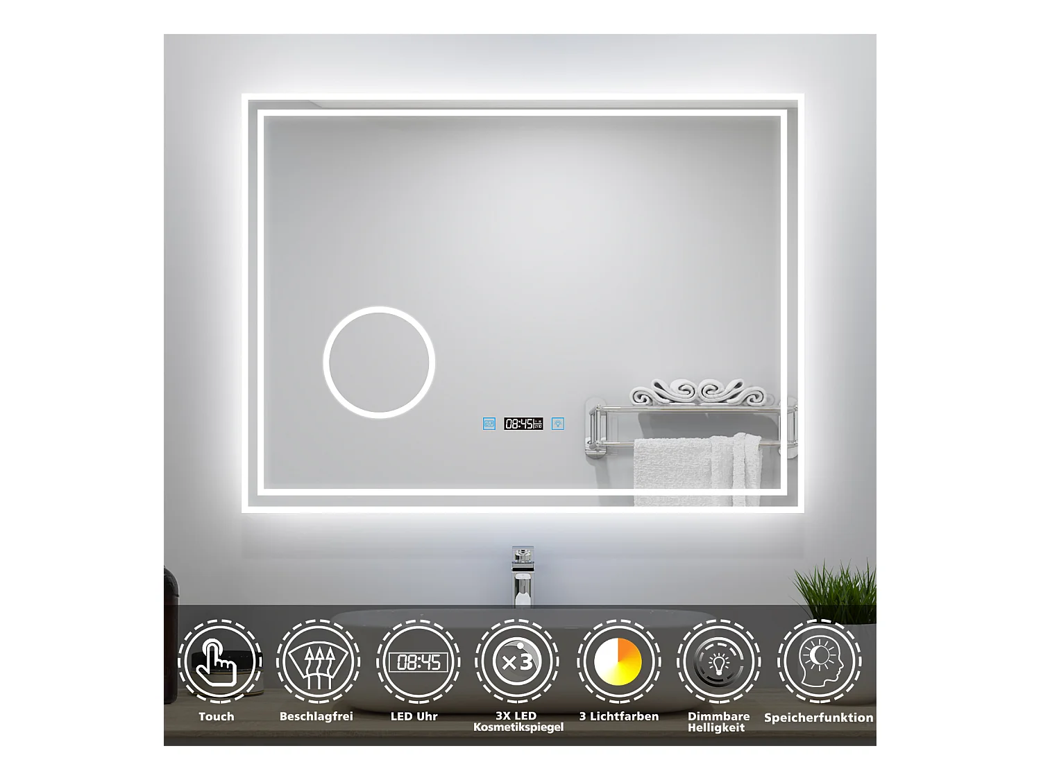 AICA Badezimmerspiegel mit LED-Beleuchtung 80x60cm Uhr Kosmetikspiegel 3 Lichtfarbe+Dimmbar Beschlagfrei Memory-Funktion