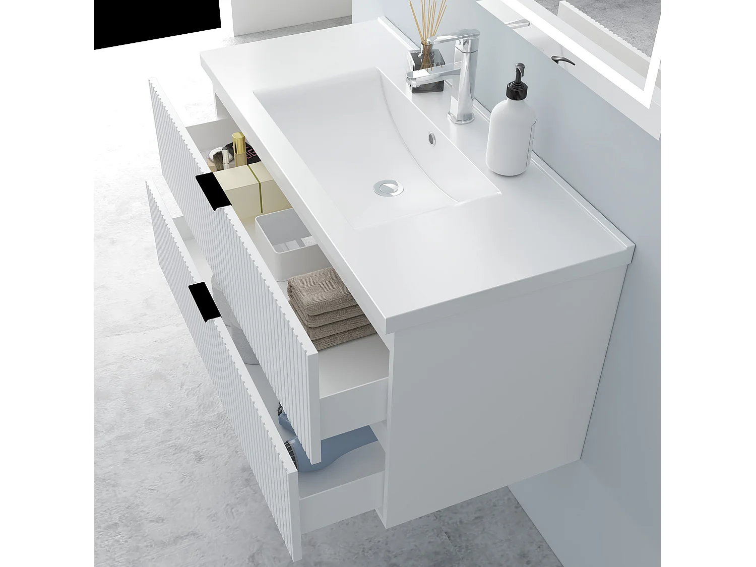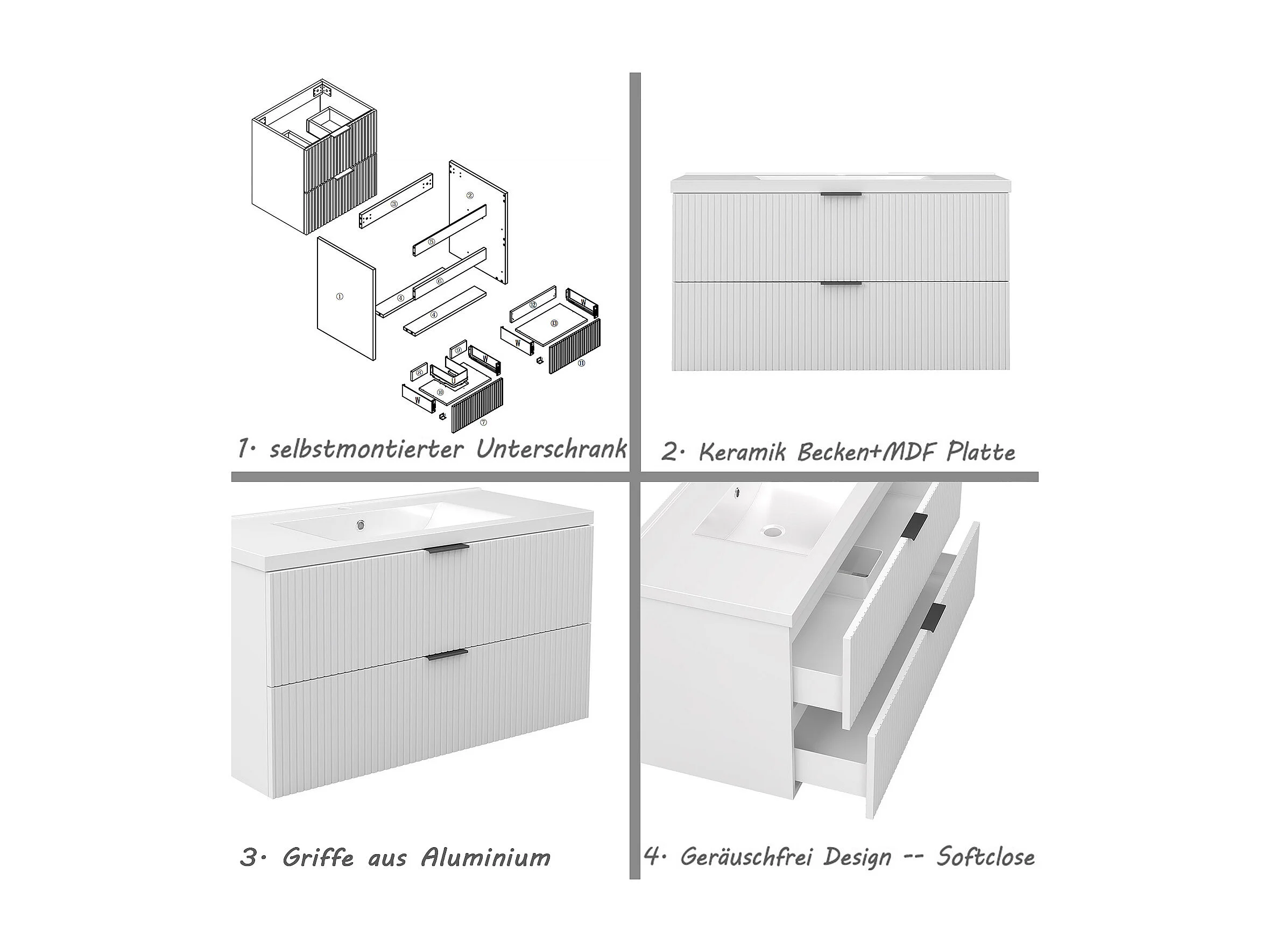 AICA Badmöbel 100cm Dickes Keramik Waschtisch mit Unterschrank hängend - Streifenoptik - Matt Weiß