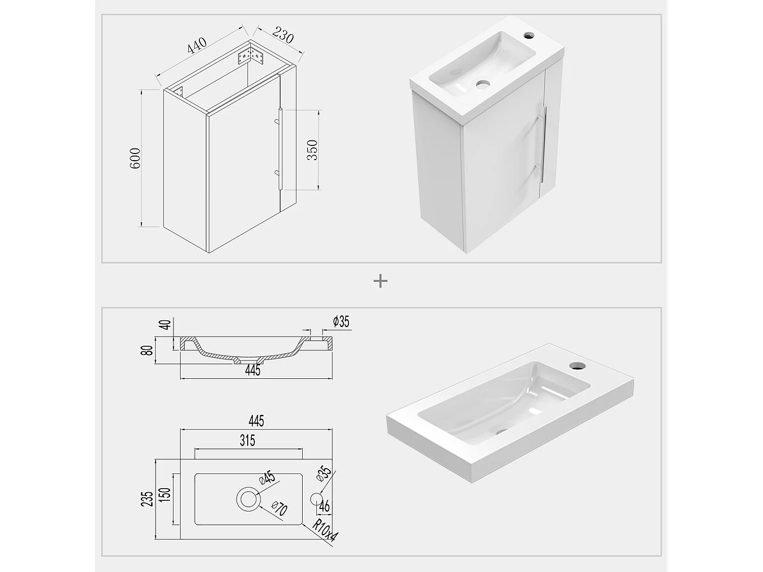 AICA Badmöbel 45cm Mineralguss Waschtisch mit Unterschrank - Matt Weiß Hängeschrank