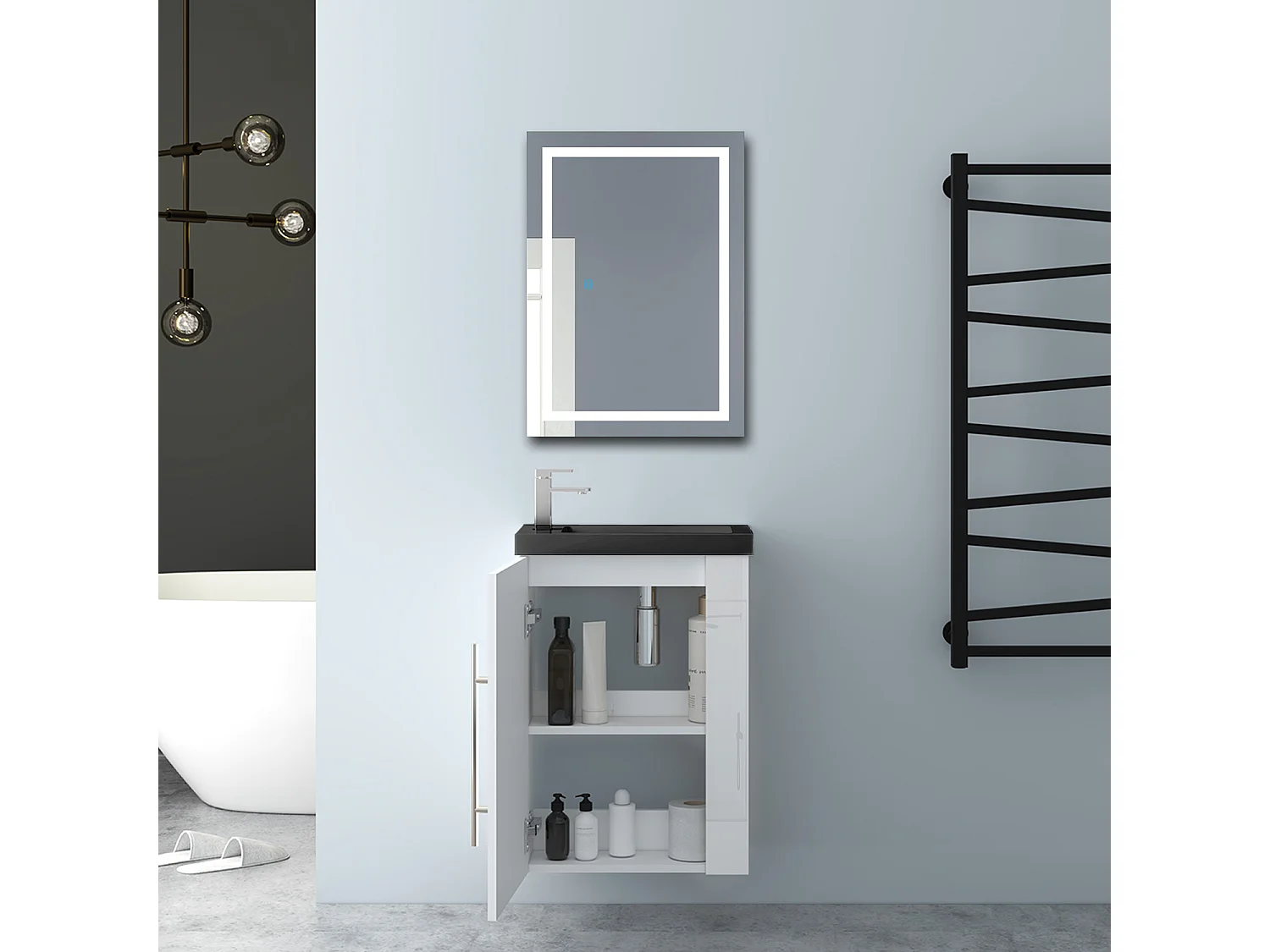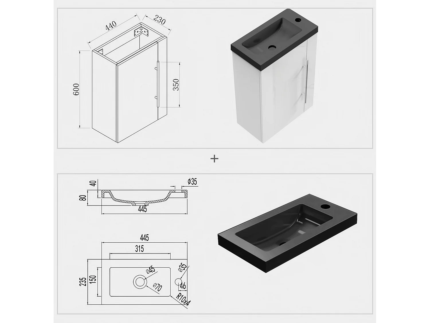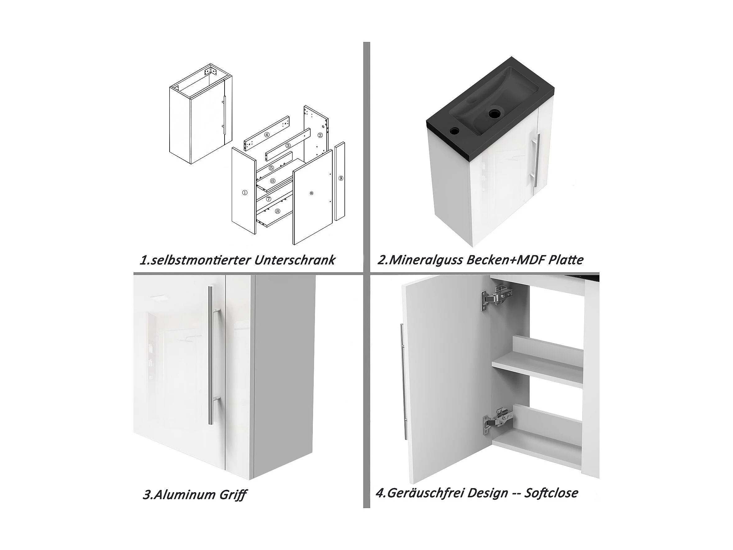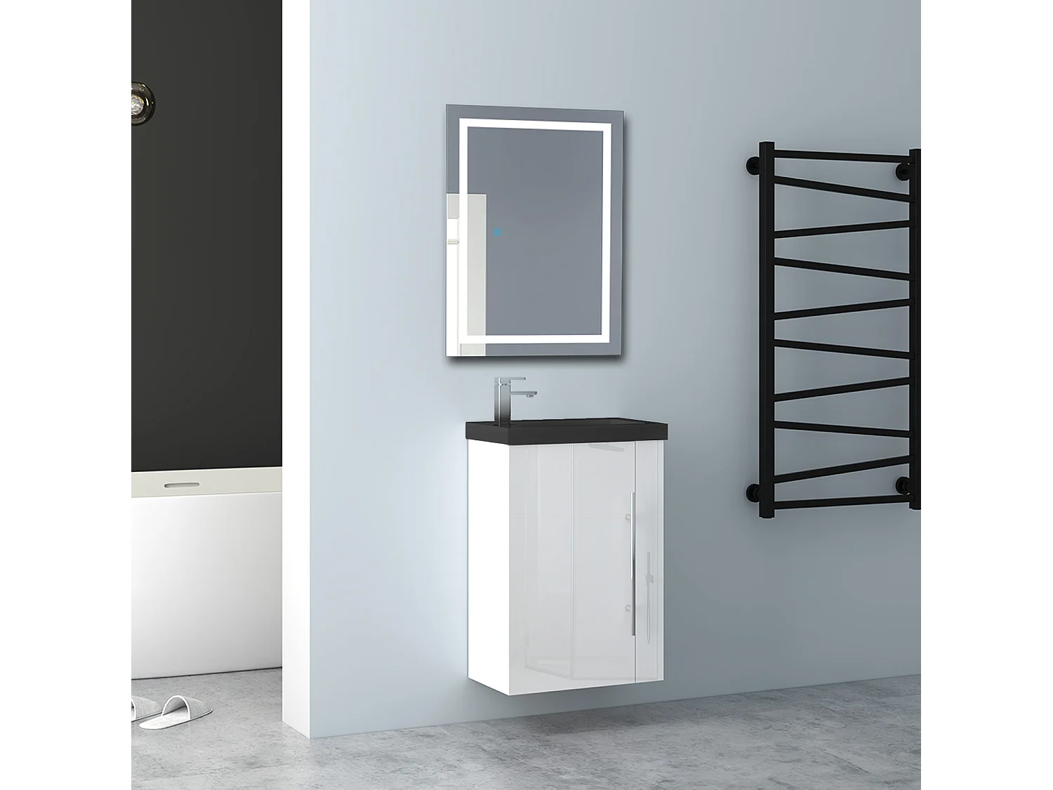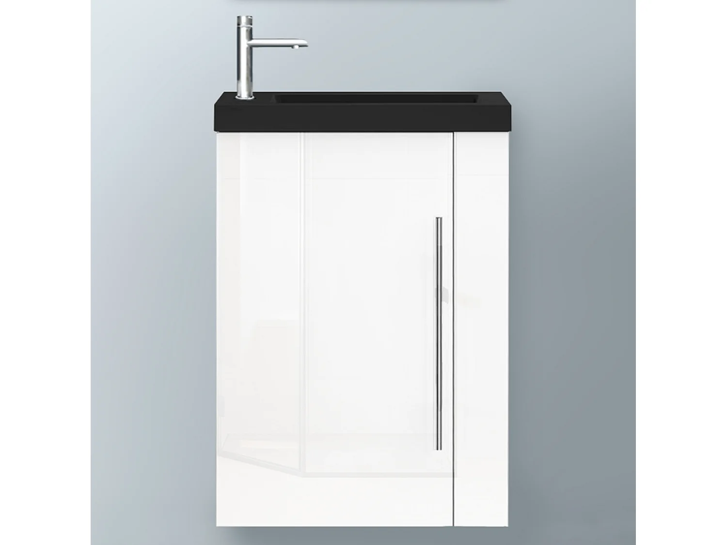 AICA Badmöbel 45cm Schwarz Waschtisch mit Unterschrank - Hochglanz Weiß Hängeschrank
