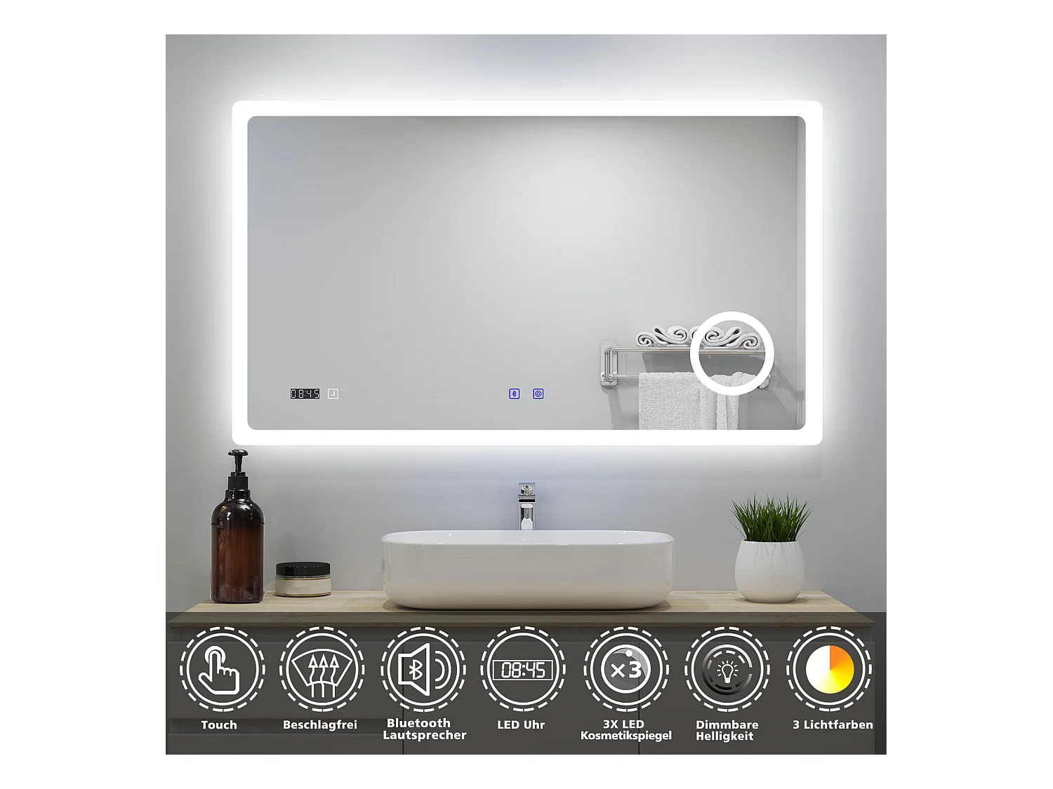 AICA Badspiegel mit LED-Beleuchtung 140x80cm Bluetooth Uhr Kosmetikspiegel 3 Lichtfarbe+Dimmbar Beschlagfrei Memory-Funktion