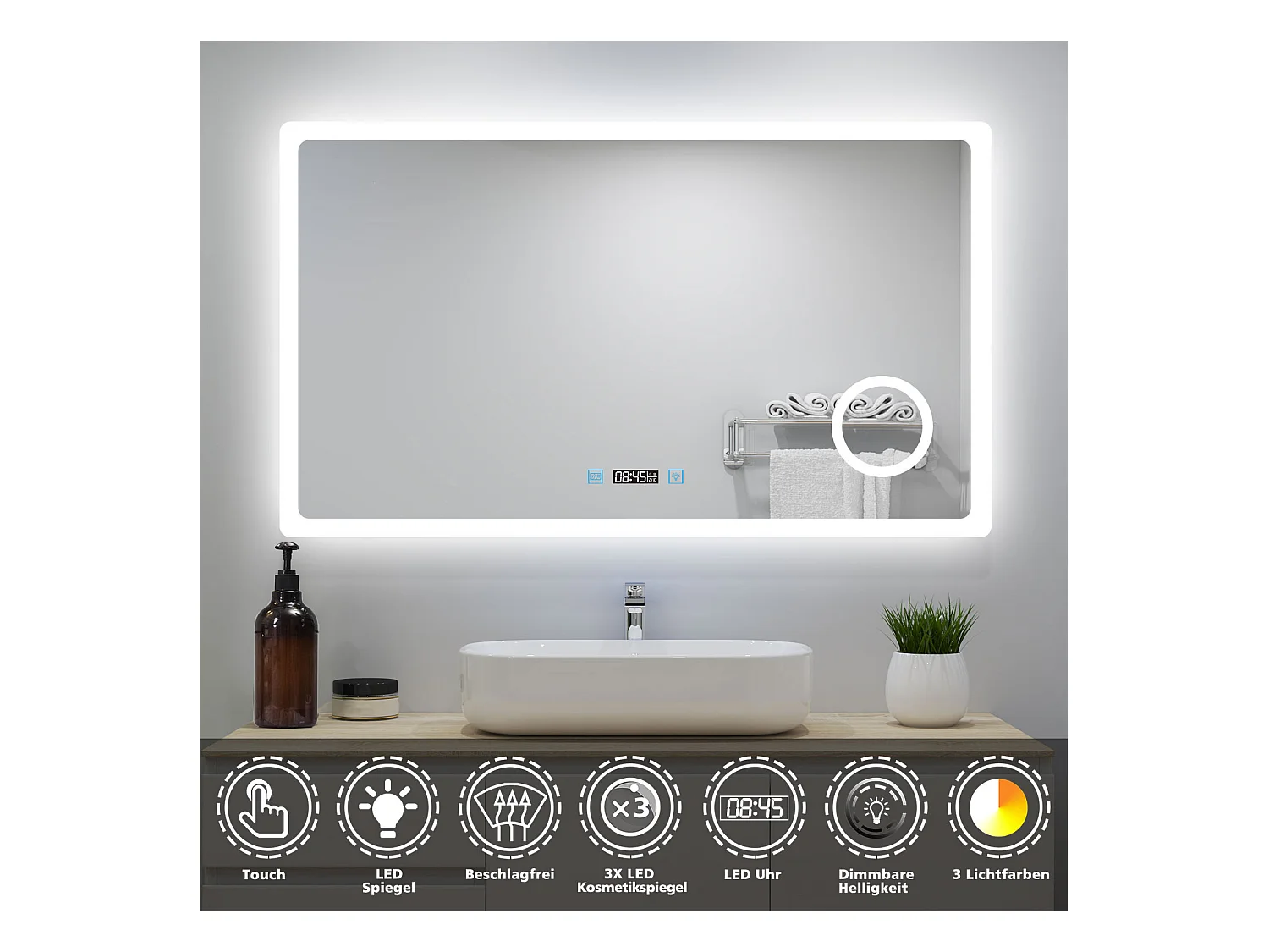 AICA Badspiegel mit LED-Beleuchtung 140x80cm Uhr Kosmetikspiegel Beschlagfrei 3 Lichtfarbe+Dimmbar Memory-Funktion