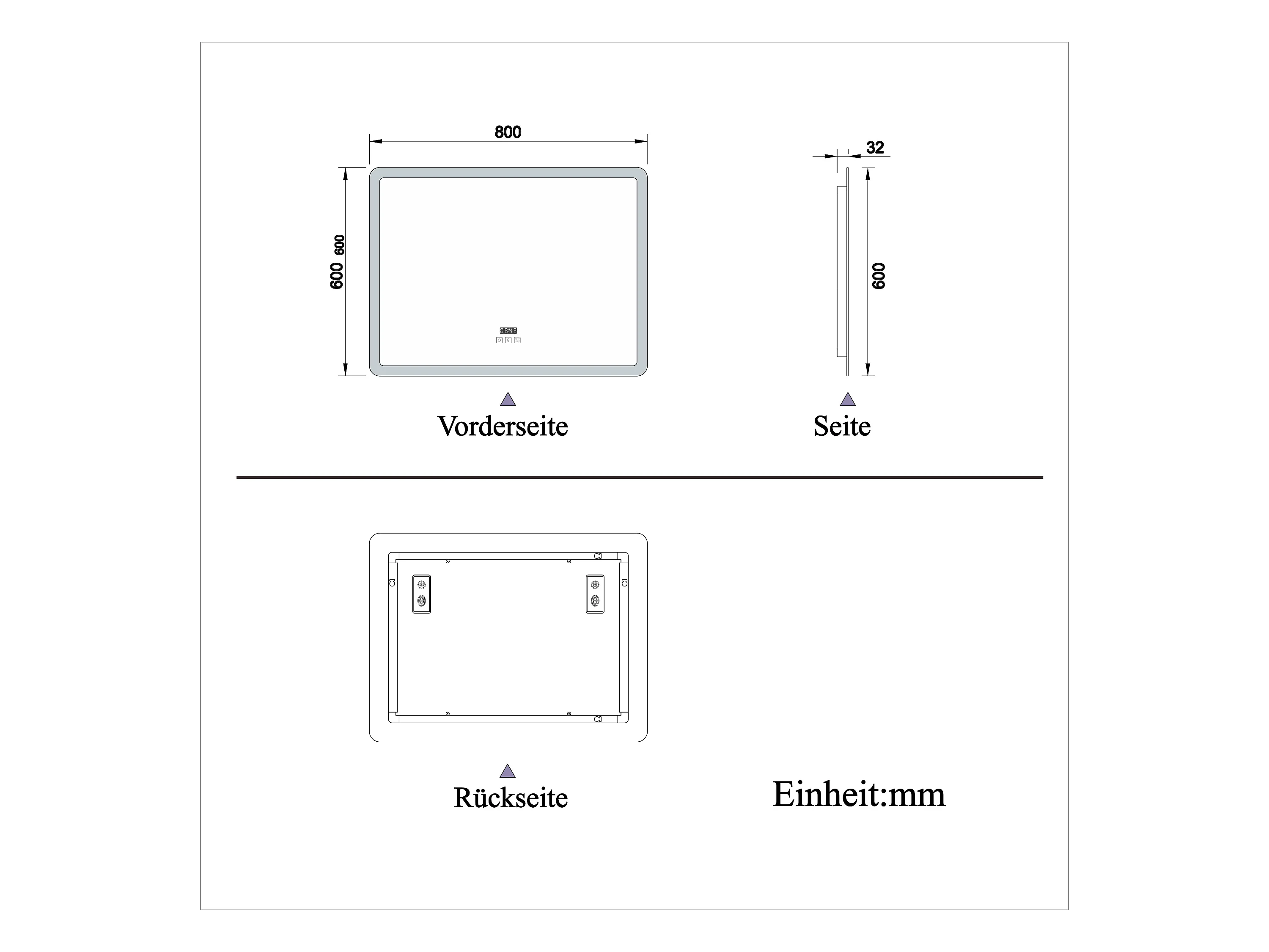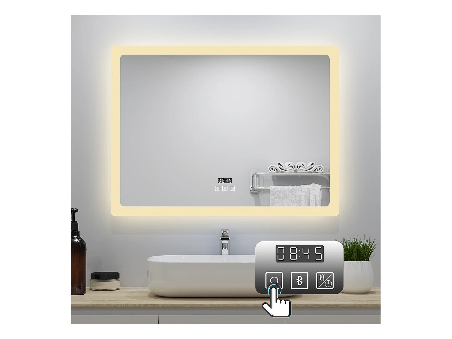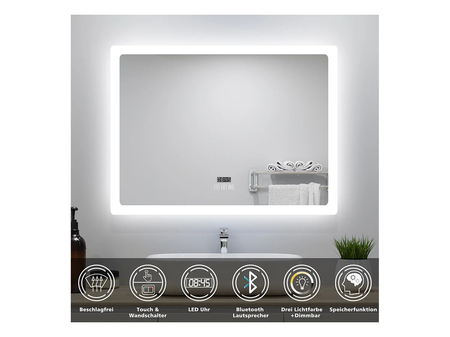 AICA Badspiegel mit LED-Beleuchtung 80x60cm Bluetooth Uhr Beschlagfrei 3 Lichtfarbe+Dimmbar Memory-Funktion