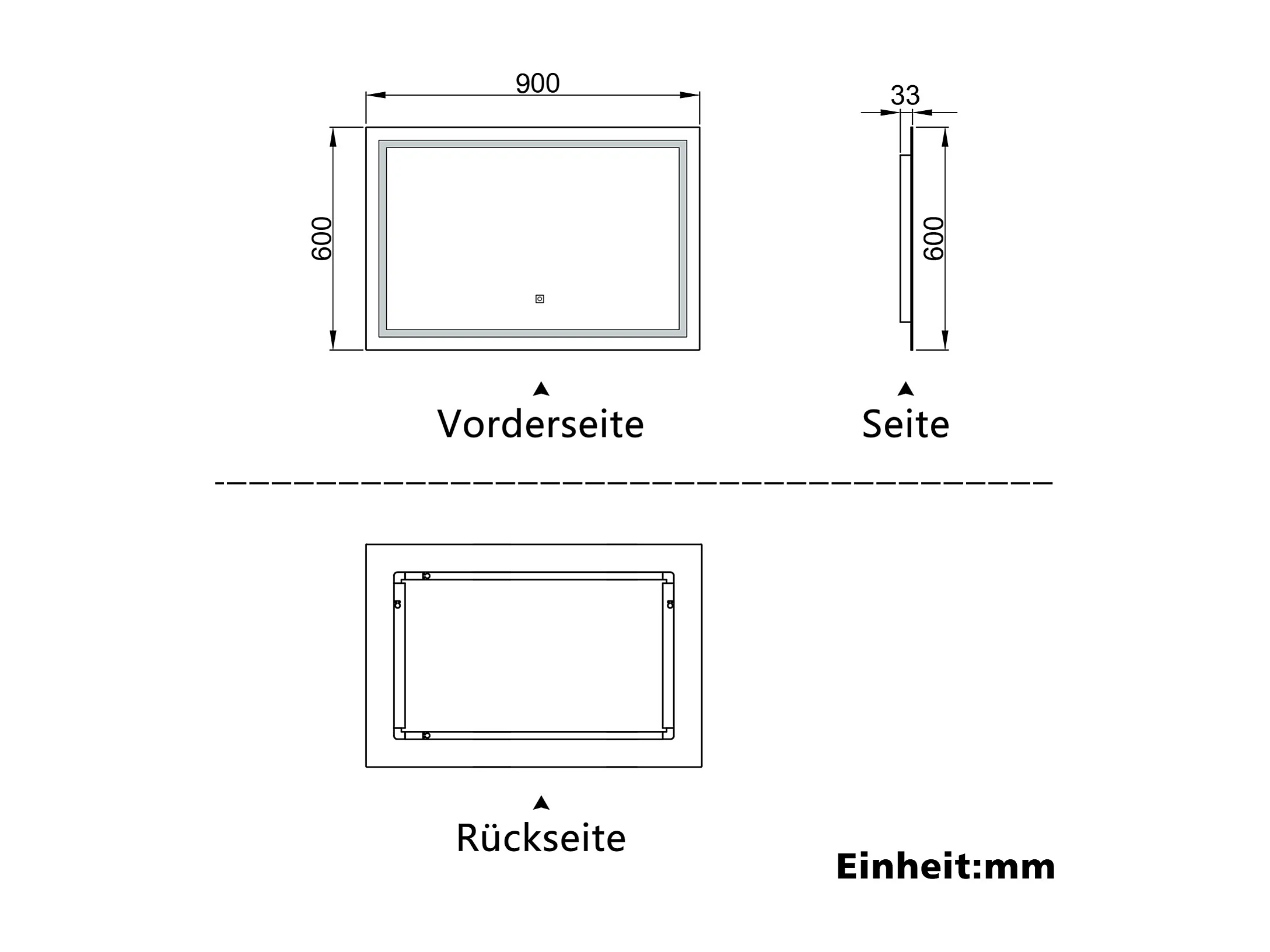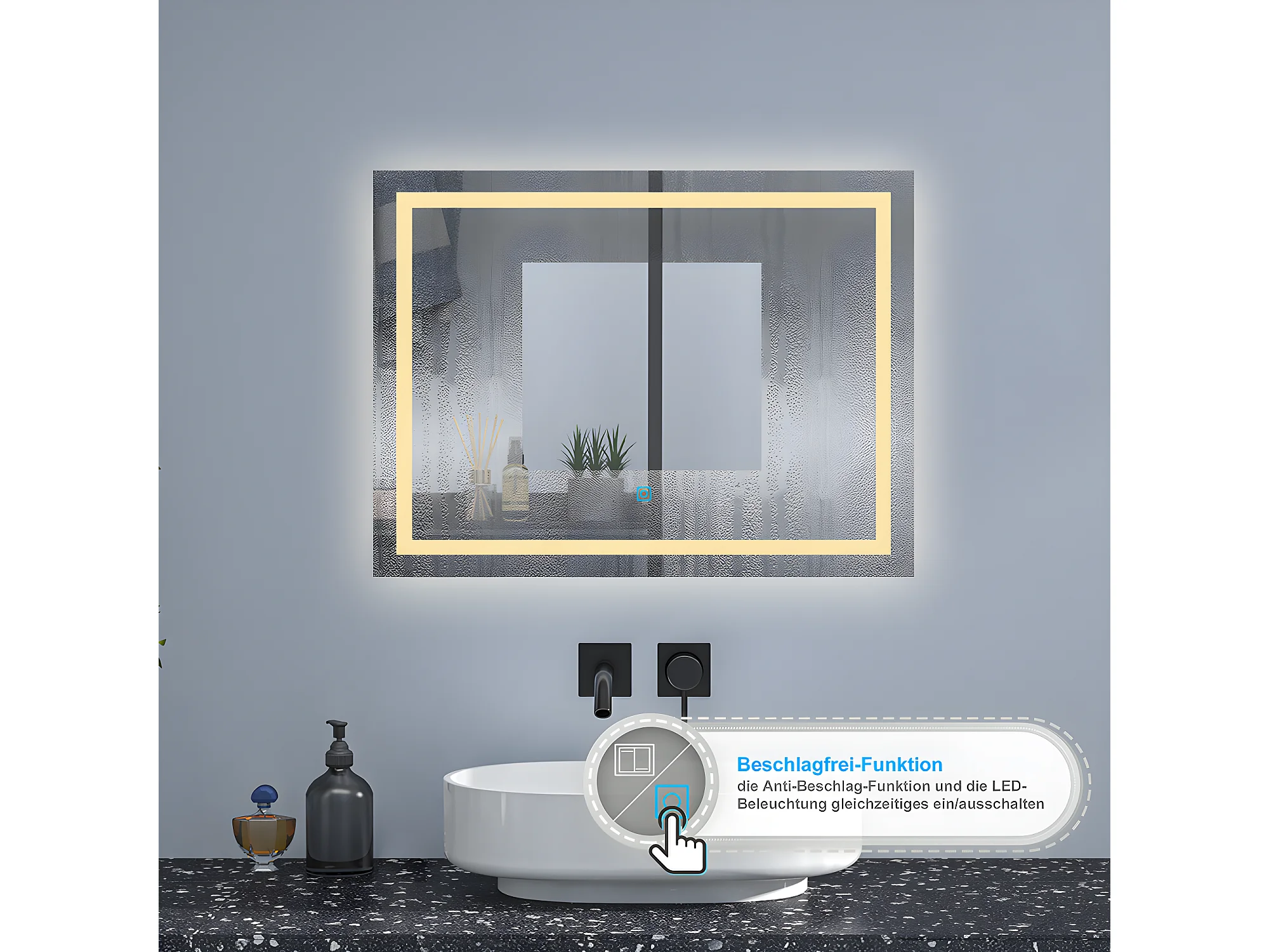 AICA Badspiegel mit LED-Beleuchtung 90x60cm Wand/Touchschalter Beschlagfrei 3 Lichtfarbe+Dimmbar Memory-Funktion - PALMAR