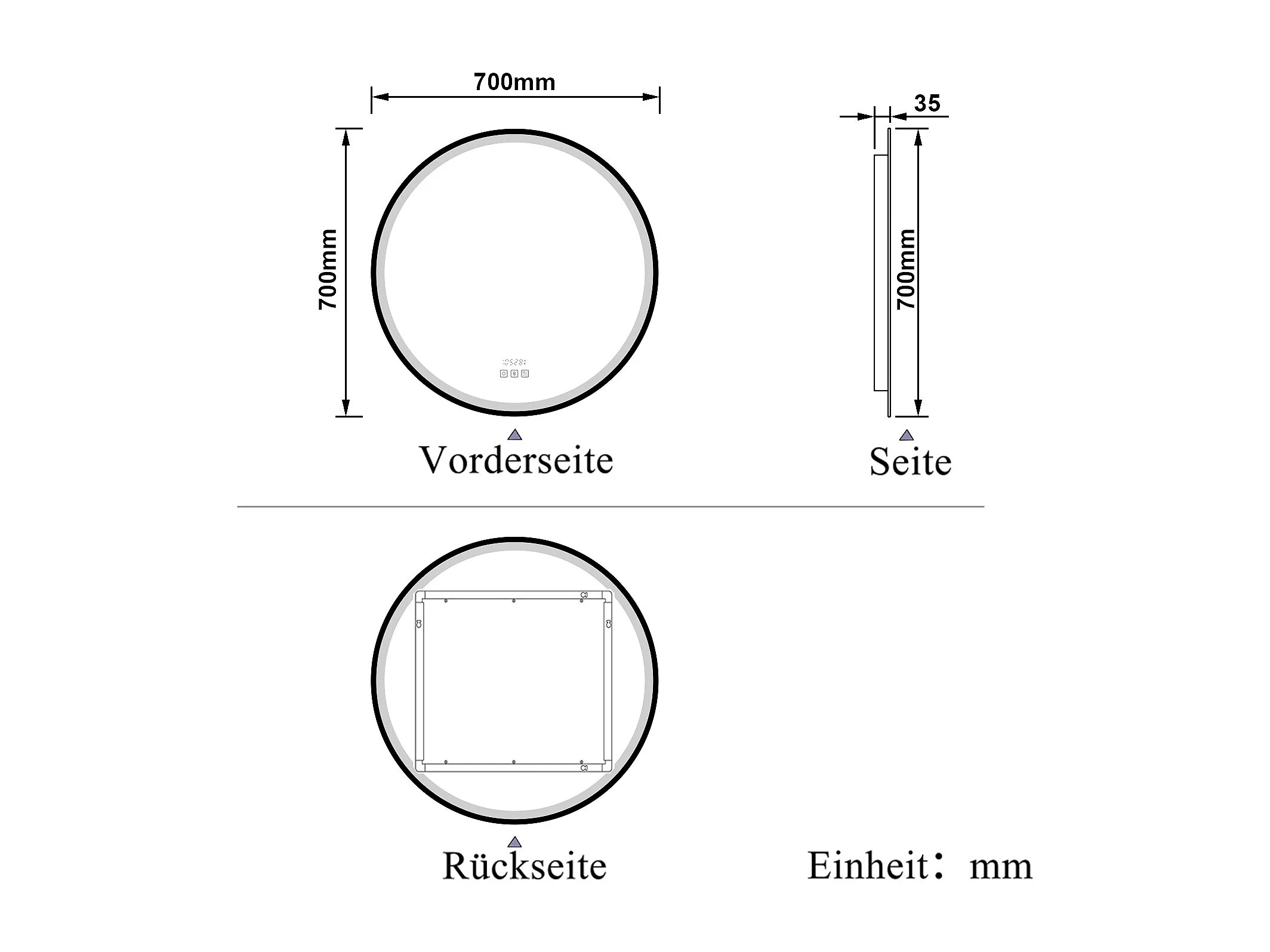 AICA LED Badspiegel Rund 70cm Beschlagfrei Bluetooth Uhr 3 Lichtfarbe Dimmbar - Schwarzem Rahmen