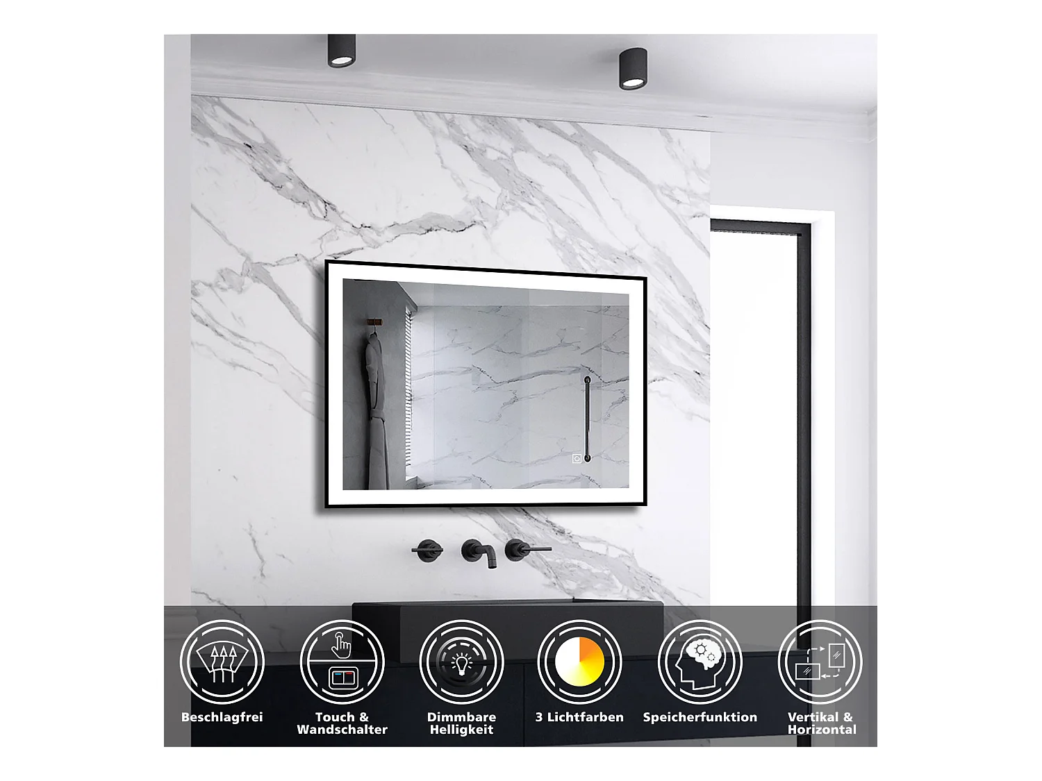 AICA LED Wandspiegel 70x50cm Beschlagfrei 3 Lichtfarbe+Dimmbar Schwarz Rahmen Memory-Funktion