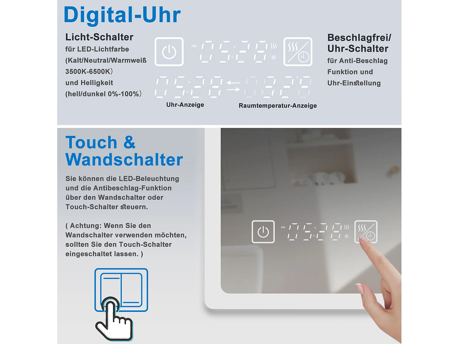 AICA LED Wandspiegel mit Steckdose 100x60cm Uhr Kosmetikspiegel Beschlagfrei 3 Lichtfarbe+Dimmbar