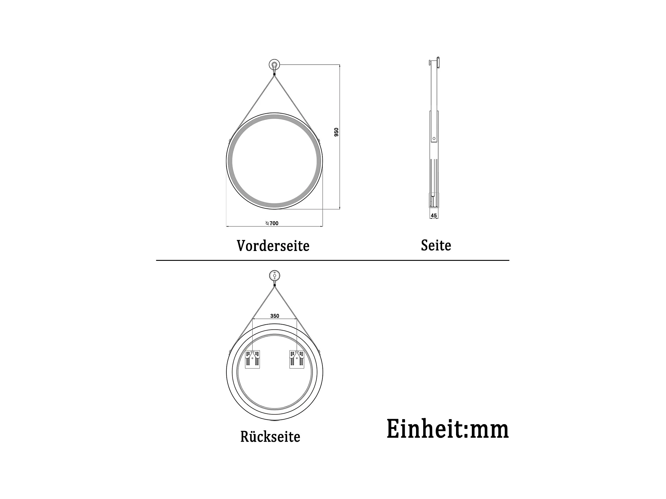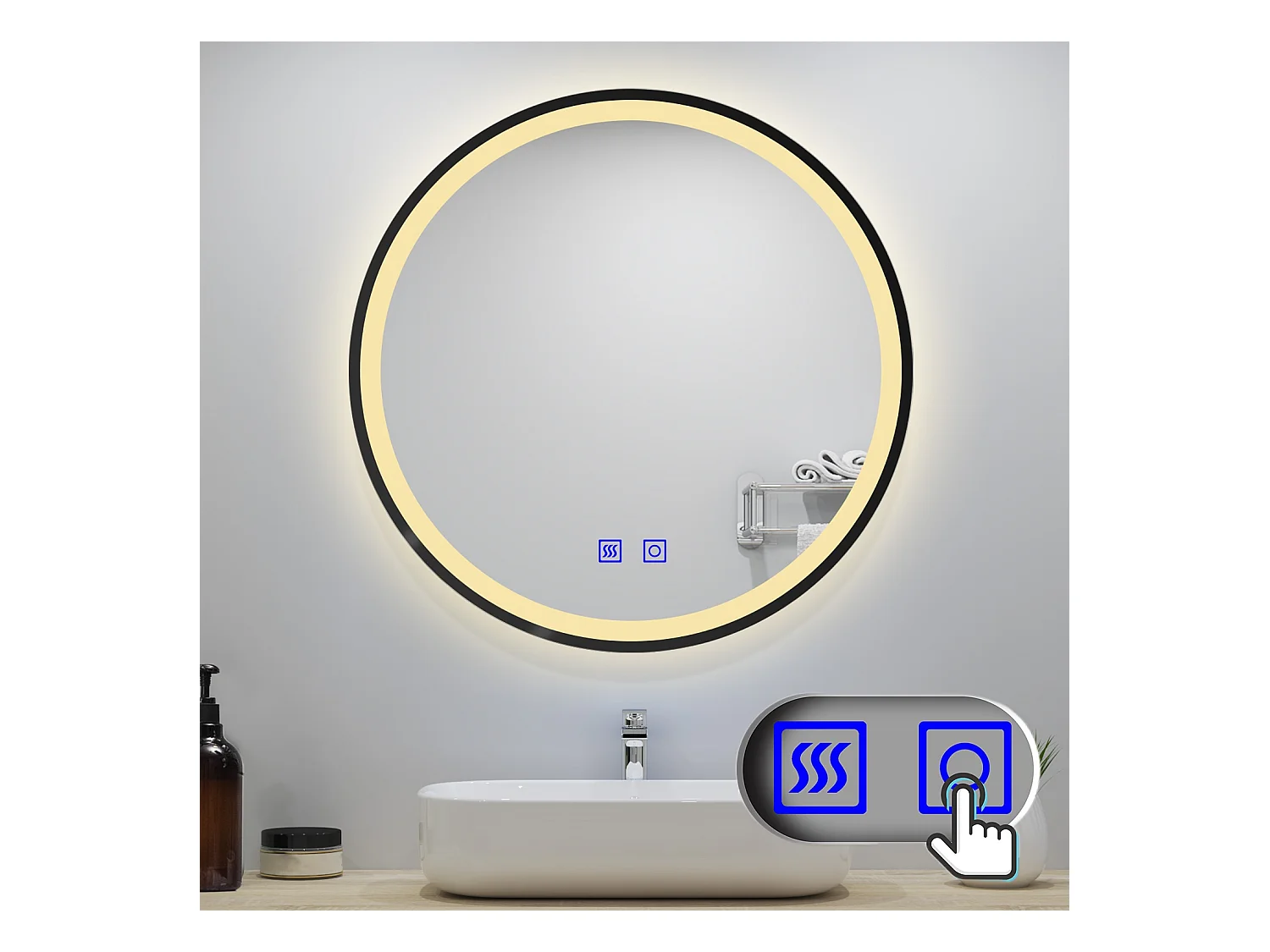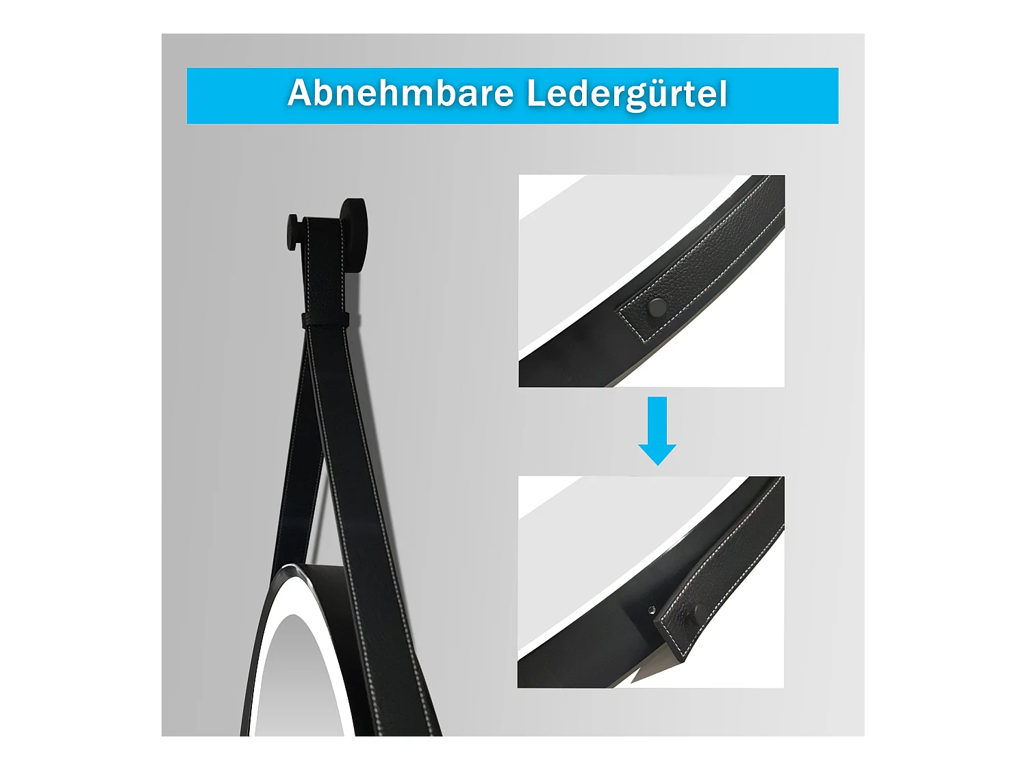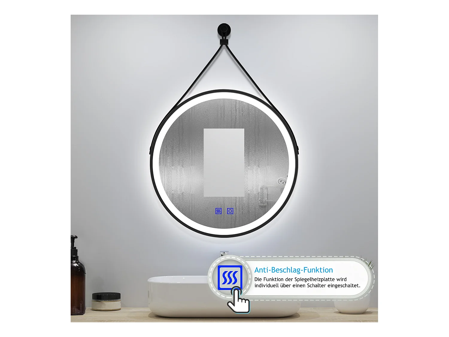 AICA Rund Badspiegel 70cm mit Schwarz Ledergürtel Touch/Wandschalter Beschlagfrei 3 Lichtfarbe+Dimmbar