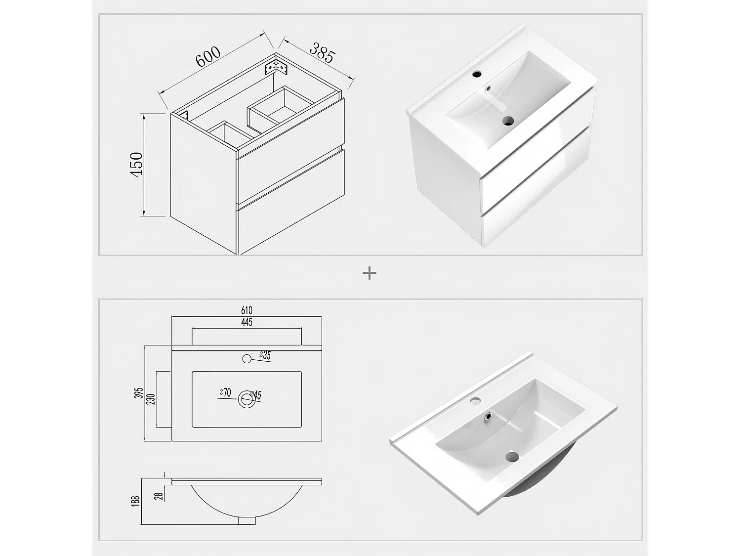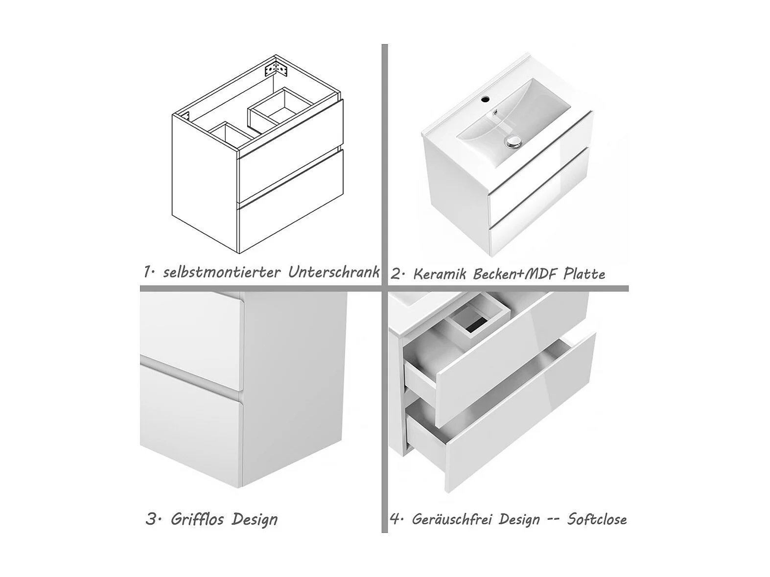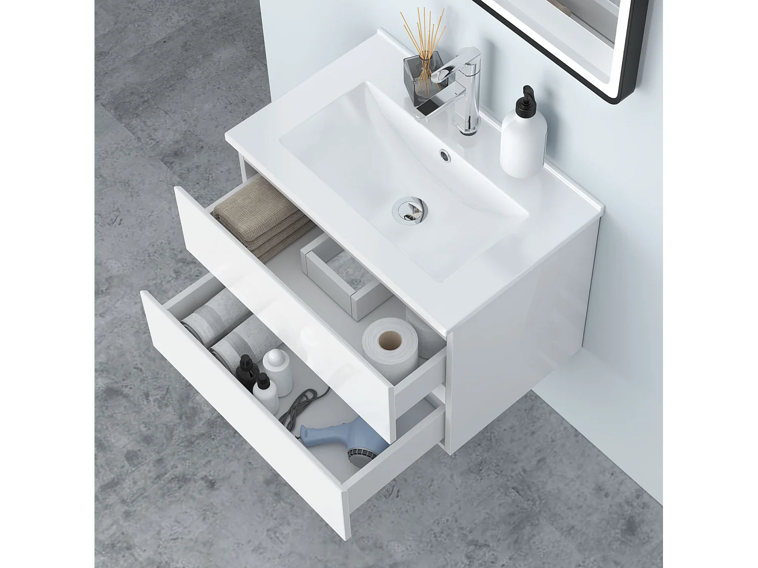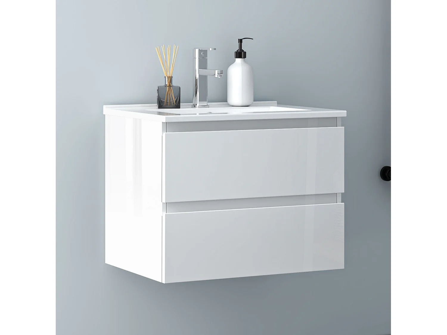 AICA Waschbeckenunterschrank 60cm Dünn Keramik Waschtisch mit Unterschrank - Hochglanz Weiß Hängeschrank - CINIC