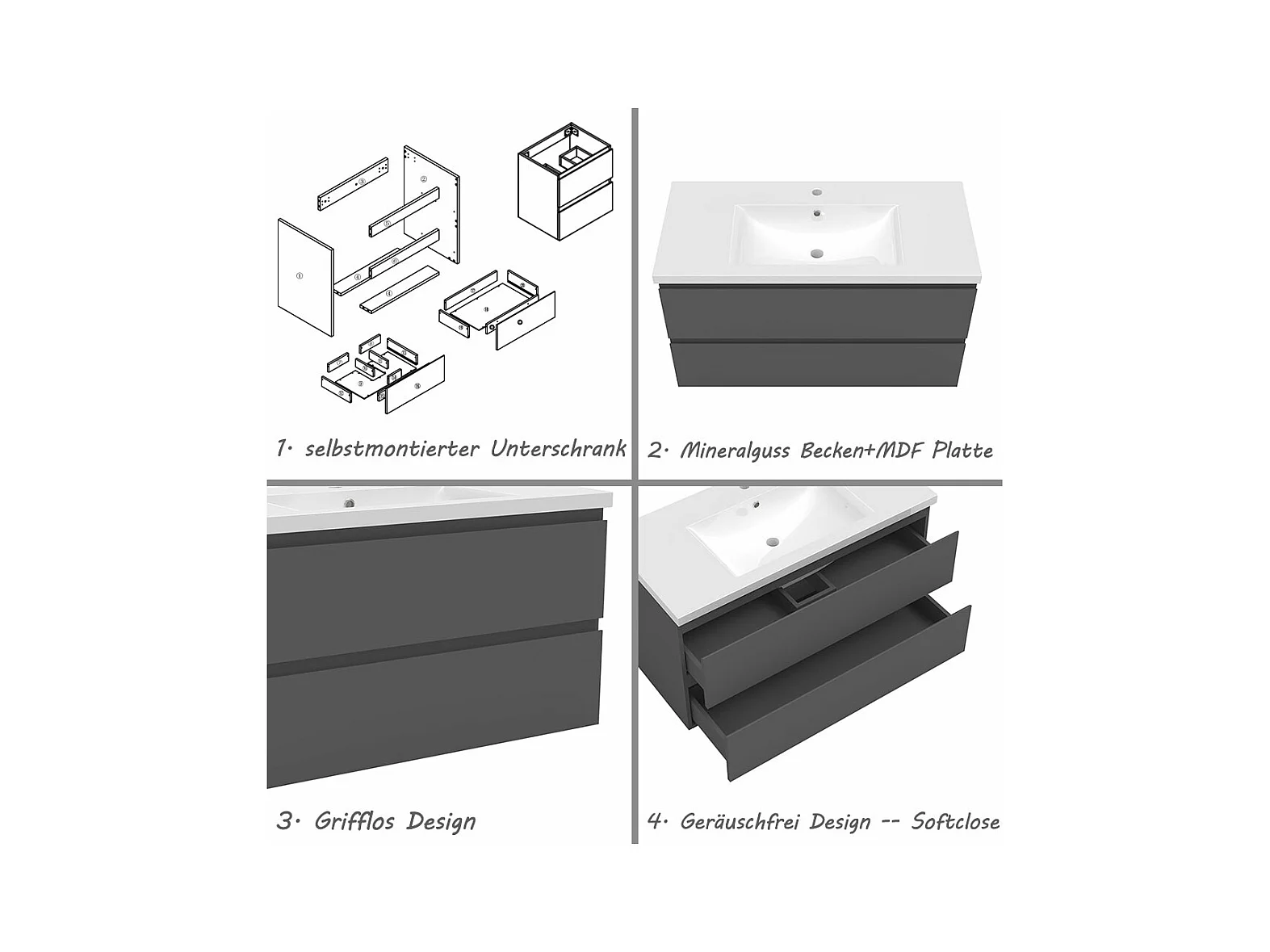 AICA Waschbeckenunterschrank hängend 100cm Mineralguss Waschtisch mit Unterschrank - Dunkelgrau Matt - CINIC