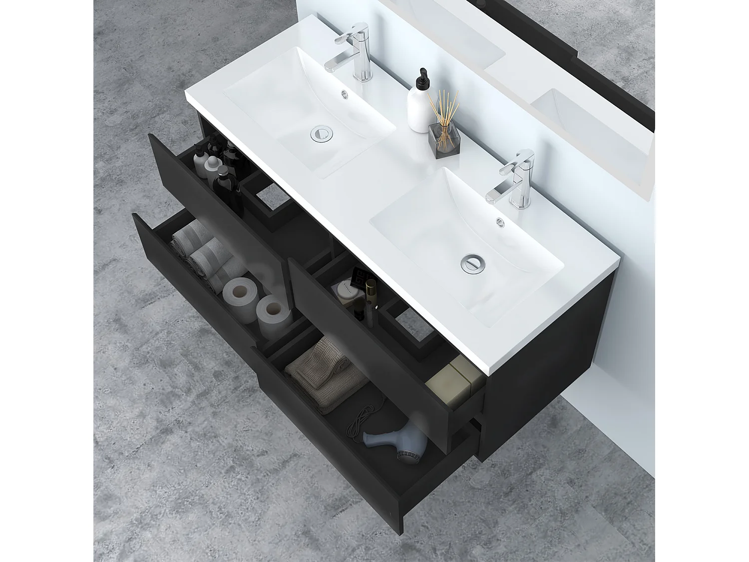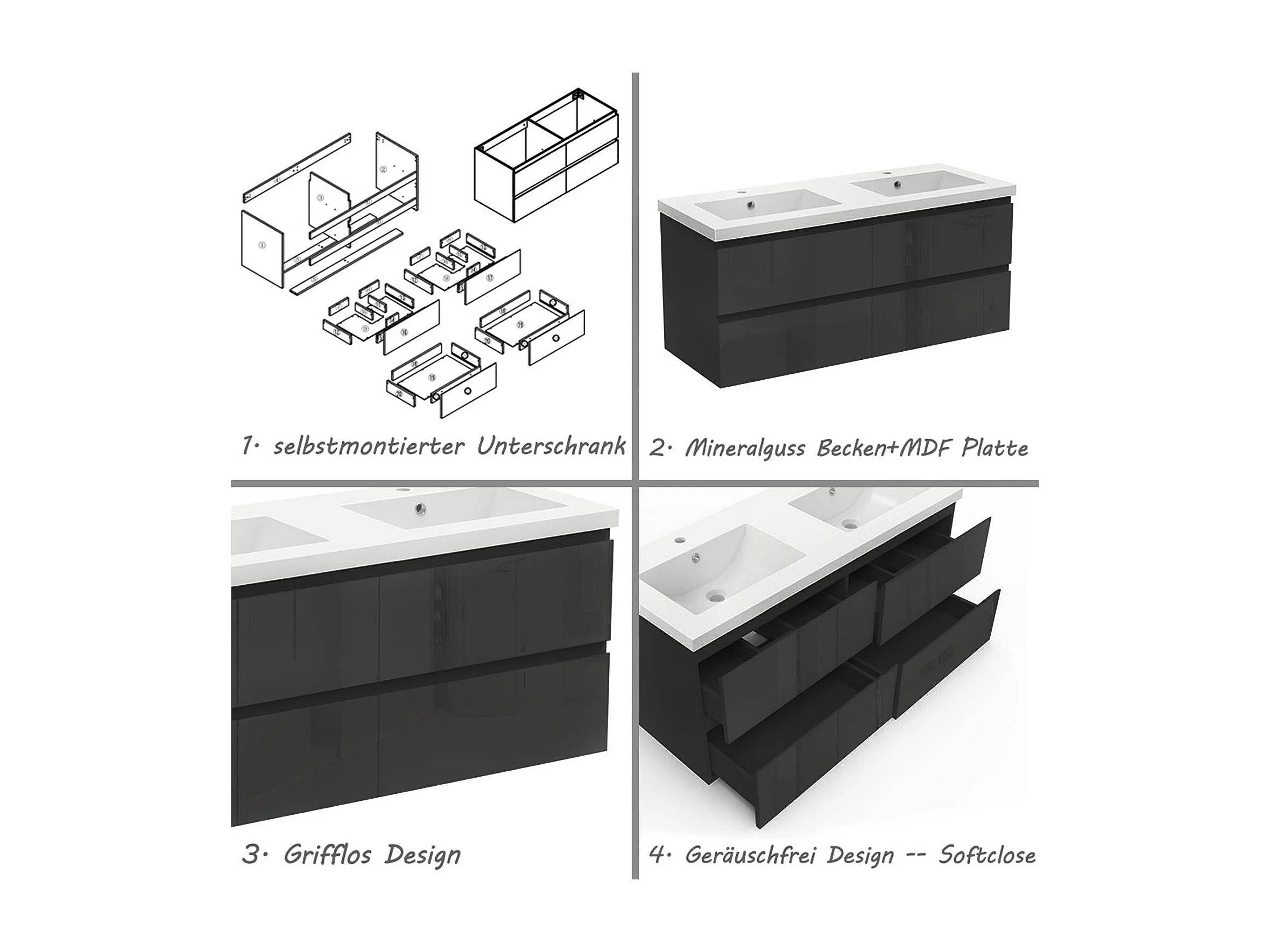 AICA Waschbeckenunterschrank hängend 120cm Mineralguss Einbauwaschbecken mit Unterschrank - Hochglanz Schwarz - CINIC