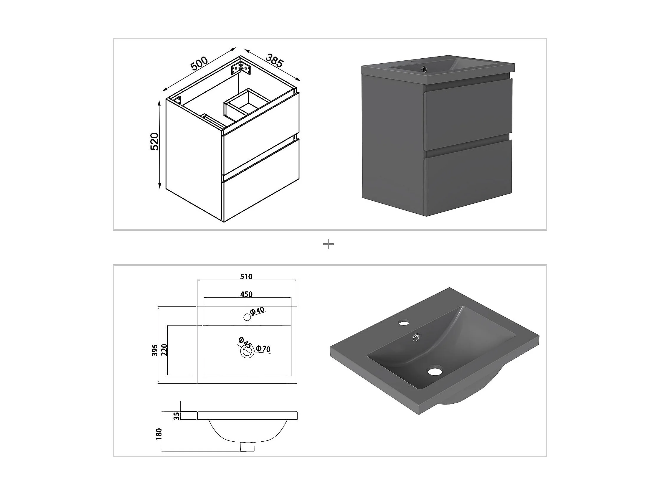AICA Waschbeckenunterschrank hängend 50cm Dunkelgrau Mineralguss-Waschbecken mit Unterschrank - Dunkelgrau Matt - CINIC