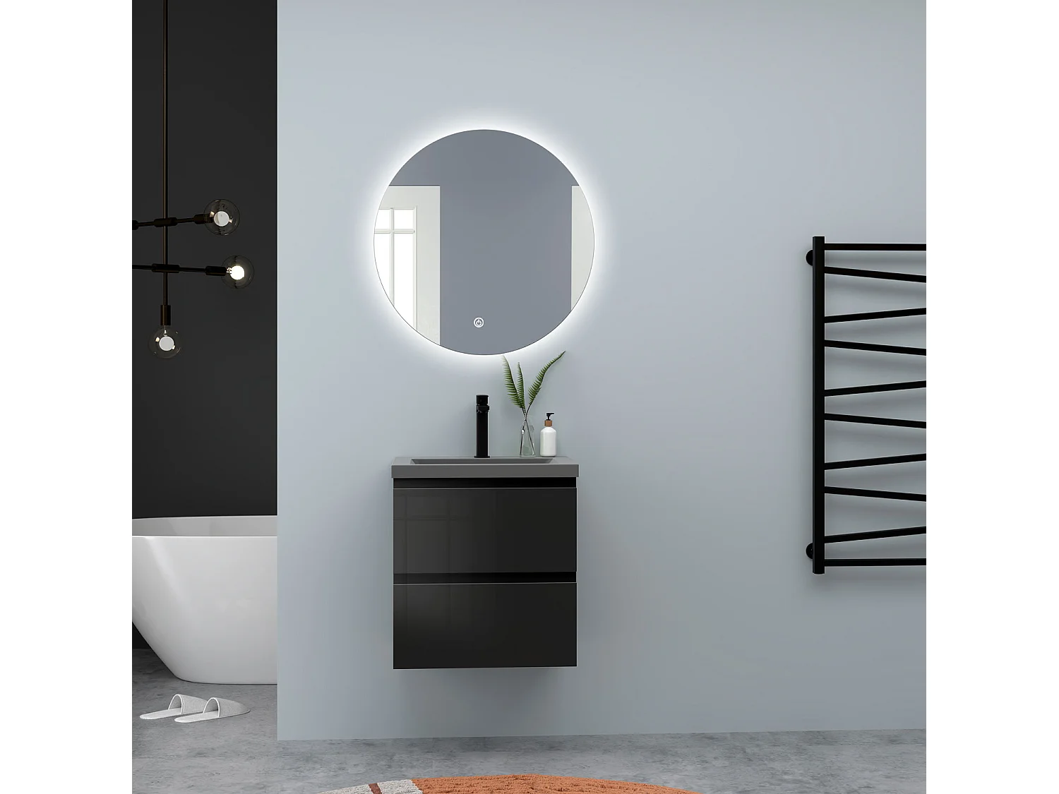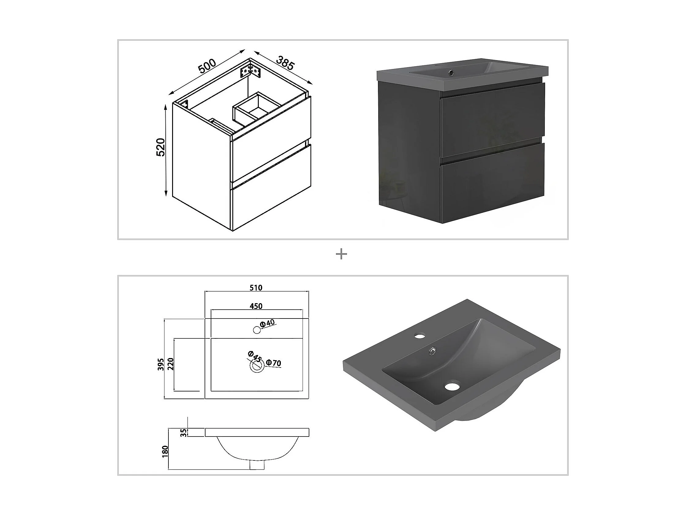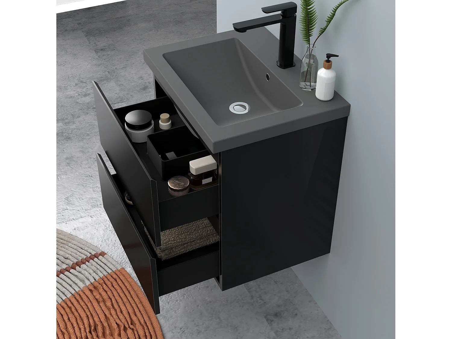 AICA Waschbeckenunterschrank hängend 50cm Dunkelgrau Mineralguss-Waschbecken mit Unterschrank - Hochglanz Schwarz - CINIC