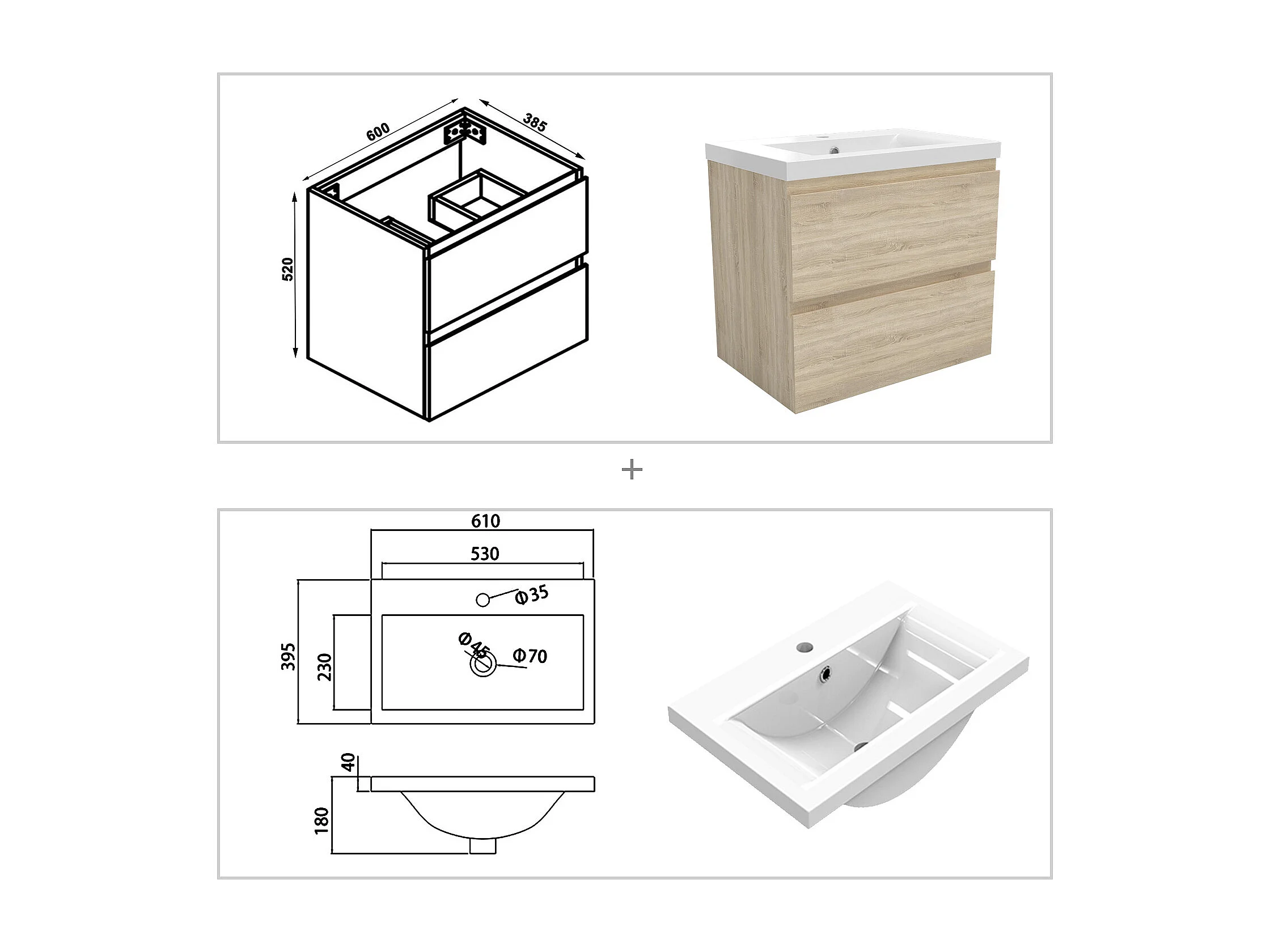 AICA Waschbeckenunterschrank hängend 60cm Dickes Keramik Waschtisch mit Unterschrank - Eiche Matt - CINIC