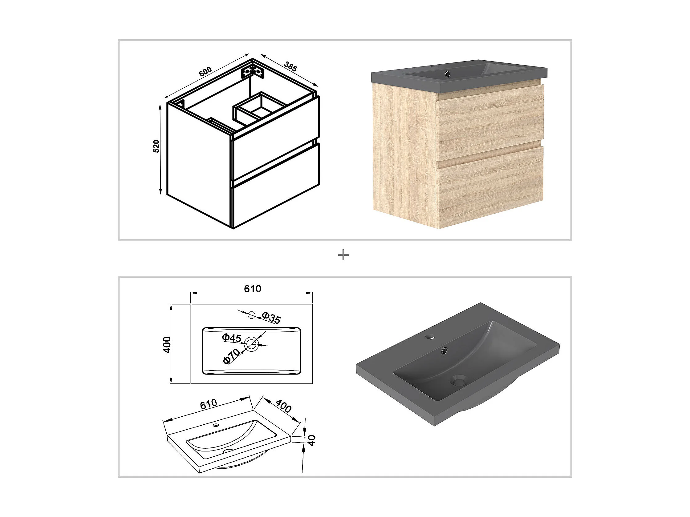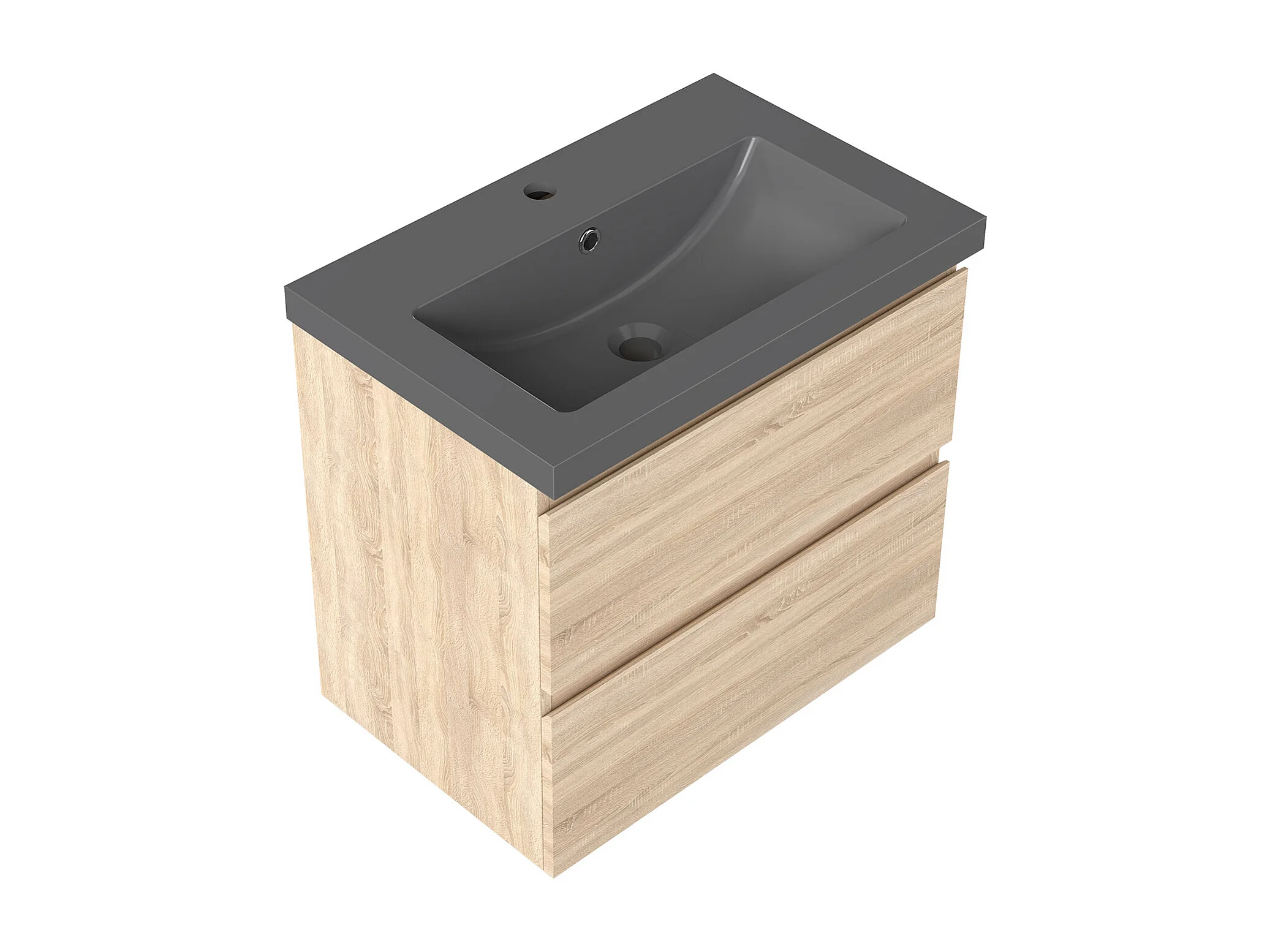 AICA Waschbeckenunterschrank hängend 60cm Dunkelgrau Mineralguss-Waschbecken mit Unterschrank - Eiche Matt - CINIC