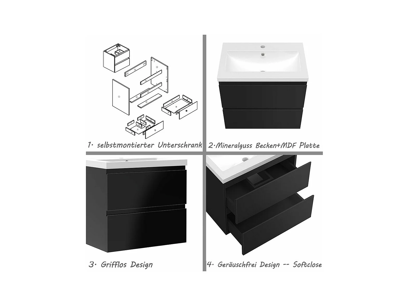AICA Waschbeckenunterschrank hängend 60cm Mineralguss Waschtisch mit Unterschrank - Hochglanz Schwarz - CINIC