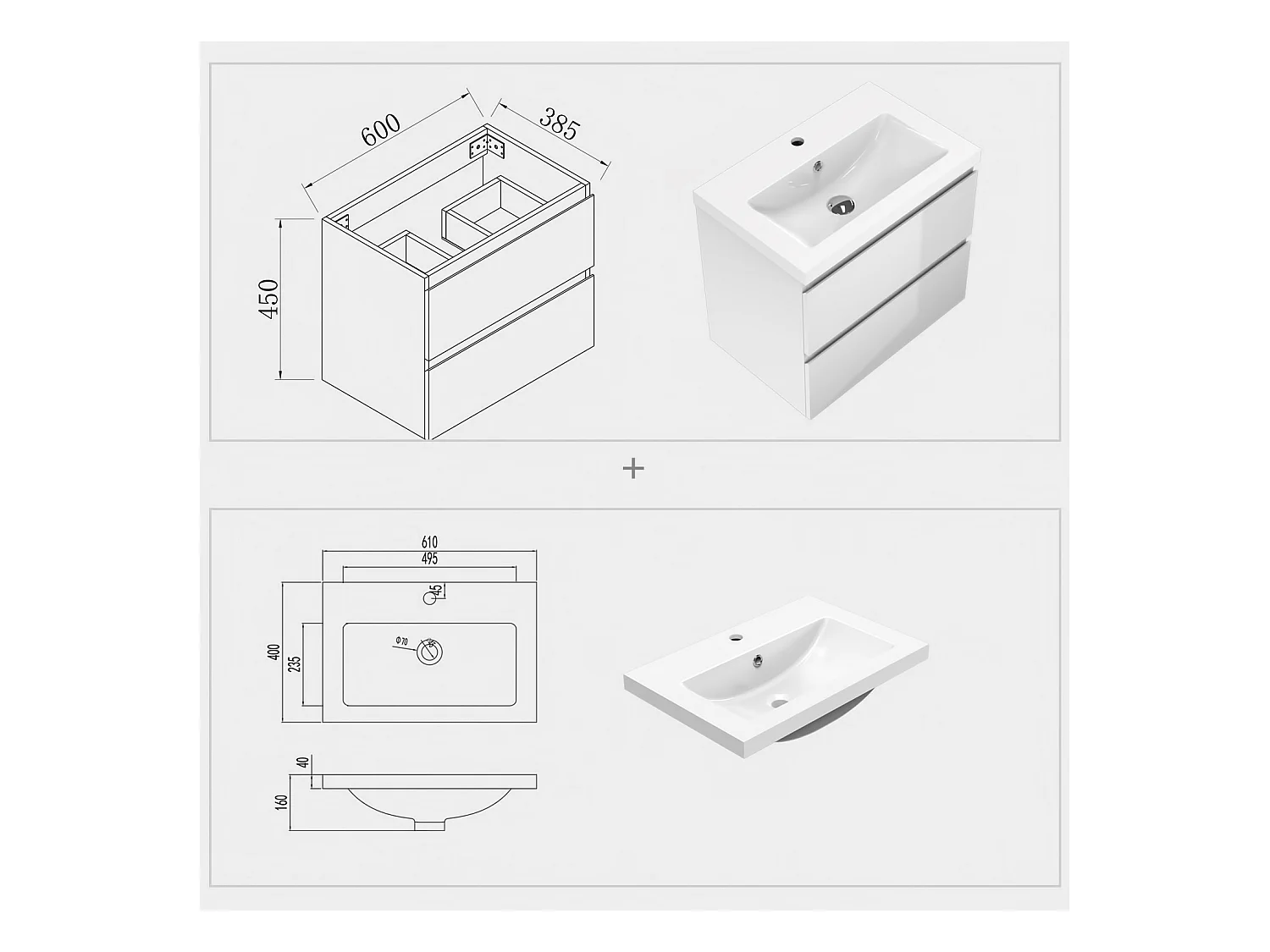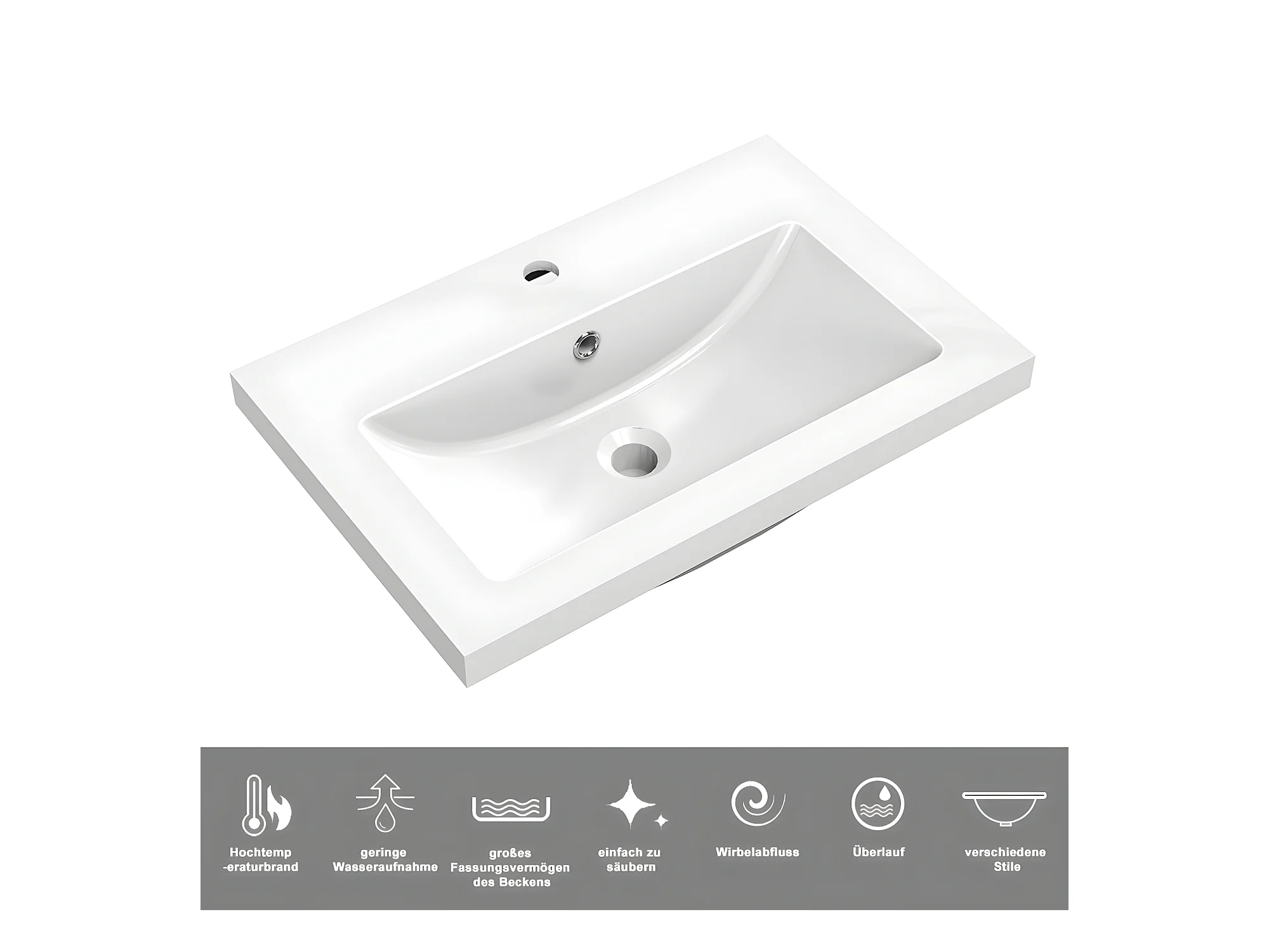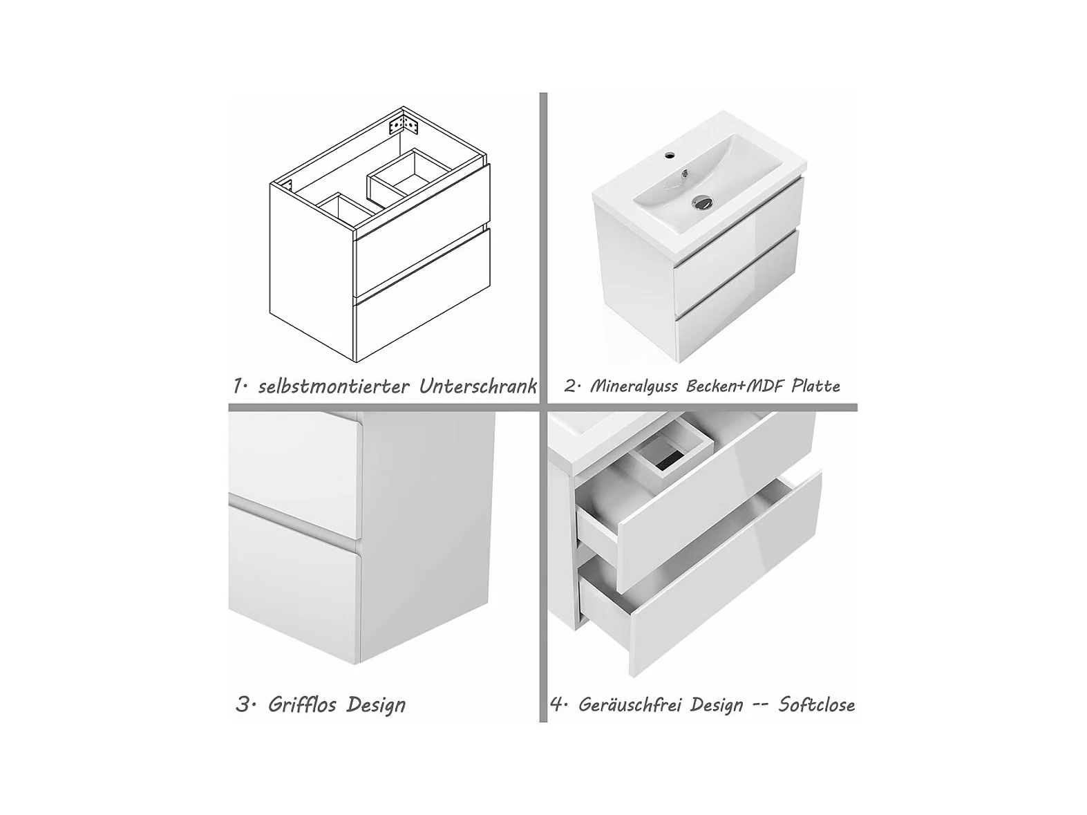 AICA Waschbeckenunterschrank hängend 60cm Mineralguss Waschtisch mit Unterschrank - Hochglanz Weiß - CINIC