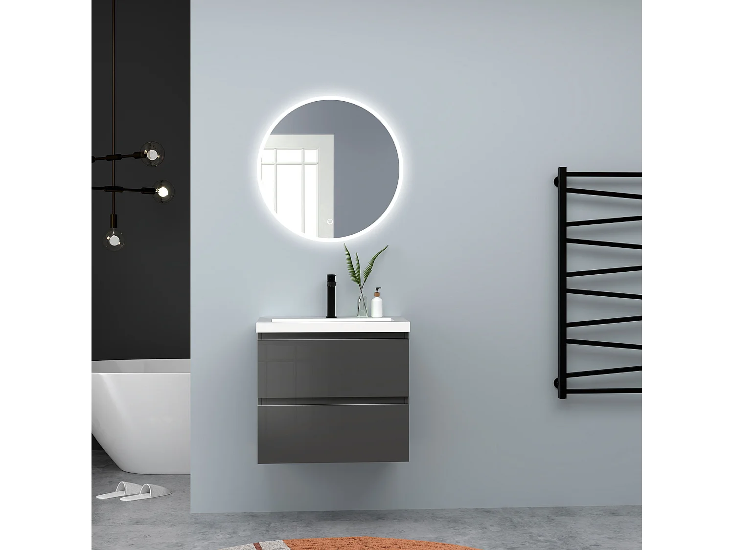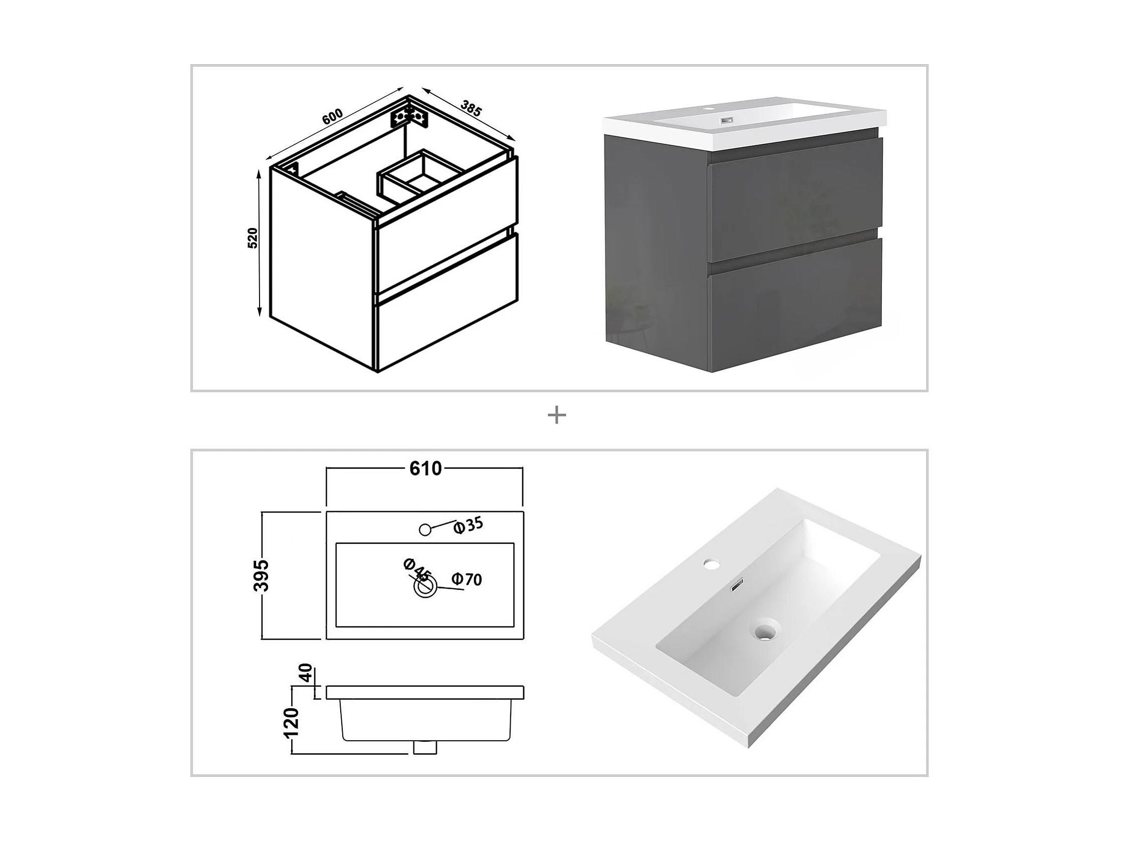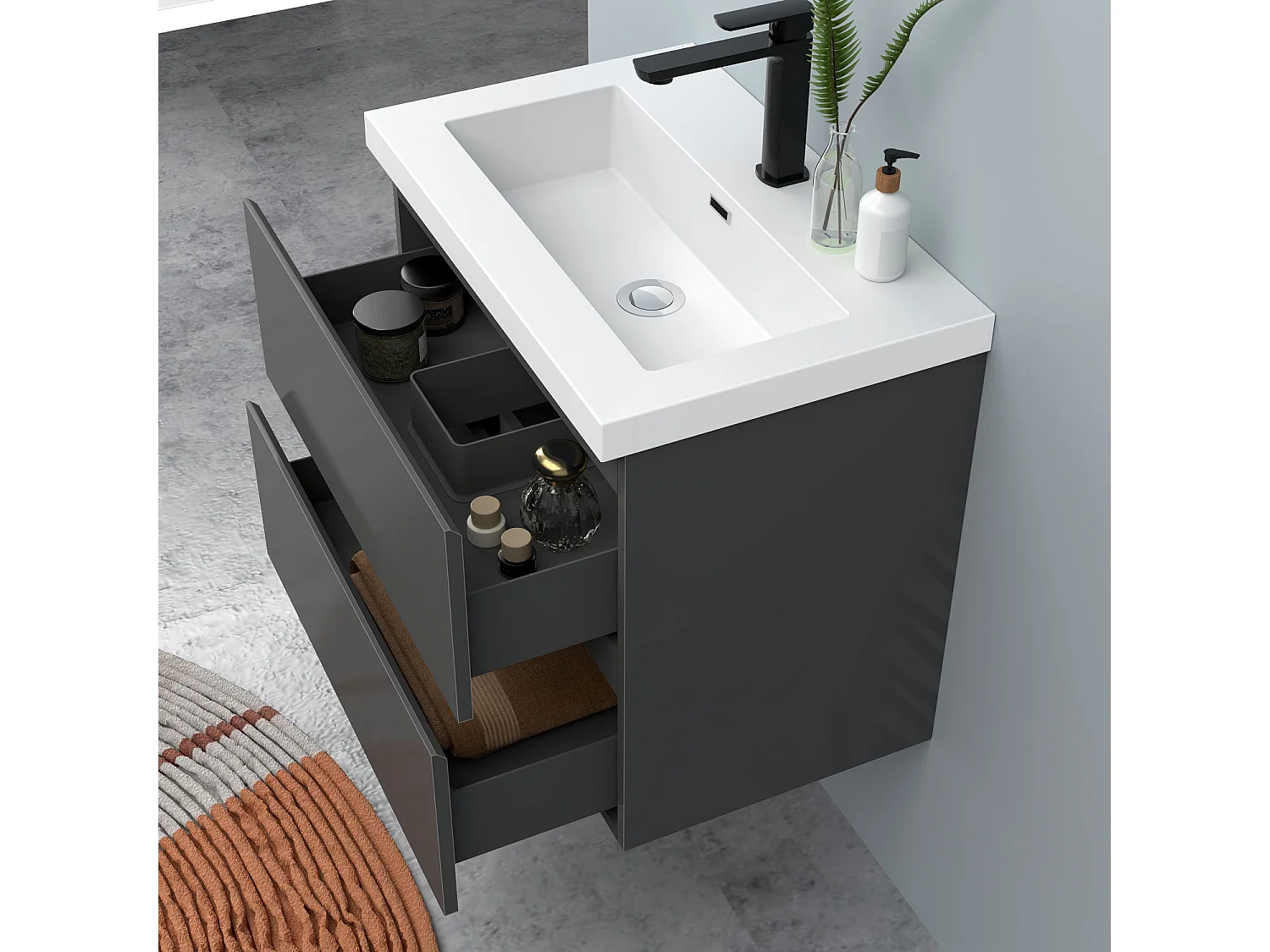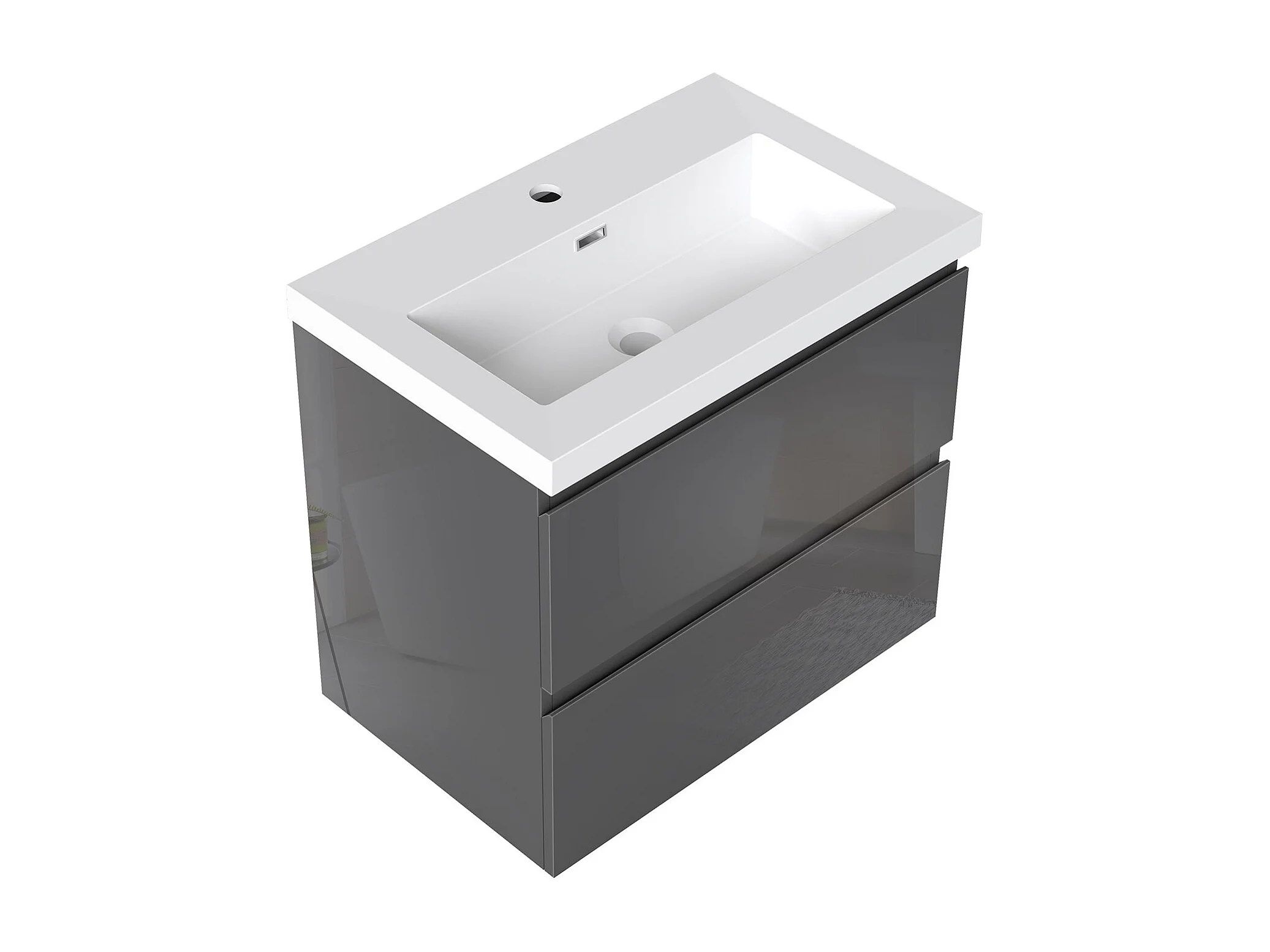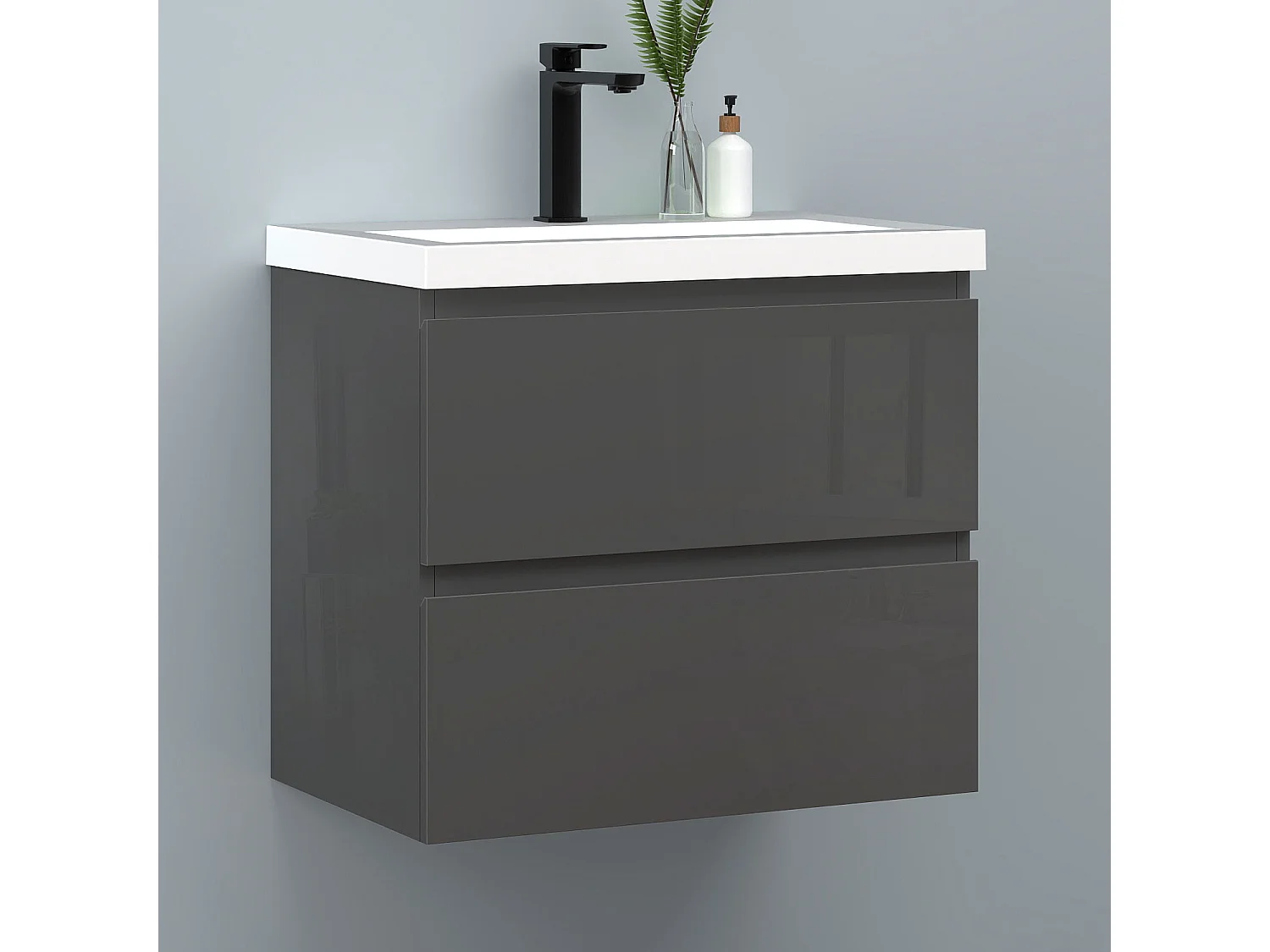 AICA Waschbeckenunterschrank hängend 60cm Rechteckiges Mineralguss-Waschbecken mit Unterschrank - Hochglanz Dunkelgrau - CINIC