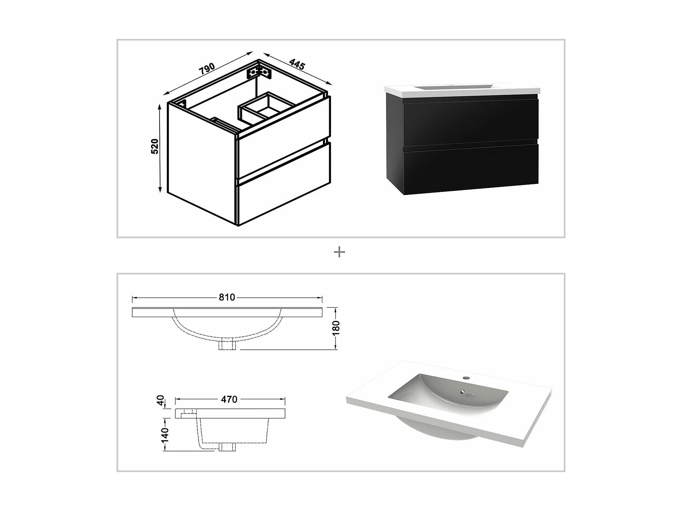 AICA Waschbeckenunterschrank hängend 80cm Mineralguss Waschtisch mit Unterschrank - Hochglanz Schwarz - CINIC