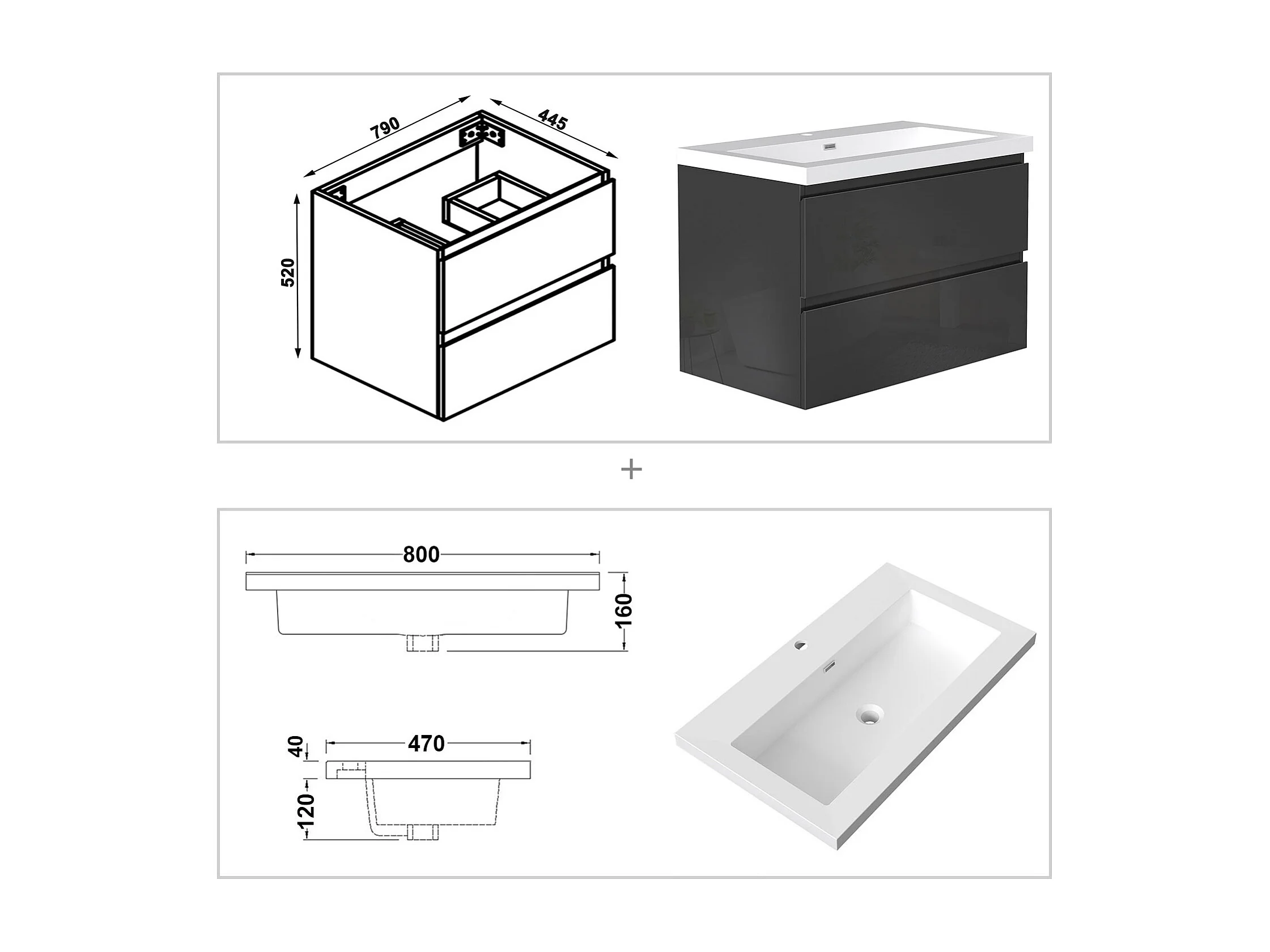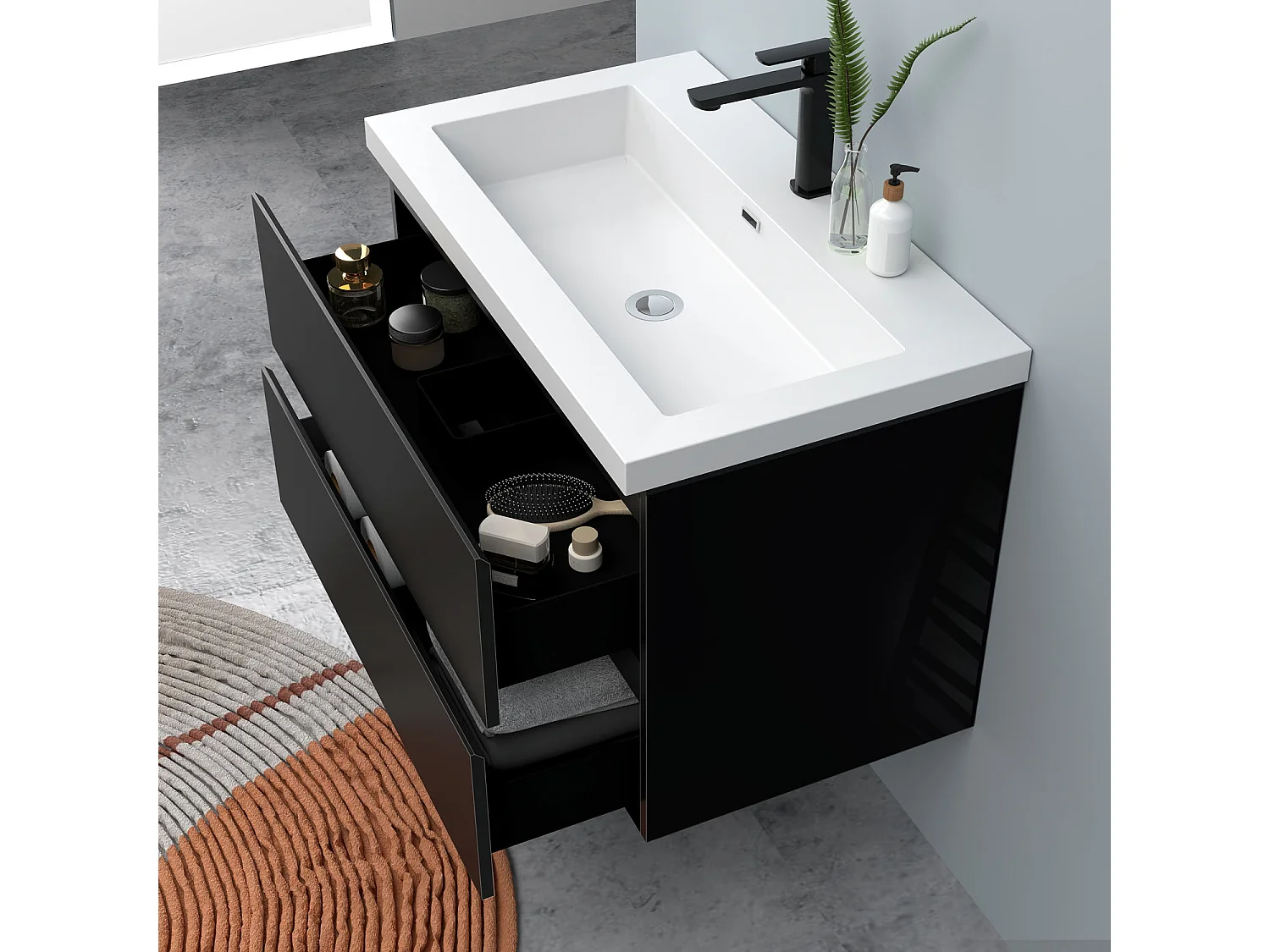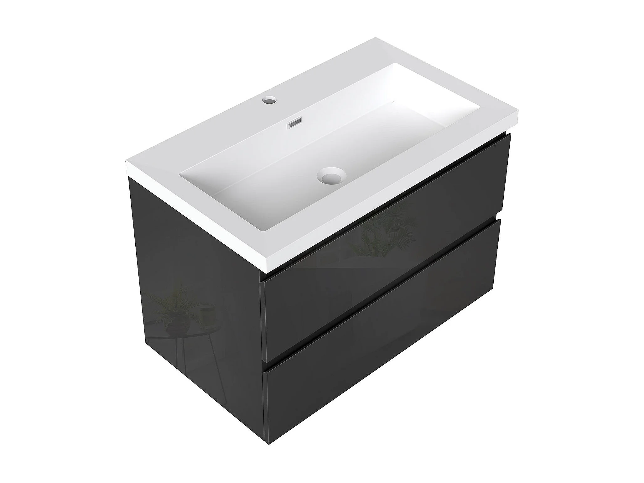 AICA Waschbeckenunterschrank hängend 80cm Rechteckiges Mineralguss-Waschbecken mit Unterschrank - Hochglanz Schwarz - CINIC