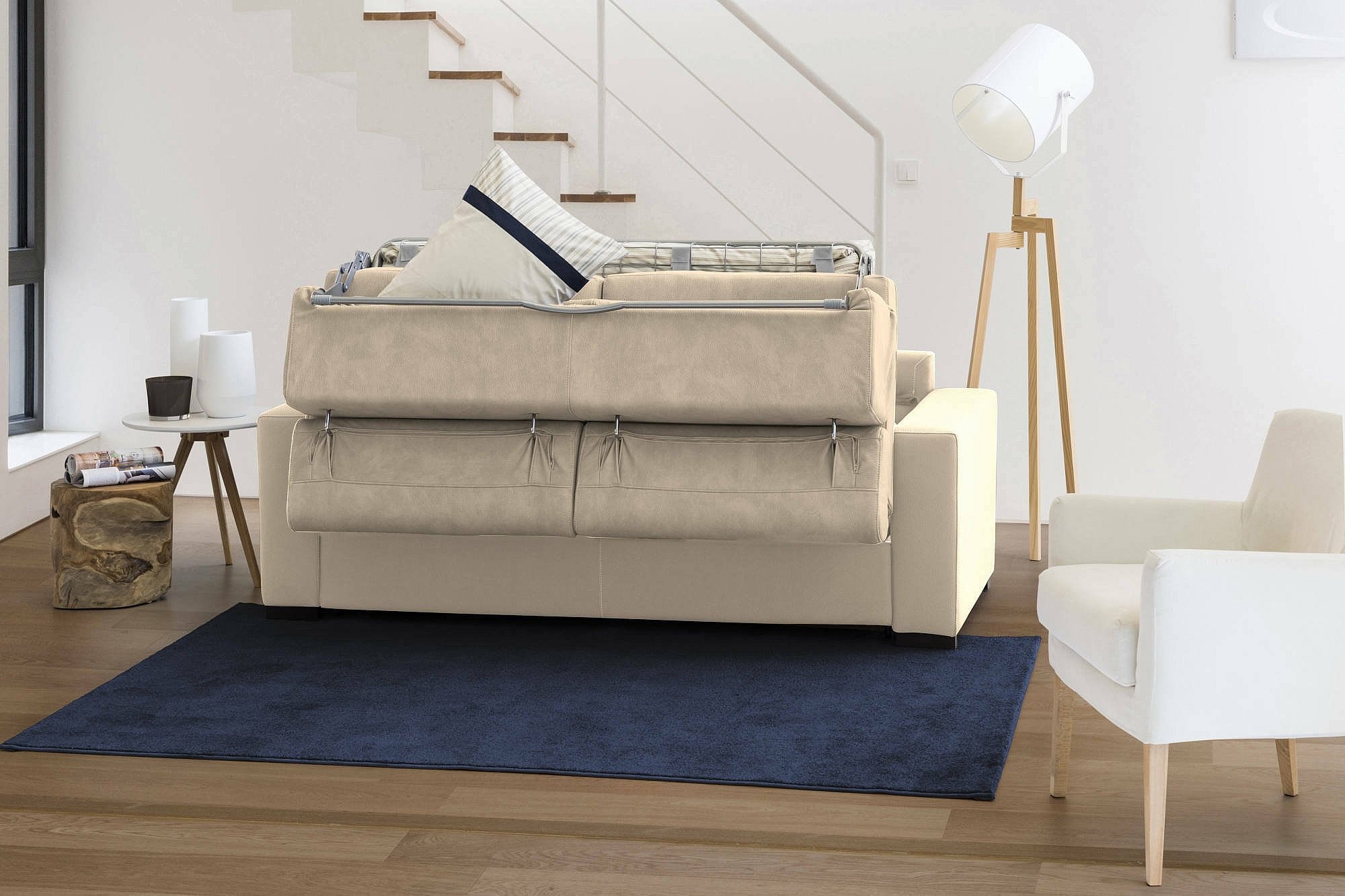 Aleandra Schlafsofa, Ecksofa, 100 % Made in Italy, Sofa mit drehbarer Öffnung, mit linker Stauraumhalbinsel, mit schmalen Armlehnen, 260 x 95 x 85 cm, Beige