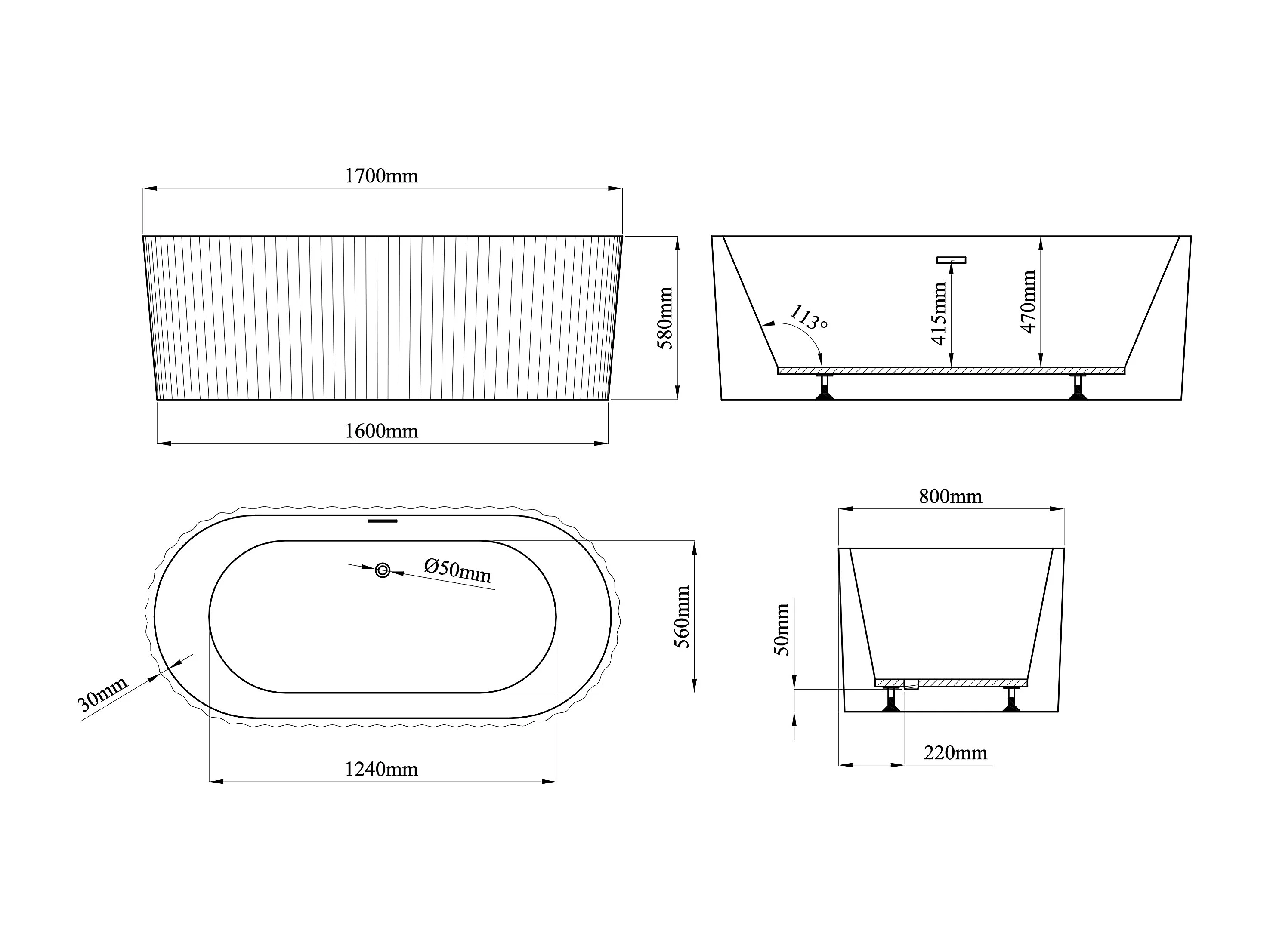 Freistehende Badewanne - gerippt - Acryl - Schwarz matt - 230 L - 170 x 80 x 58 cm - ALIENA