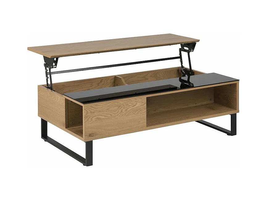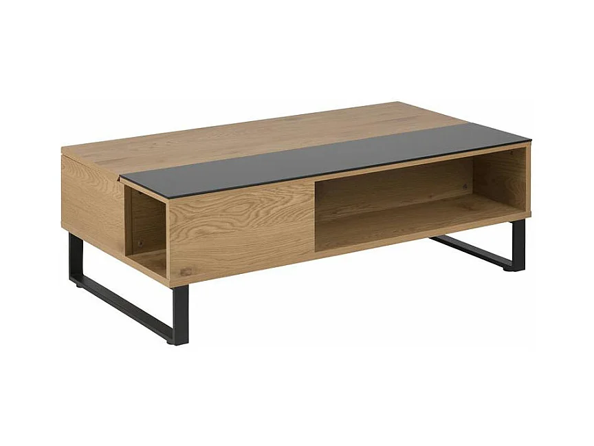 Allan Couchtisch mit Hebe/Senkefunktion und Aufbewahrung in Eiche Furnier und schwarzen Glas.