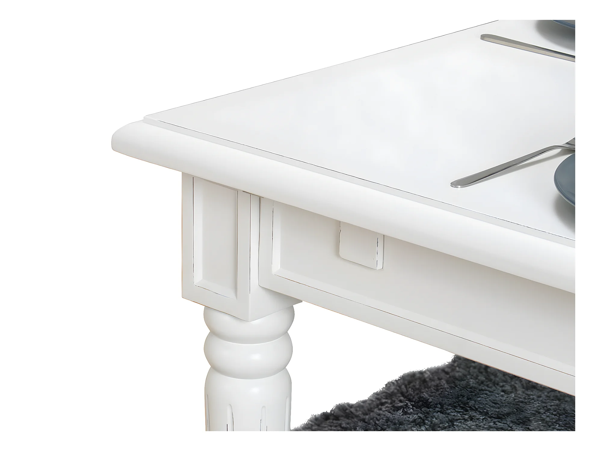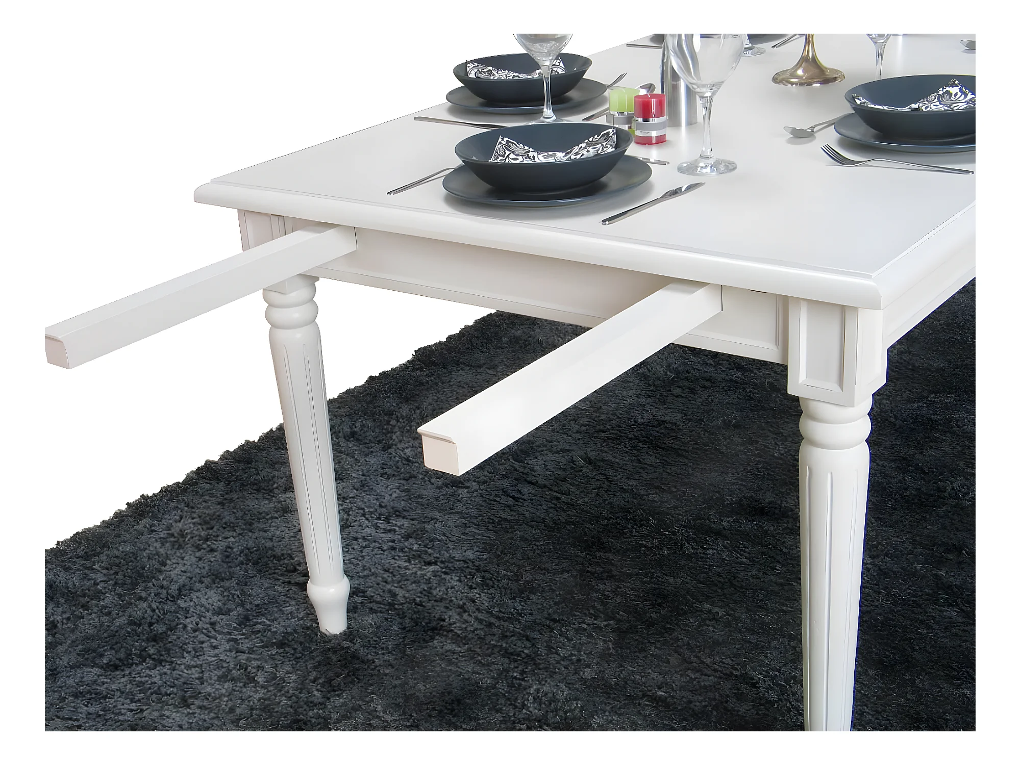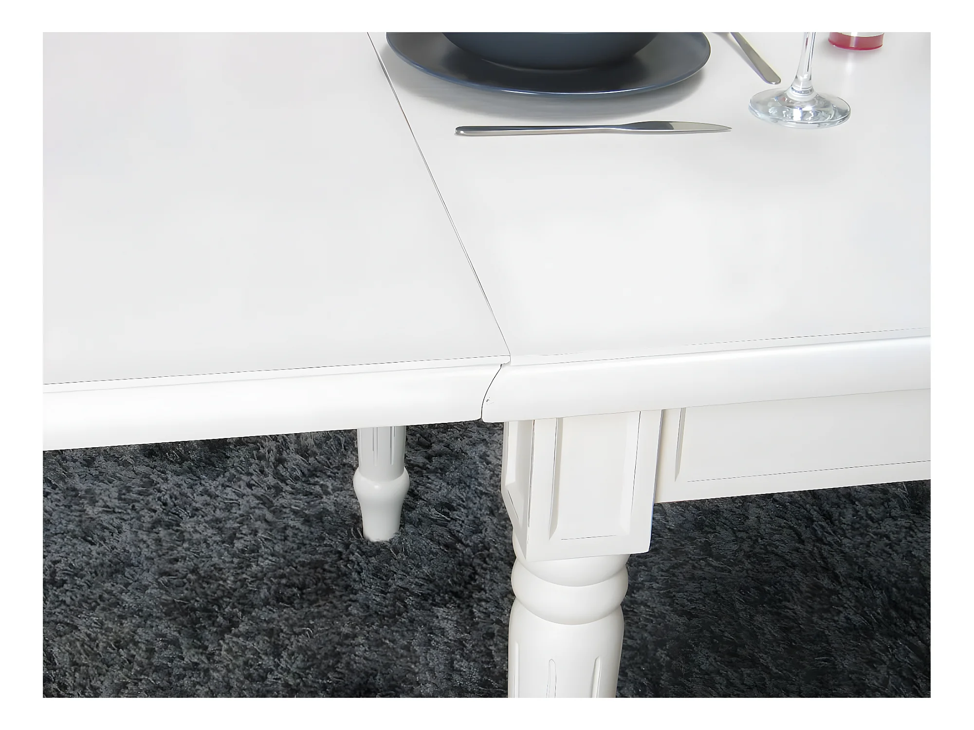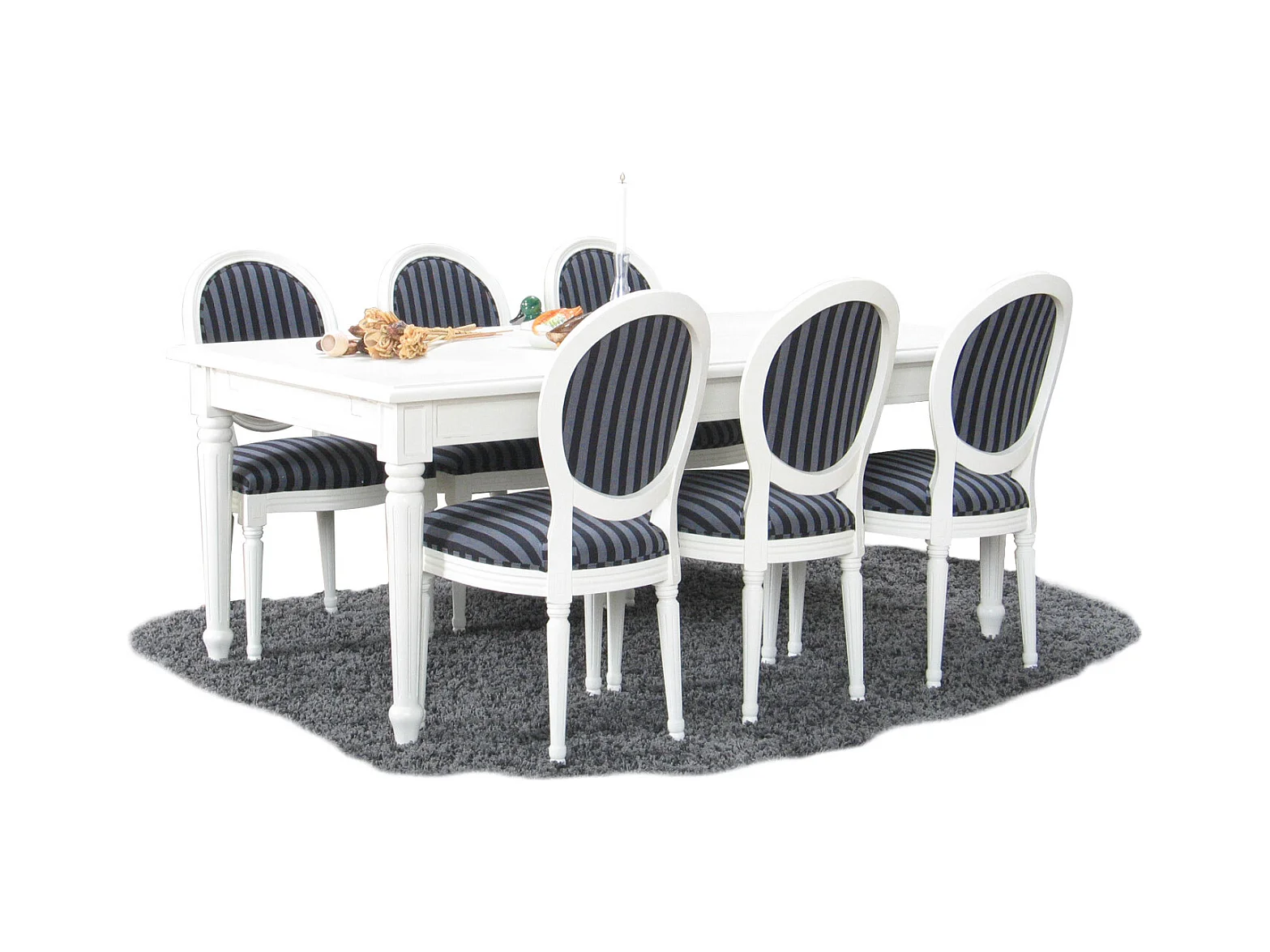Amaretta Essgruppe100x180/280 einschl. 2 Zusatzplatten antik weiß mit 6 Rokoko Stühlen antik weiß/schwarz.