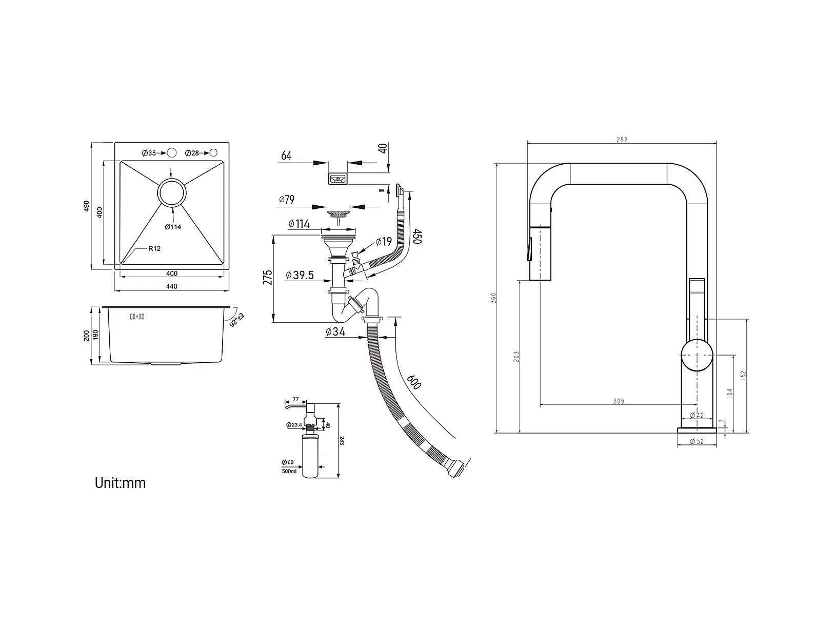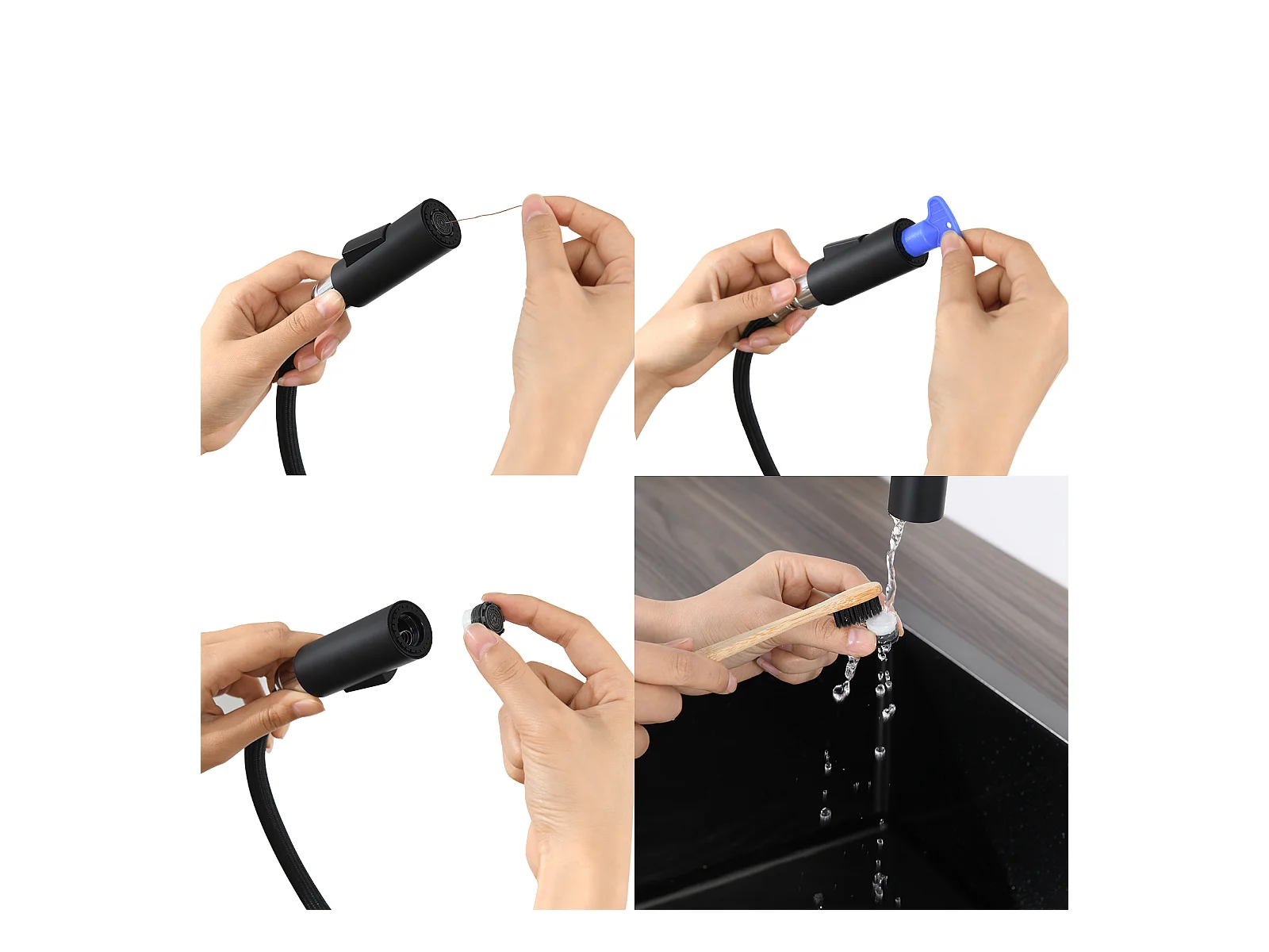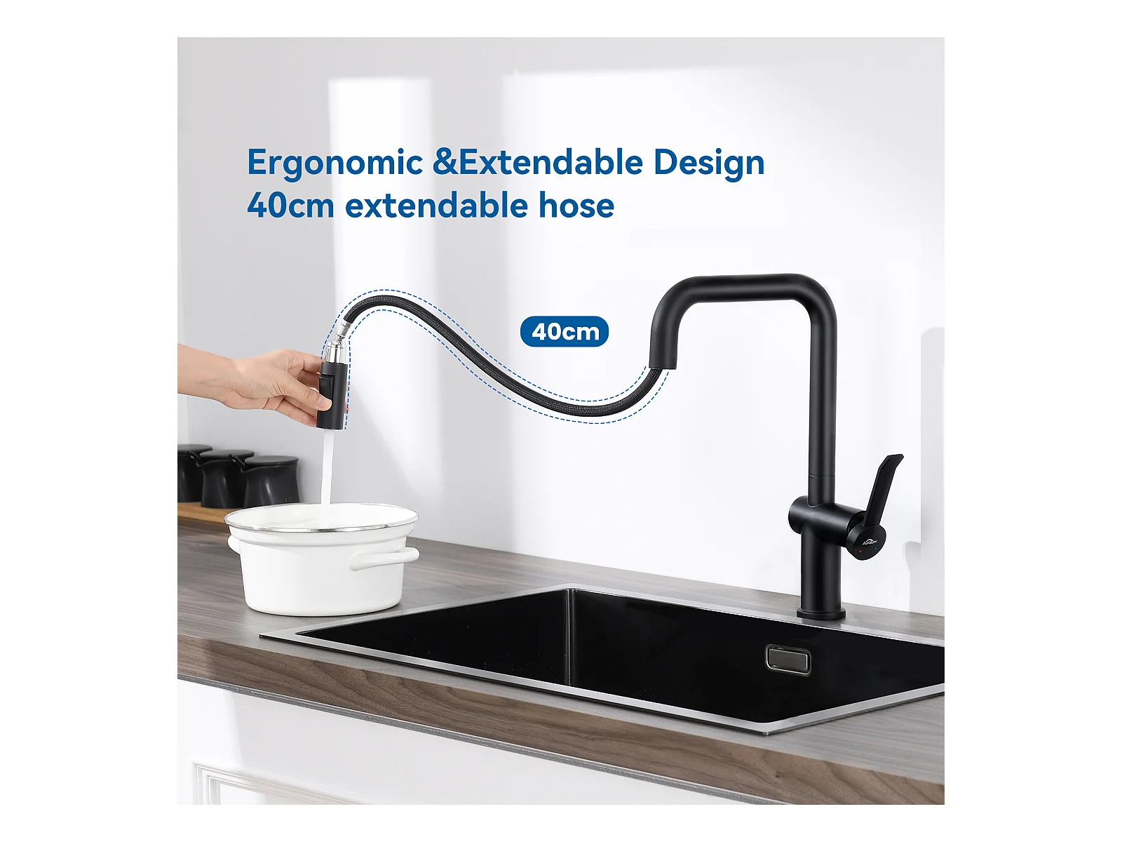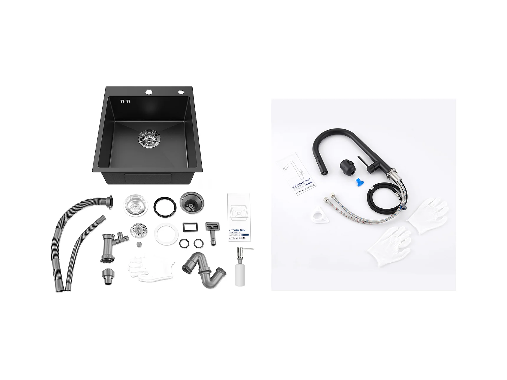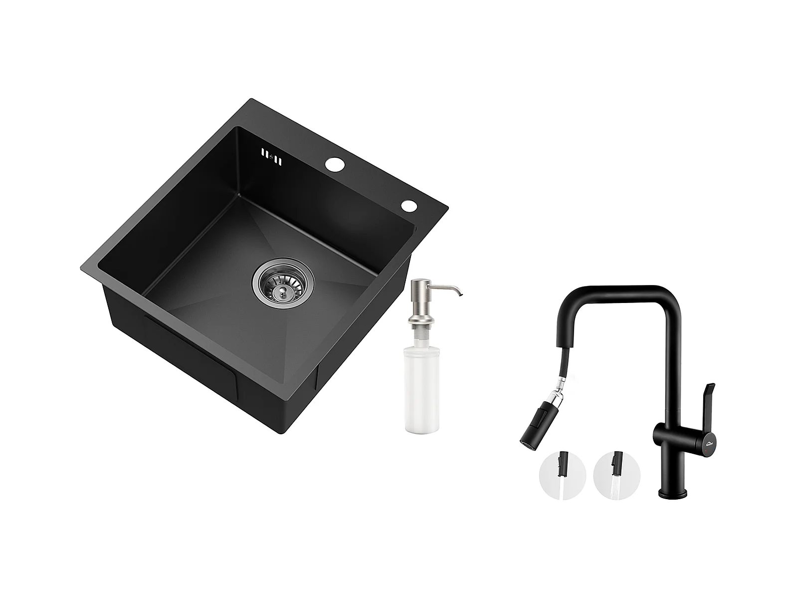 AuraLum Max Einzelbecken-Küchenspüle Grau-Schwarz, Edelstahl, 44*49*20 CM, mit Seifenspender + ausziehbarer Zweifunktions-Küchenarmatur, Schwarz, EU-Modell