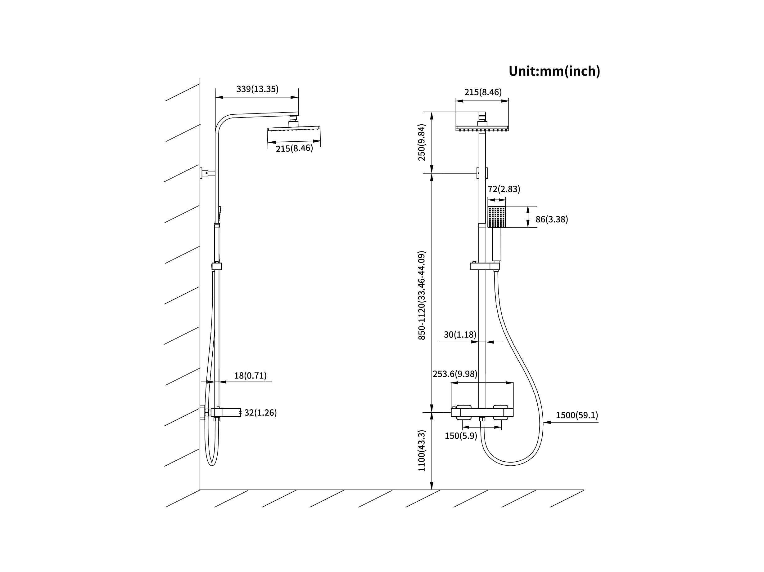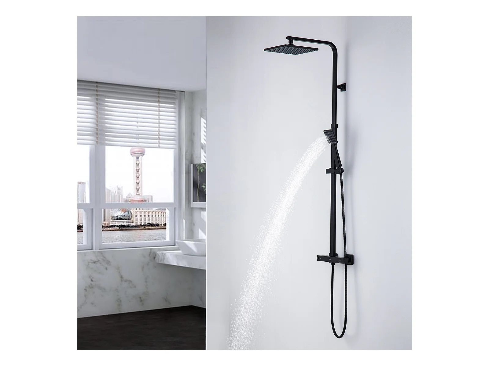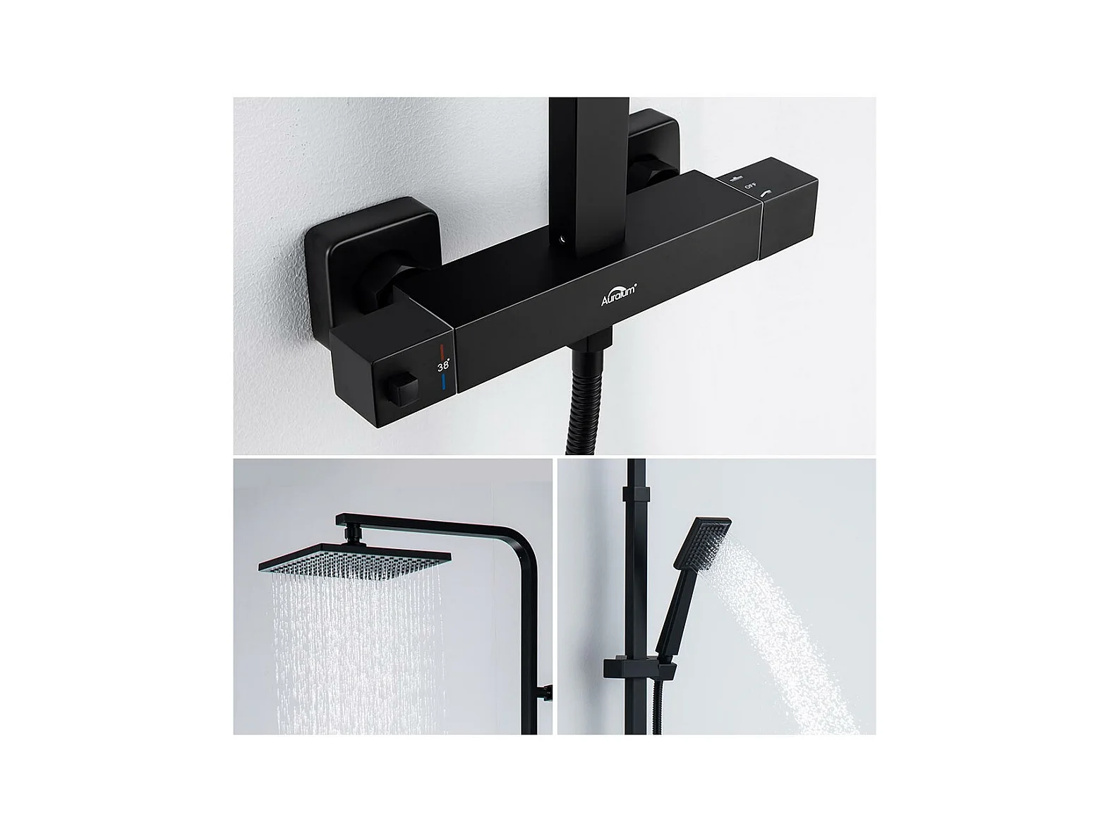 AURALUM MAX Schwarze Thermostat-Duschsäule, 21,5 cm quadratischer Duschkopf, höhenverstellbares Duschset, mit Messing-Thermostatmischer