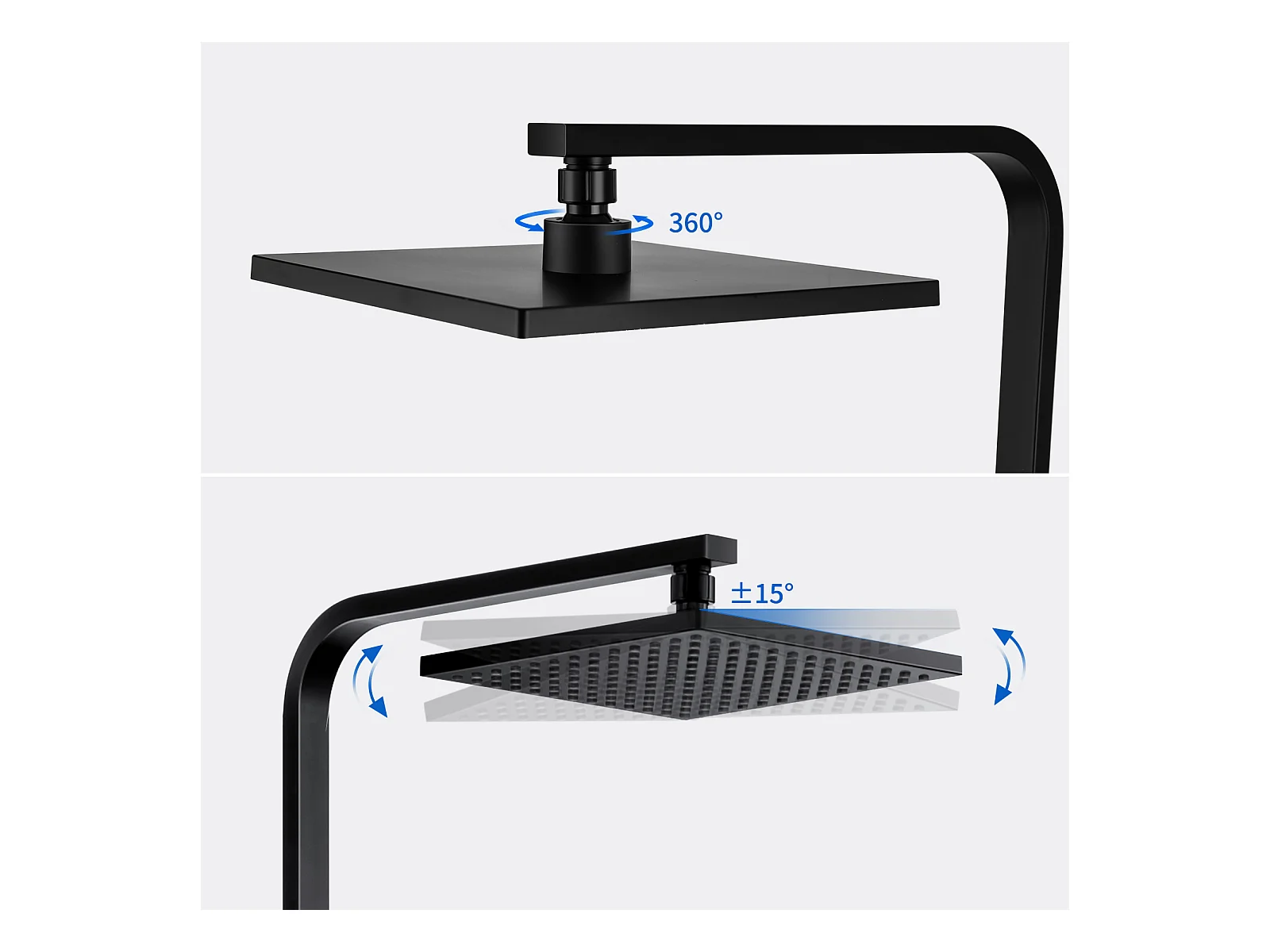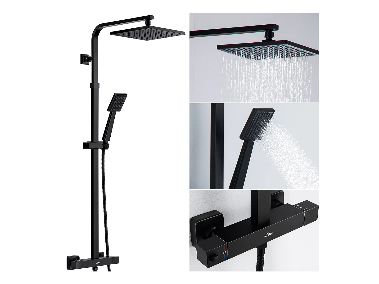 Auralummax Thermostat-Duschsäule schwarz, höhenverstellbar, mit Mischbatterie + Bad-Zubehör-Set 6-teilig, selbstklebend/bohren, Edelstahl, schwarz