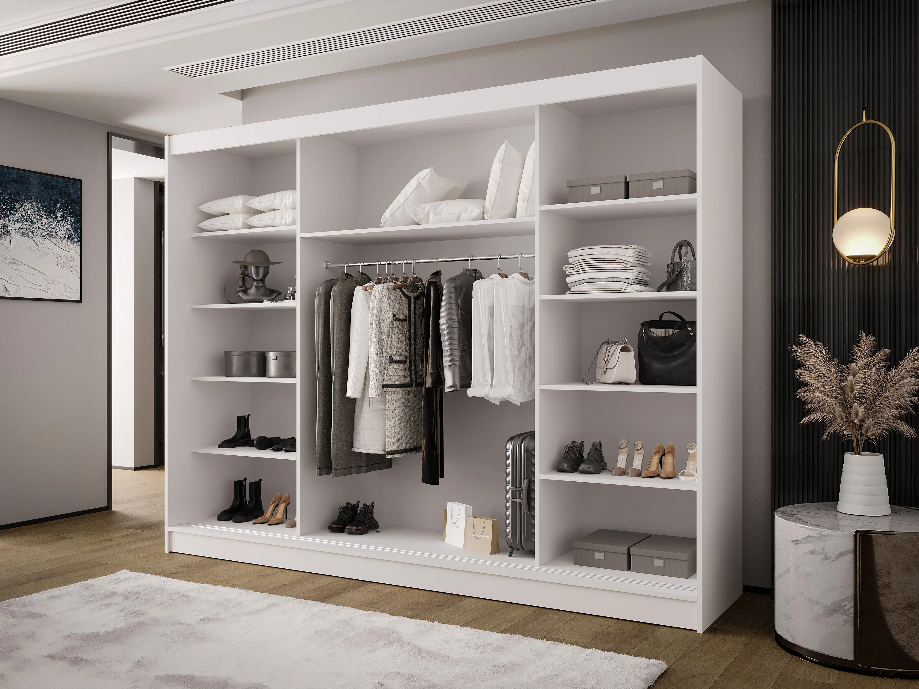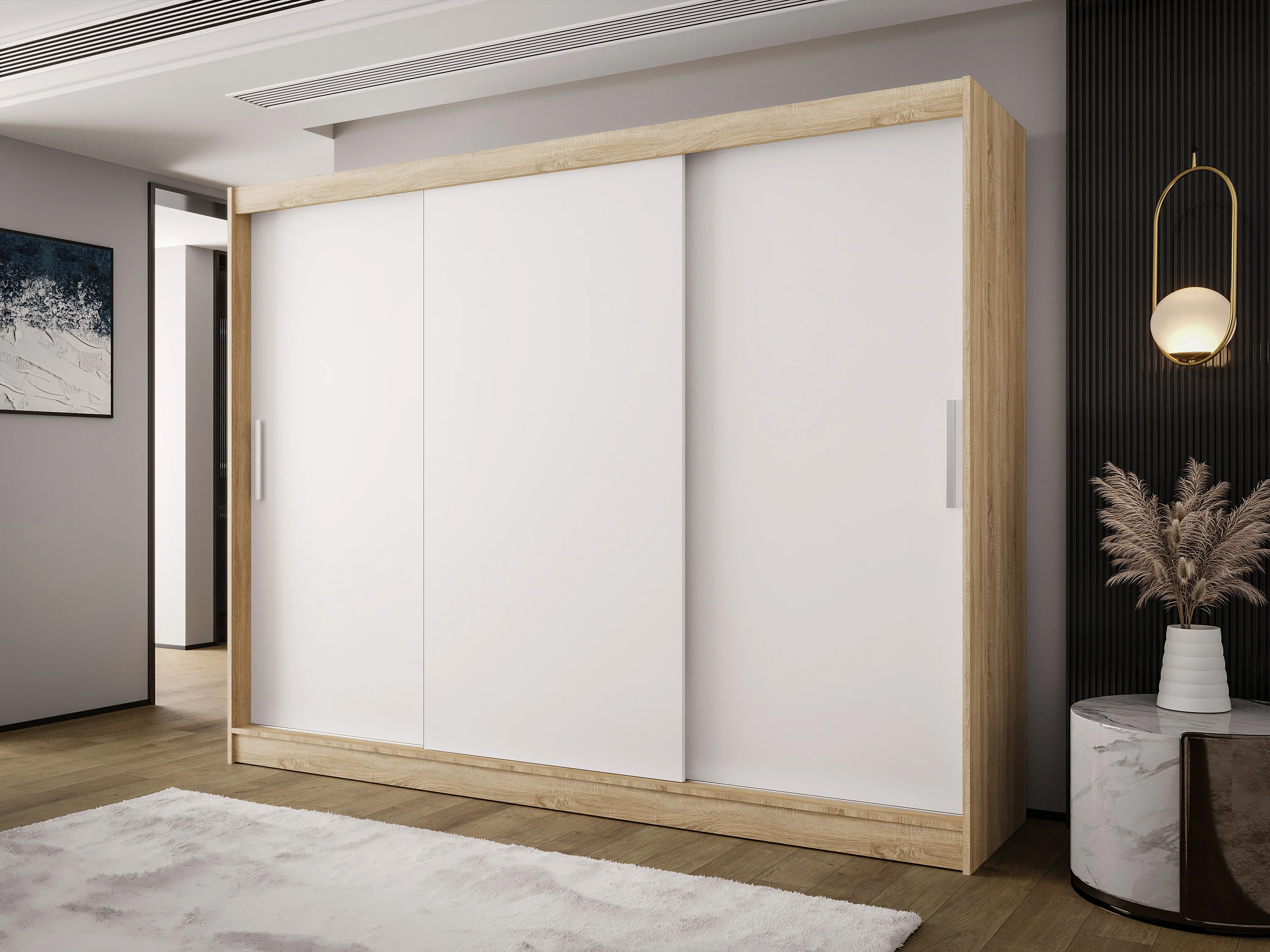 AUSTIN A2 Dreitüriger Schrank mit Schiebetüren, TOP PRODUKT 250cm Garderobe mit Kleiderstange/Regalböden, Verschieden Farben, Möbel vom Hersteller (Sonoma/Biały)
