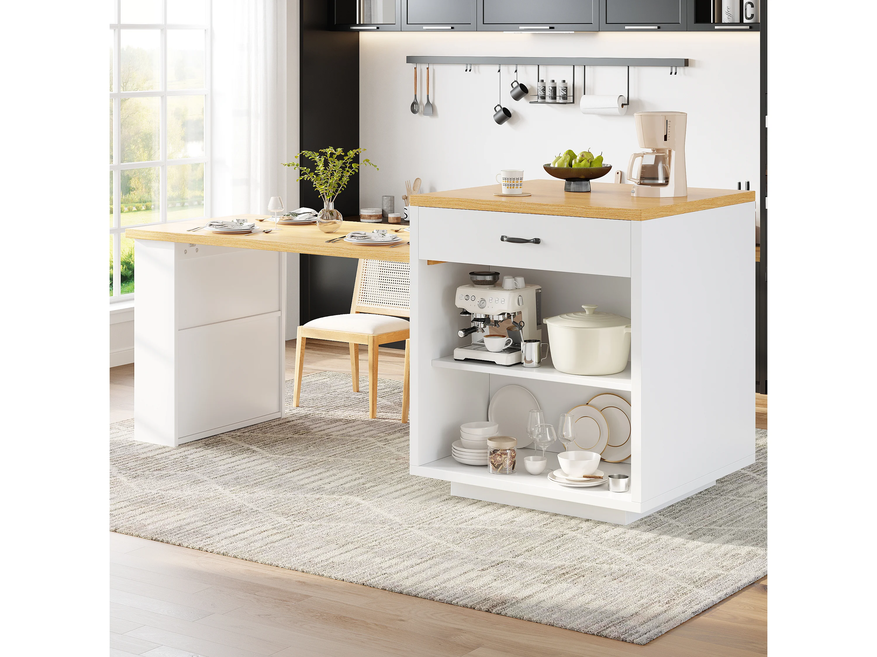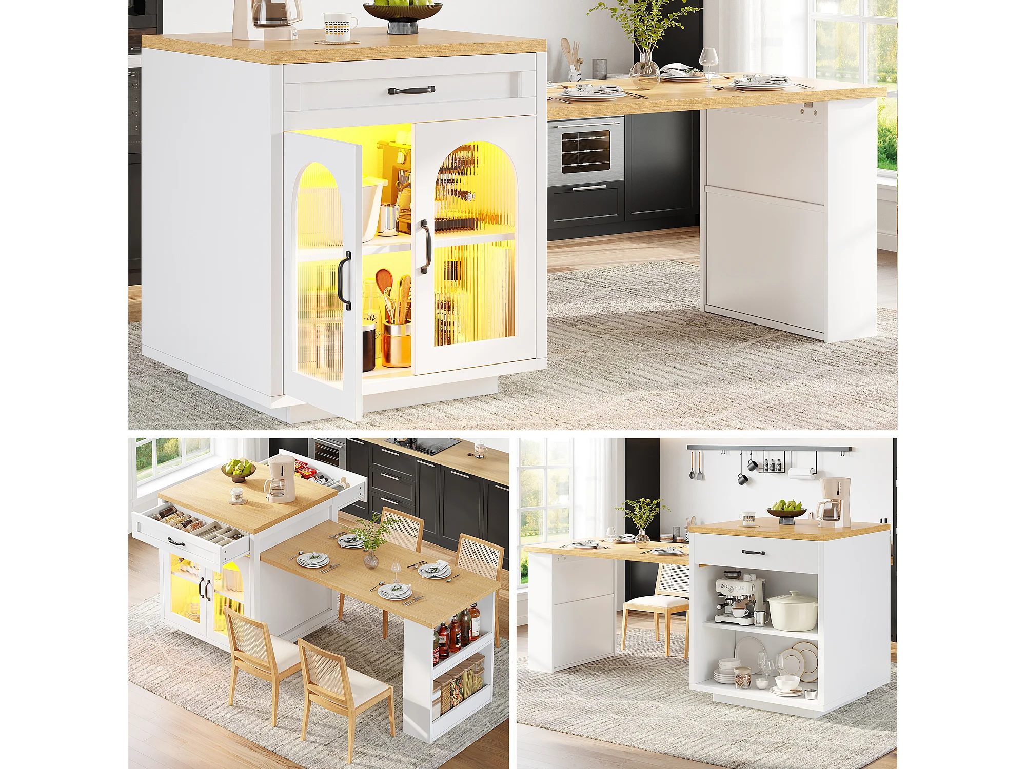 Ausziehbare Kücheninsel – 126–196 x 59 x 94 cm – mit LED-Beleuchtung, 2 Schubladen, Regalböden und Glastüren – MDF – weiß