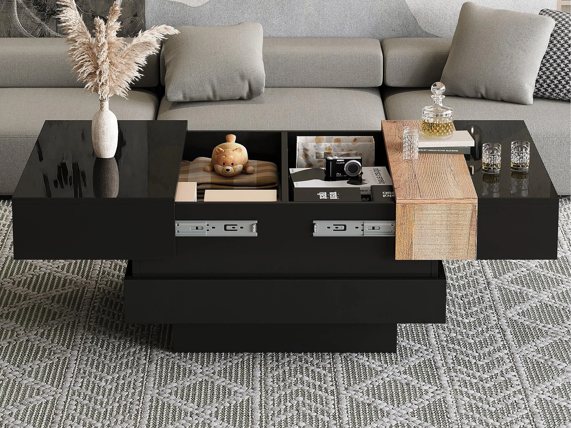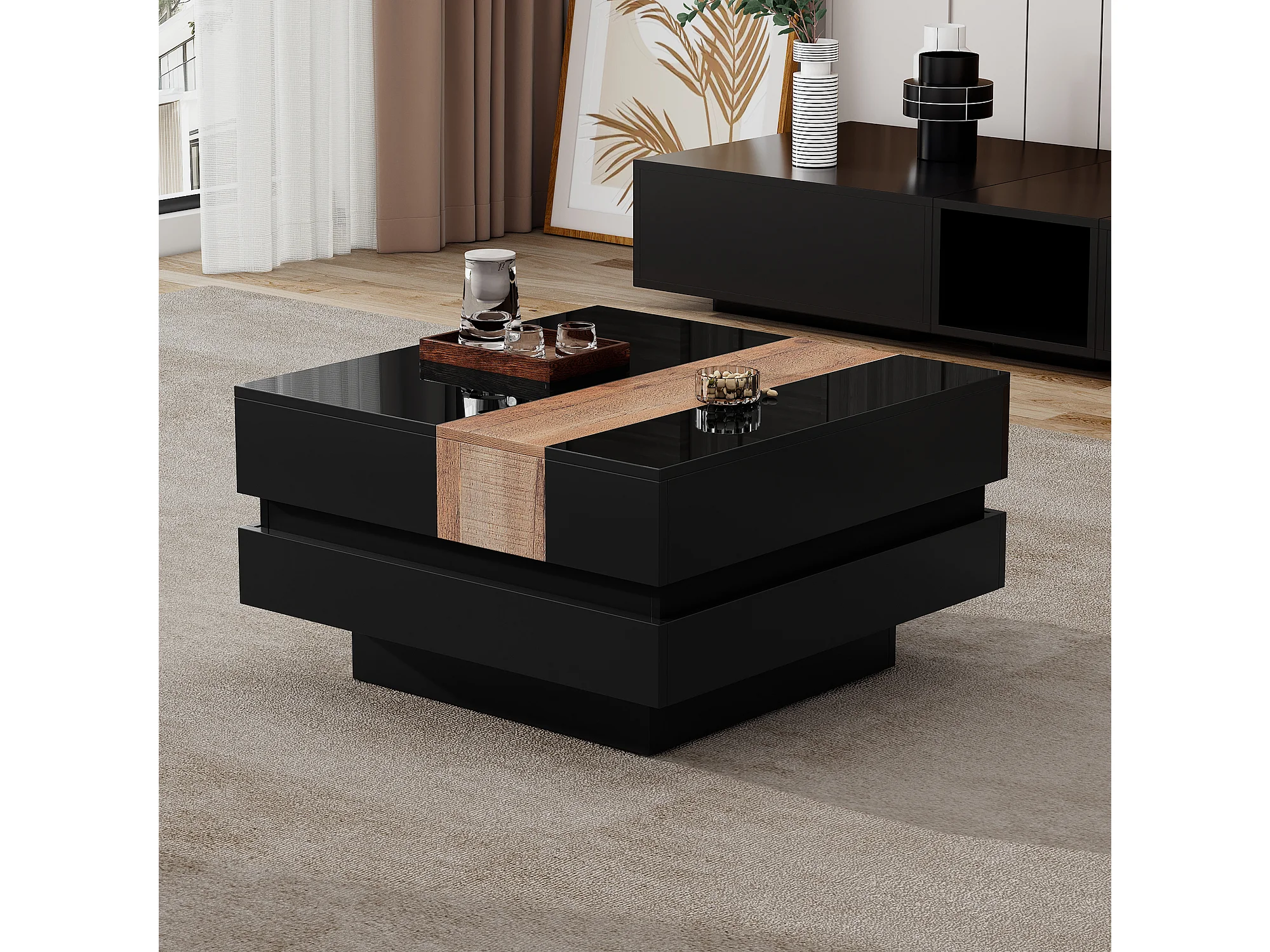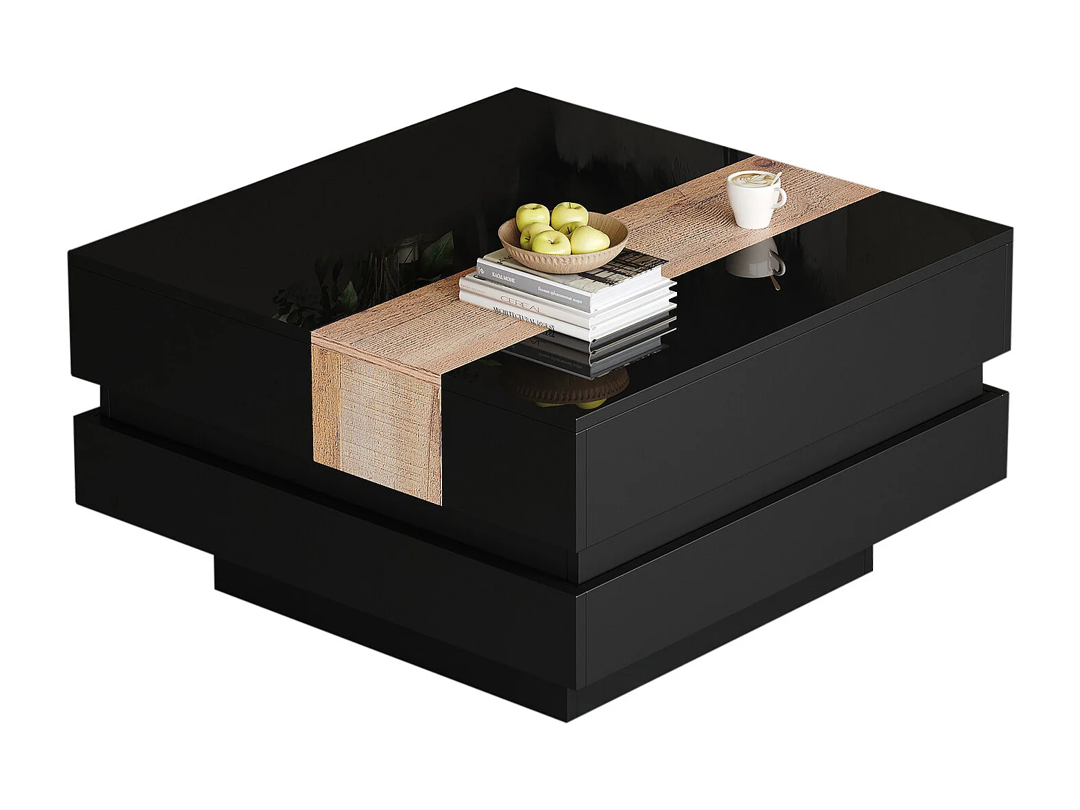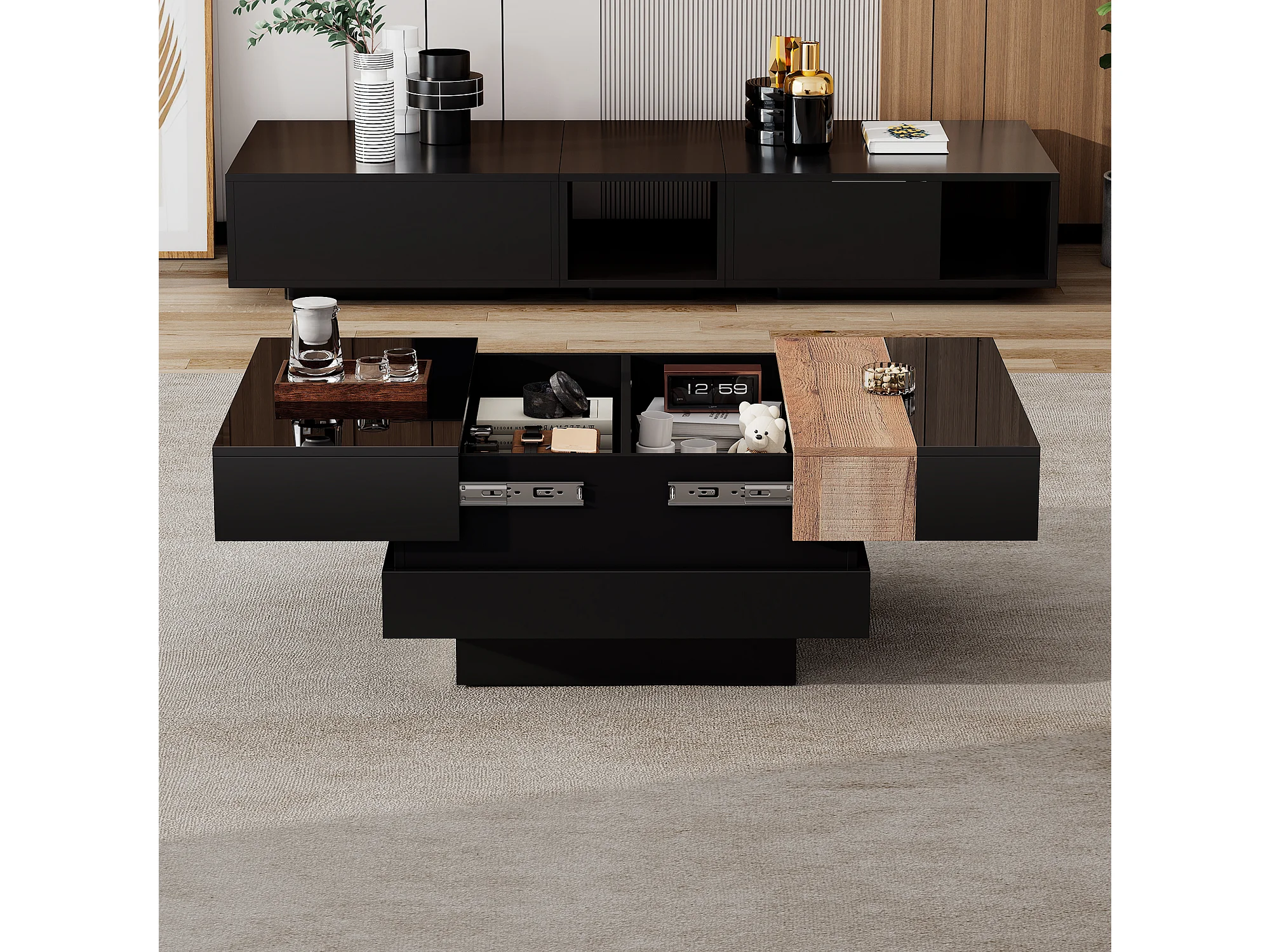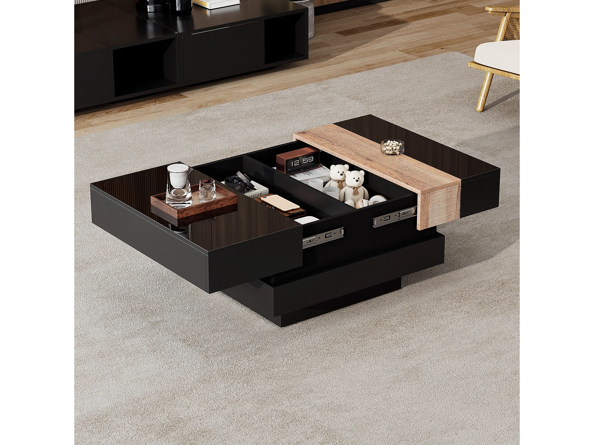 Ausziehbarer Couchtisch 70x70x39 cm - mit Stauraum - Hochglanzfinish - MDF - ​​Schwarz​