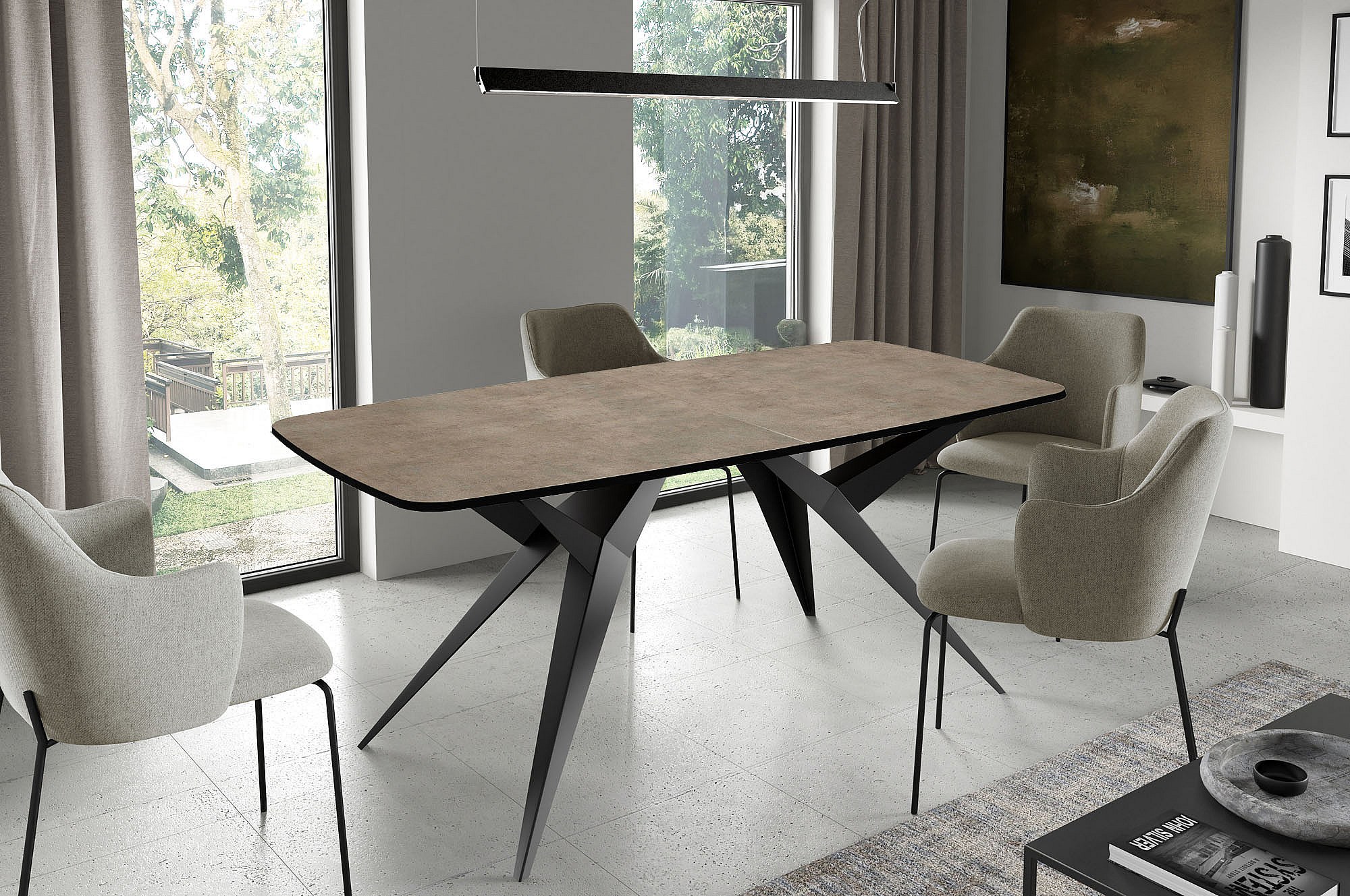 Ausziehbarer Esstisch im Loft-Stil – Rechteckiger Tisch mit Schwarzen Metallbeinen, Abgerundeten Ecken für 6-10 Personen – 160 cm – Beton-Optik Dunkelgrau
