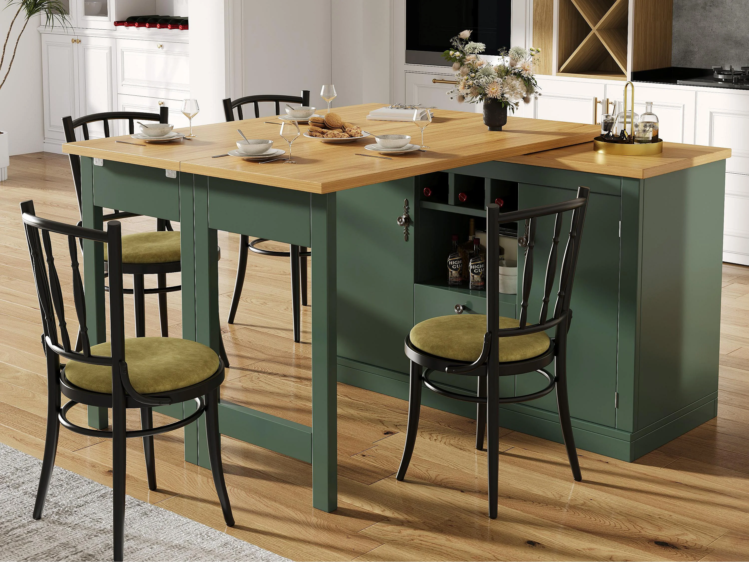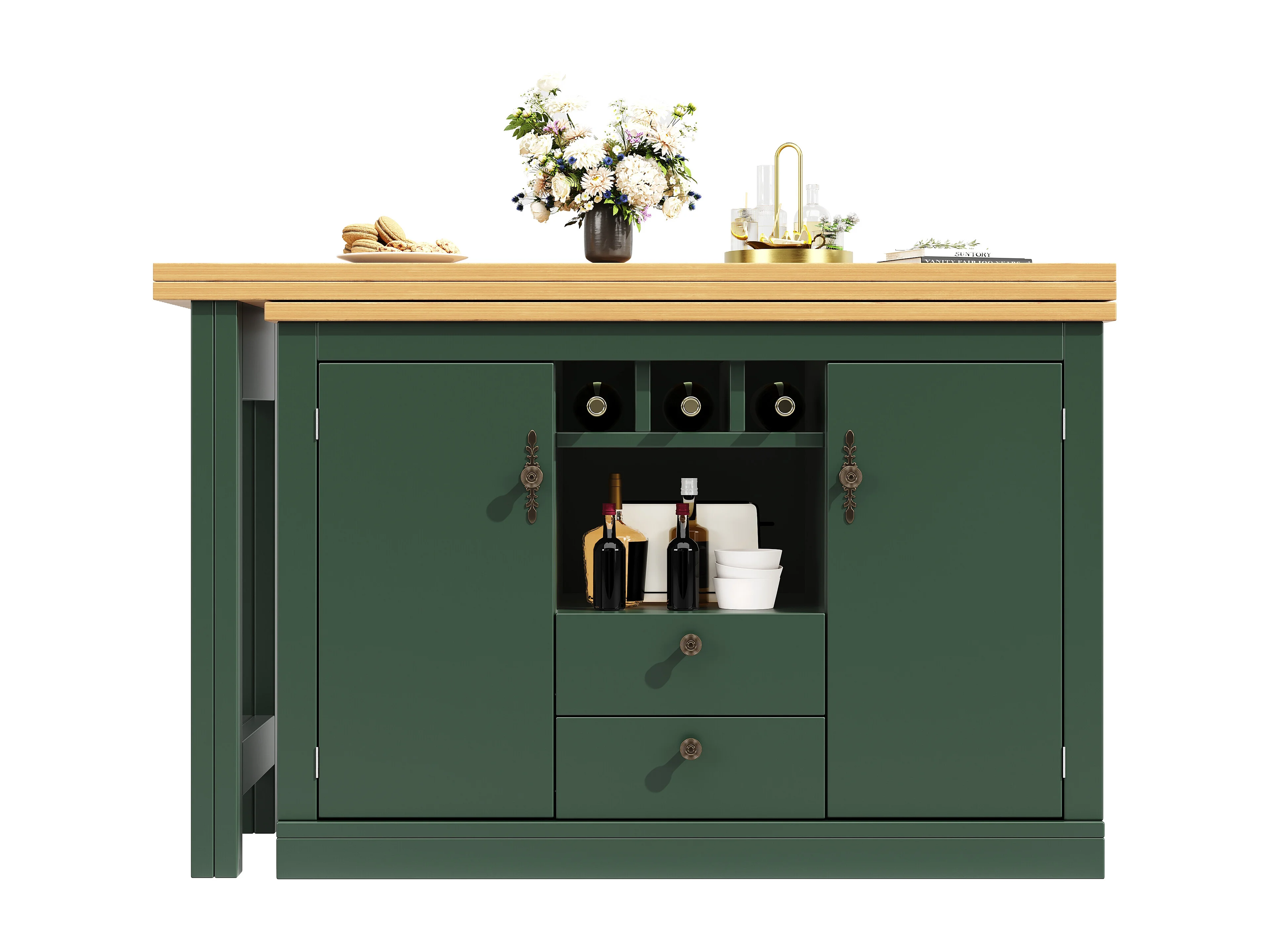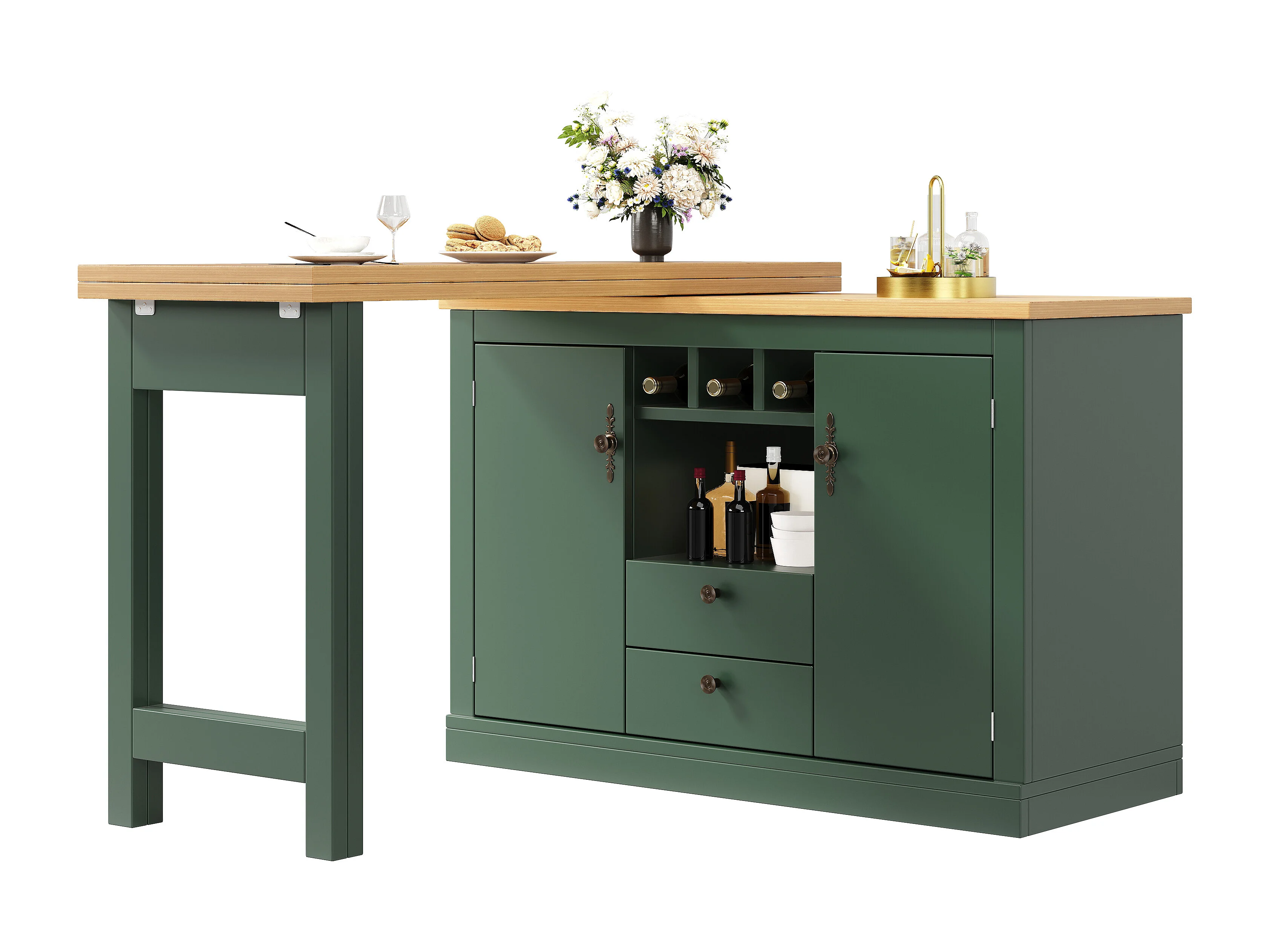 Ausziehbarer Küchen-Bar-Schrank - und 360° Drehung - großer Tisch - 180x79,5x71,5cm - 2 Schubladen und 2 Türen - 3 Weinfächer - Grün