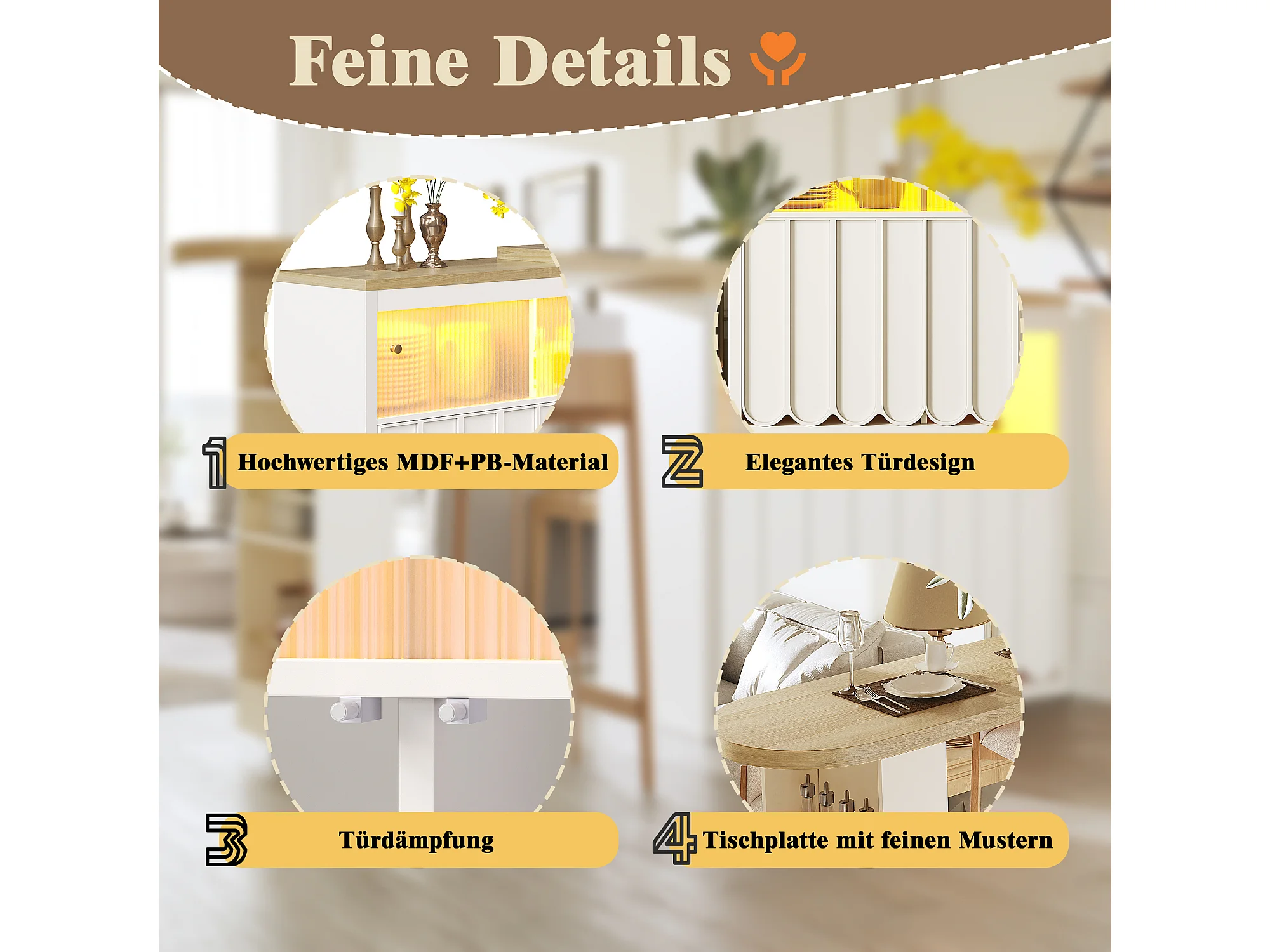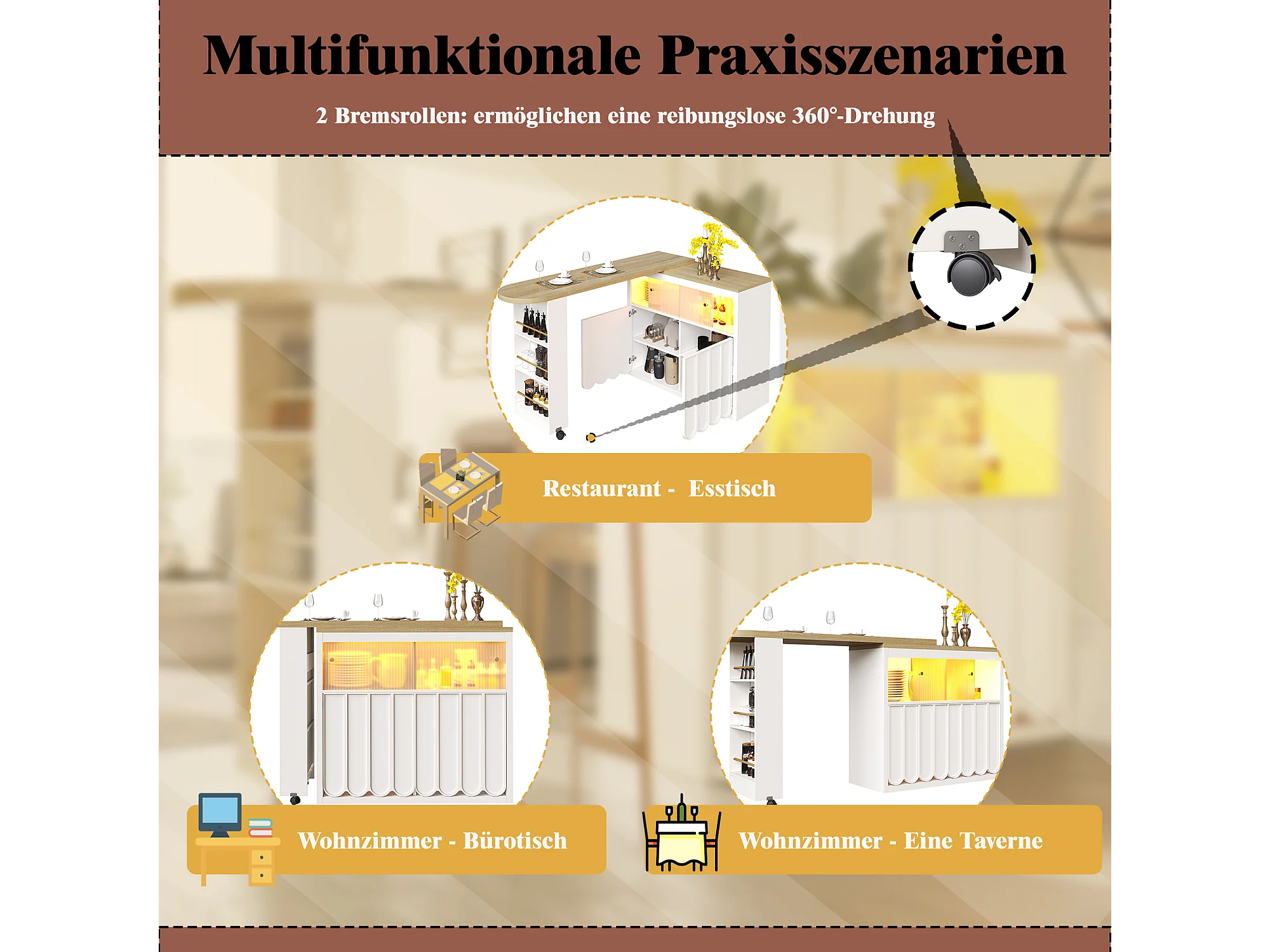 Ausziehbarer Stehtisch mit Stauraum - 135-205 x 39 x 100 cm - mobile Kücheninsel mit LEDs + 4 Türen - MDF - weiß