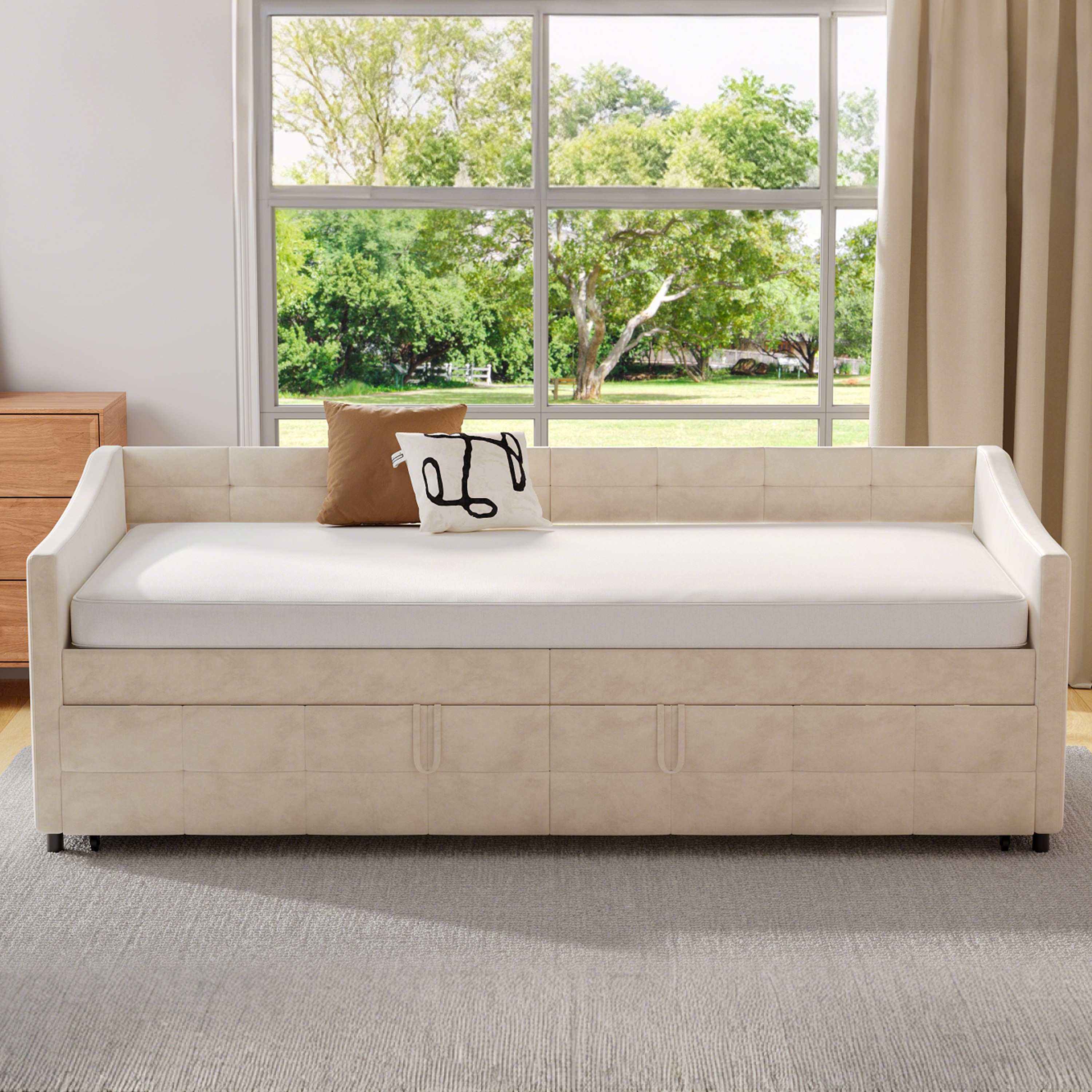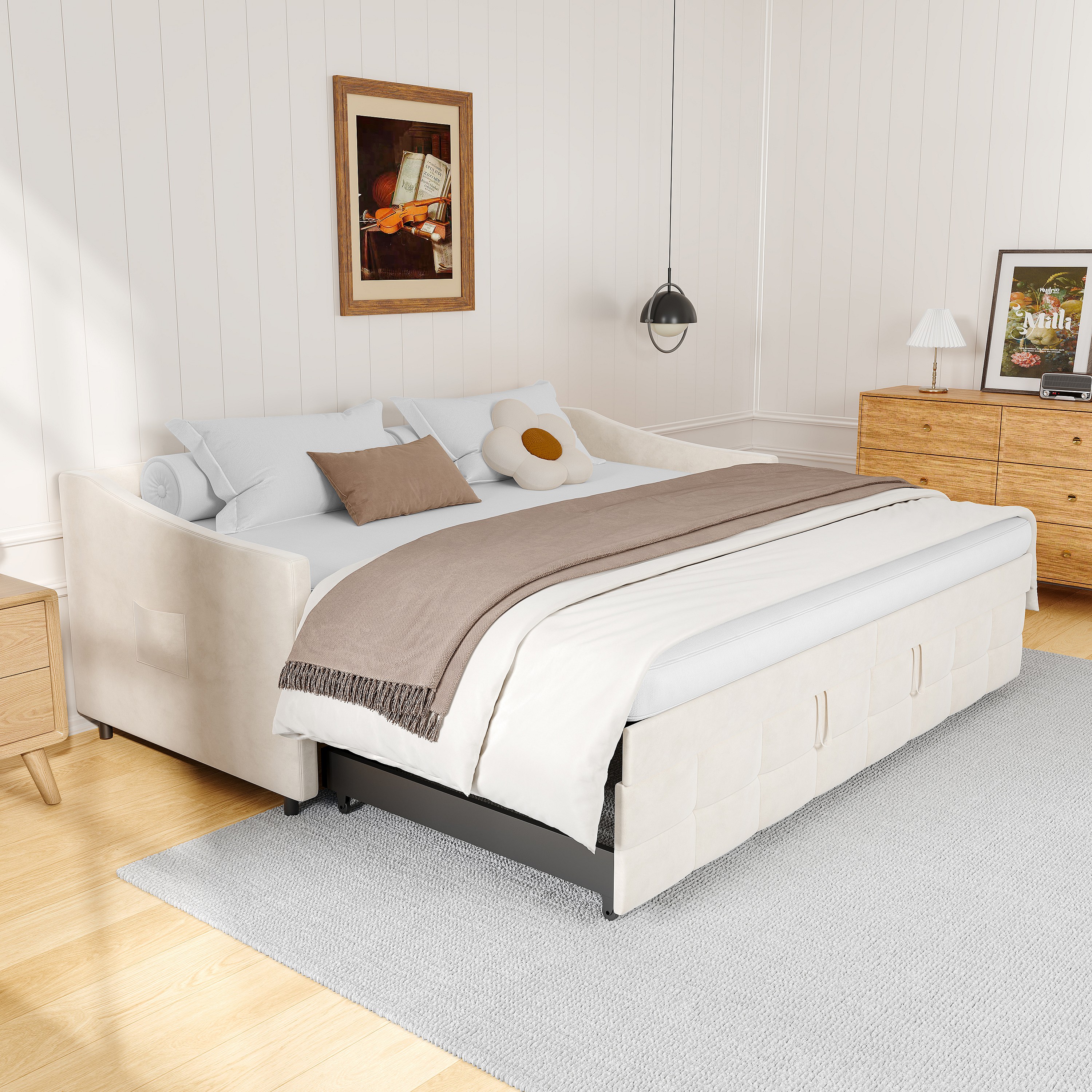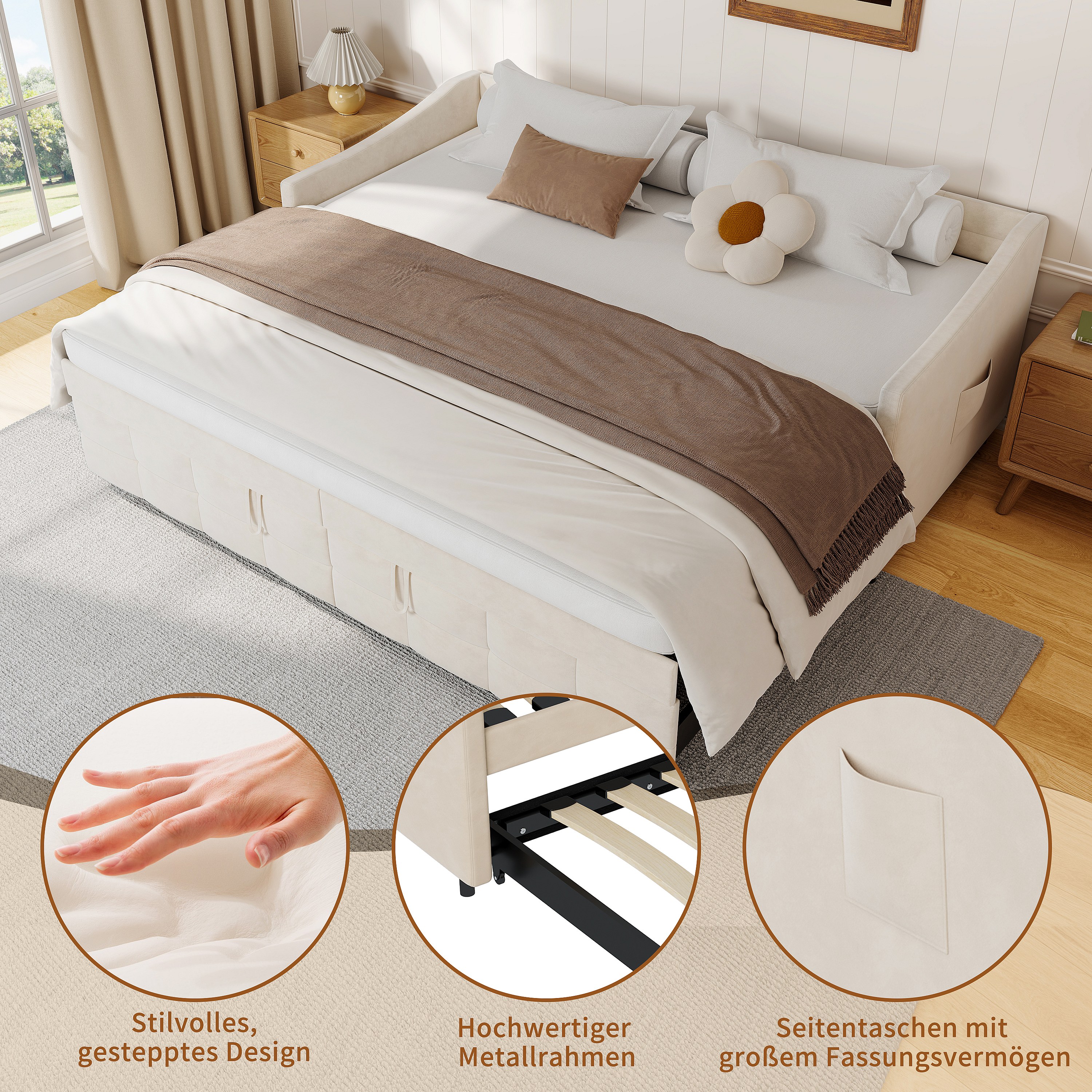 Ausziehbares Schlafsofa aus beigem Samt 90x200 cm, umbaubar auf 180x200 cm mit hydraulischem Mechanismus, Struktur aus Holz und Metall, praktische Seitentasche