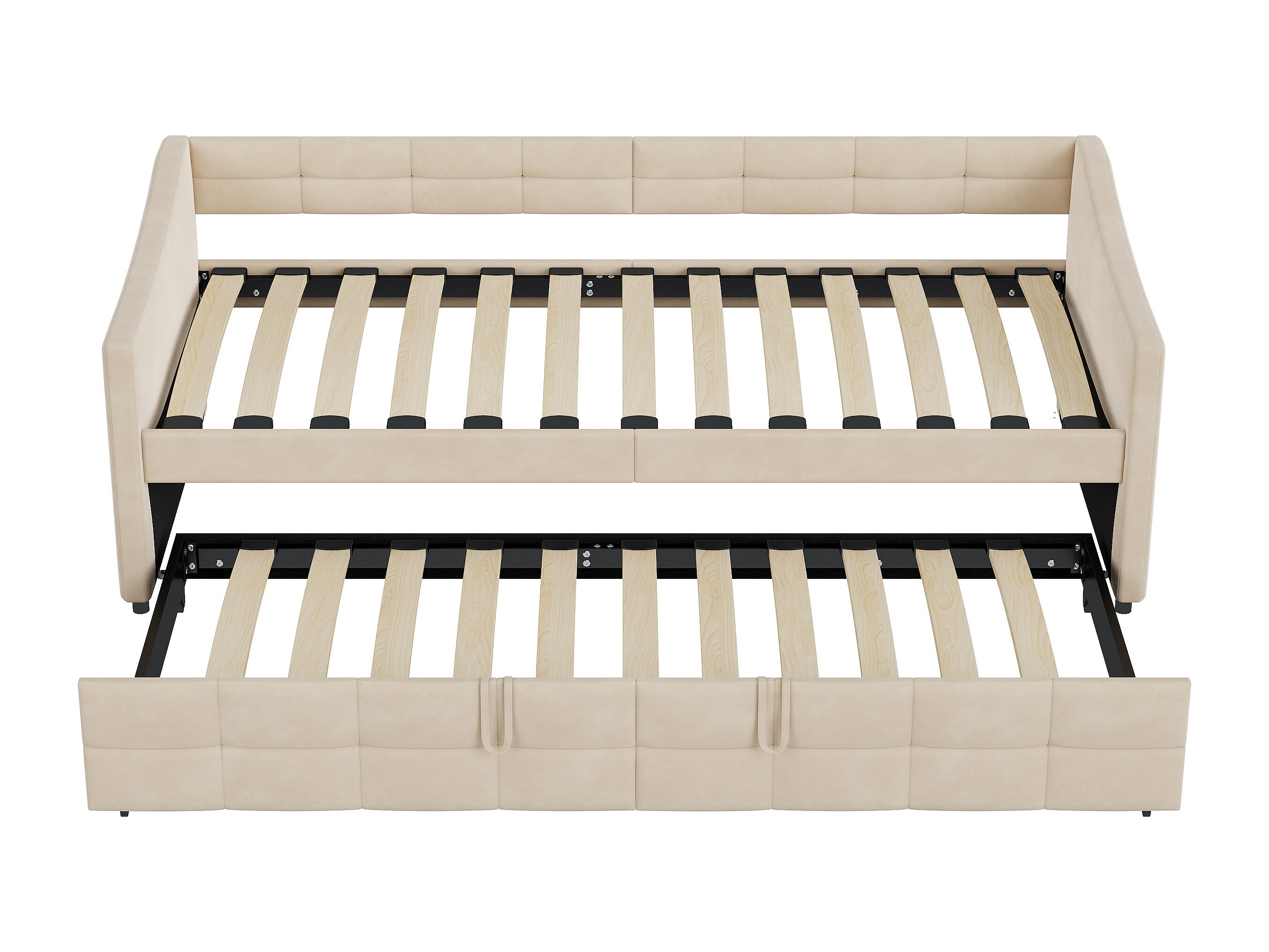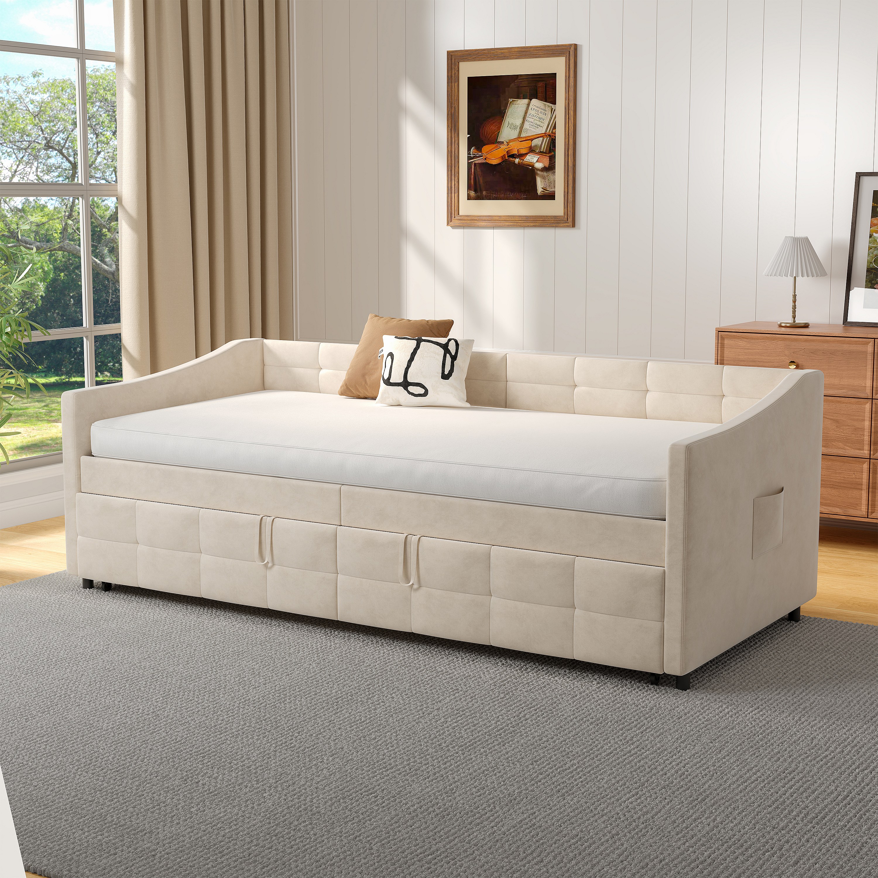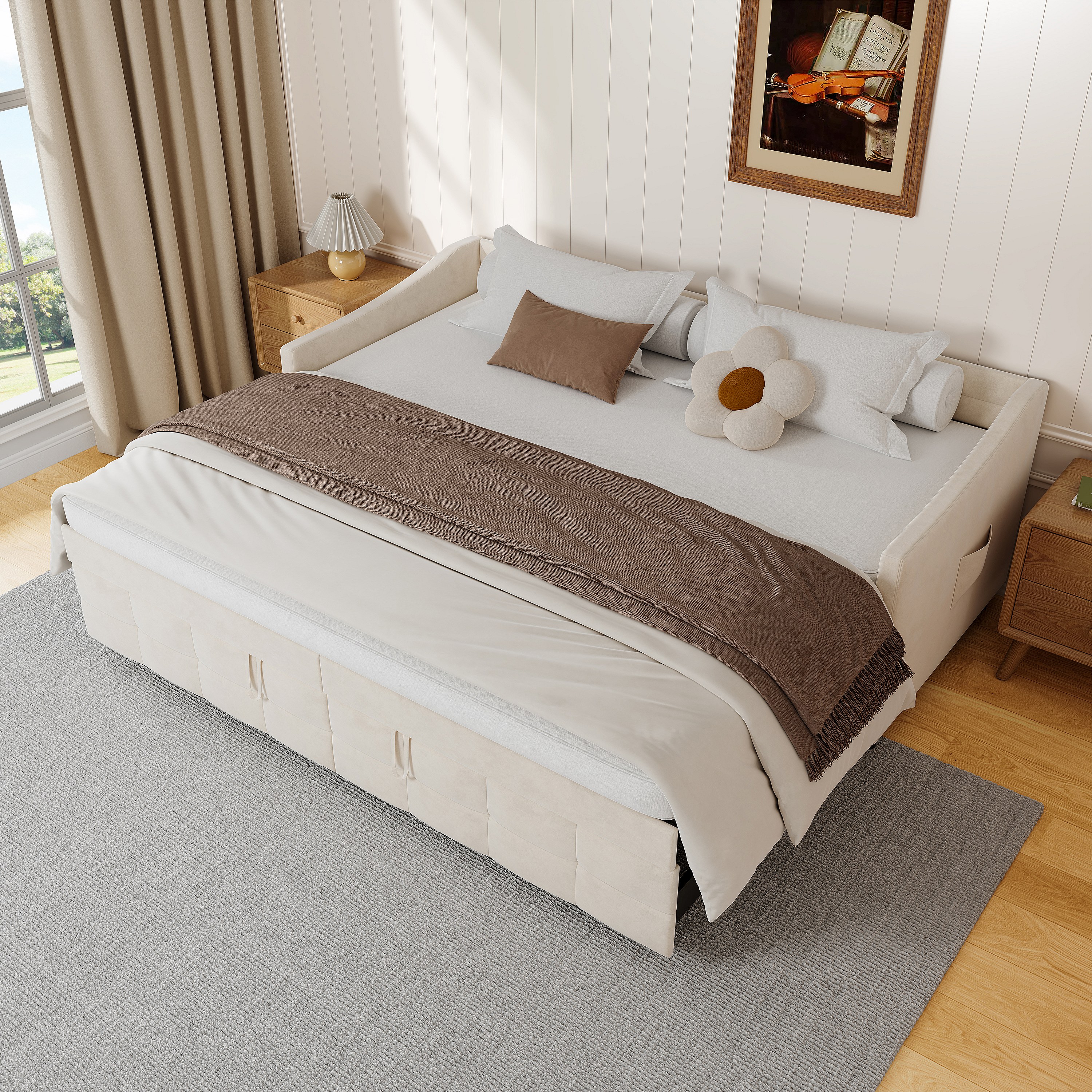 Ausziehbares Schlafsofa aus beigem Samt 90x200 cm, umbaubar auf 180x200 cm mit hydraulischem Mechanismus, Struktur aus Holz und Metall, praktische Seitentasche
