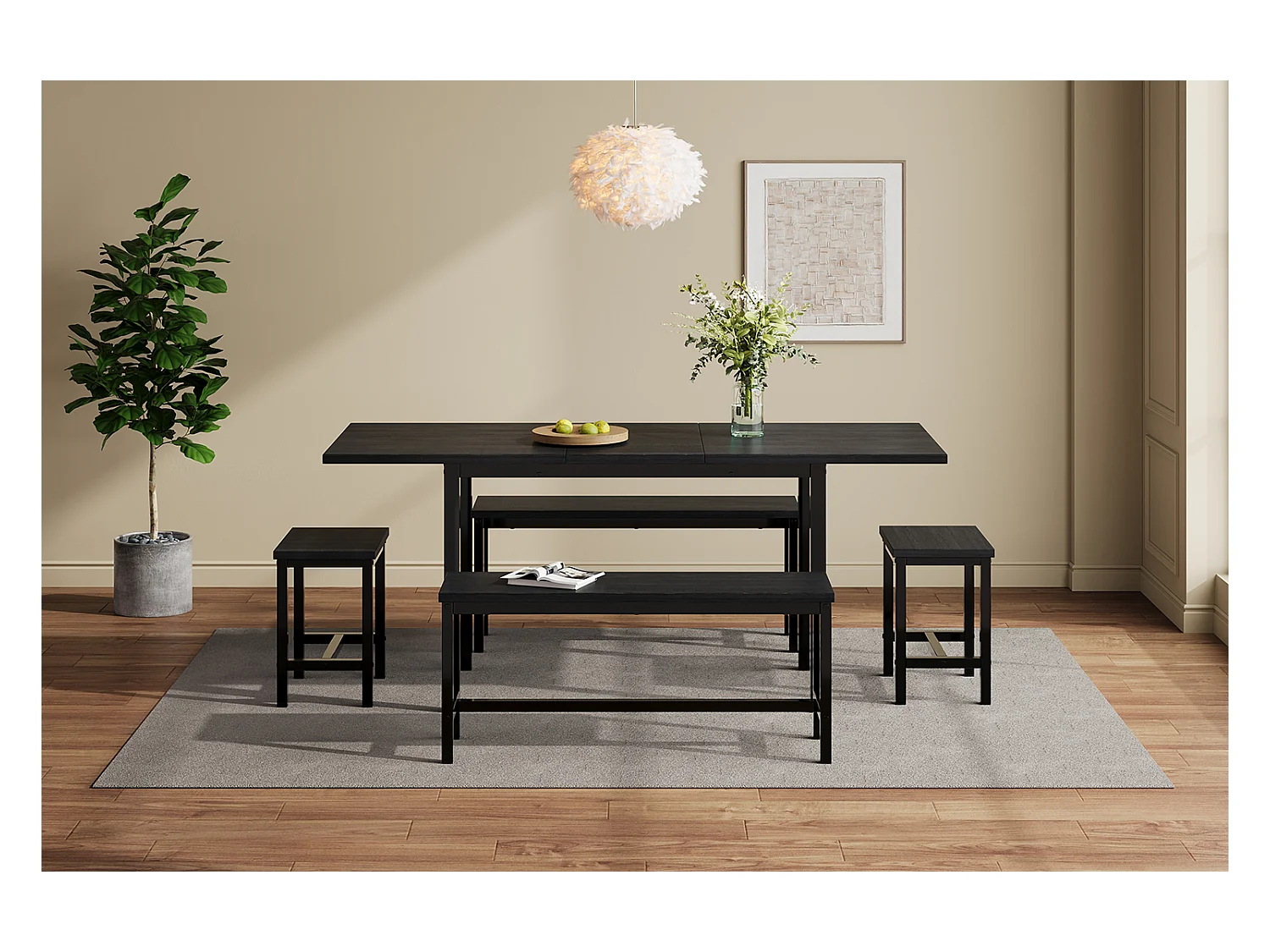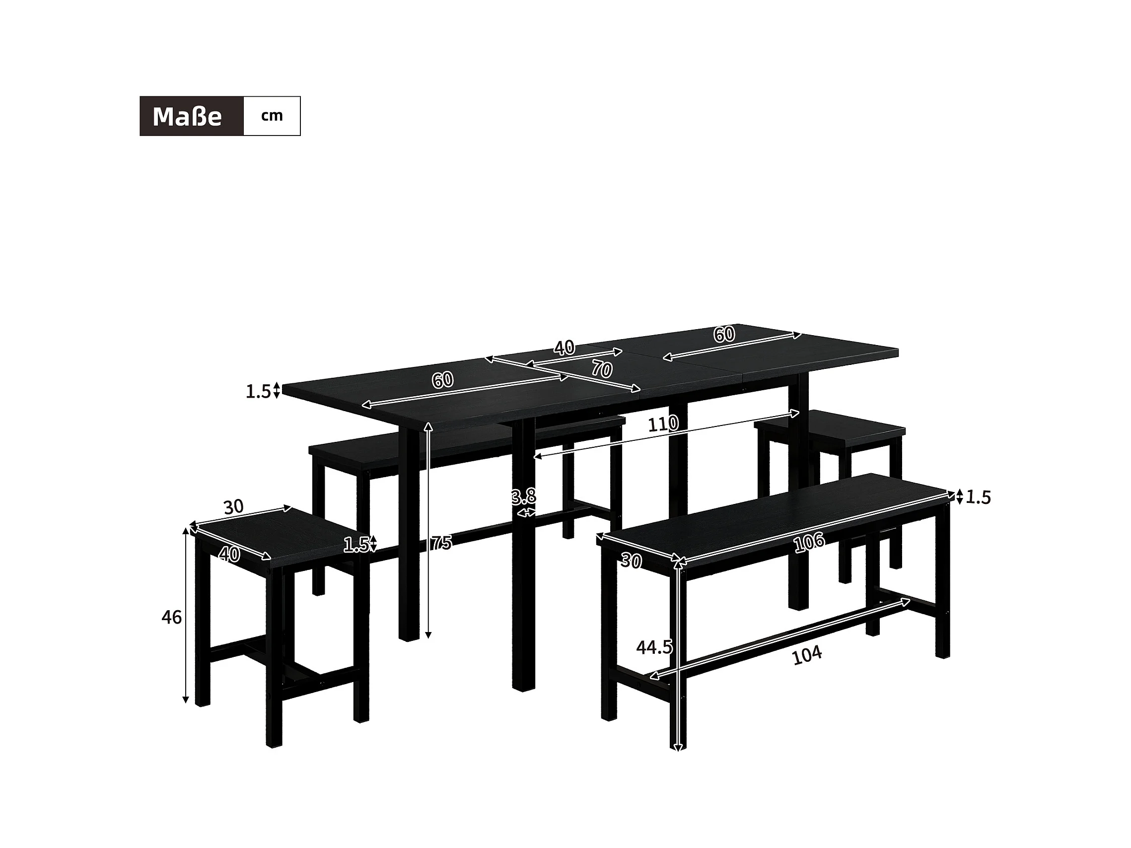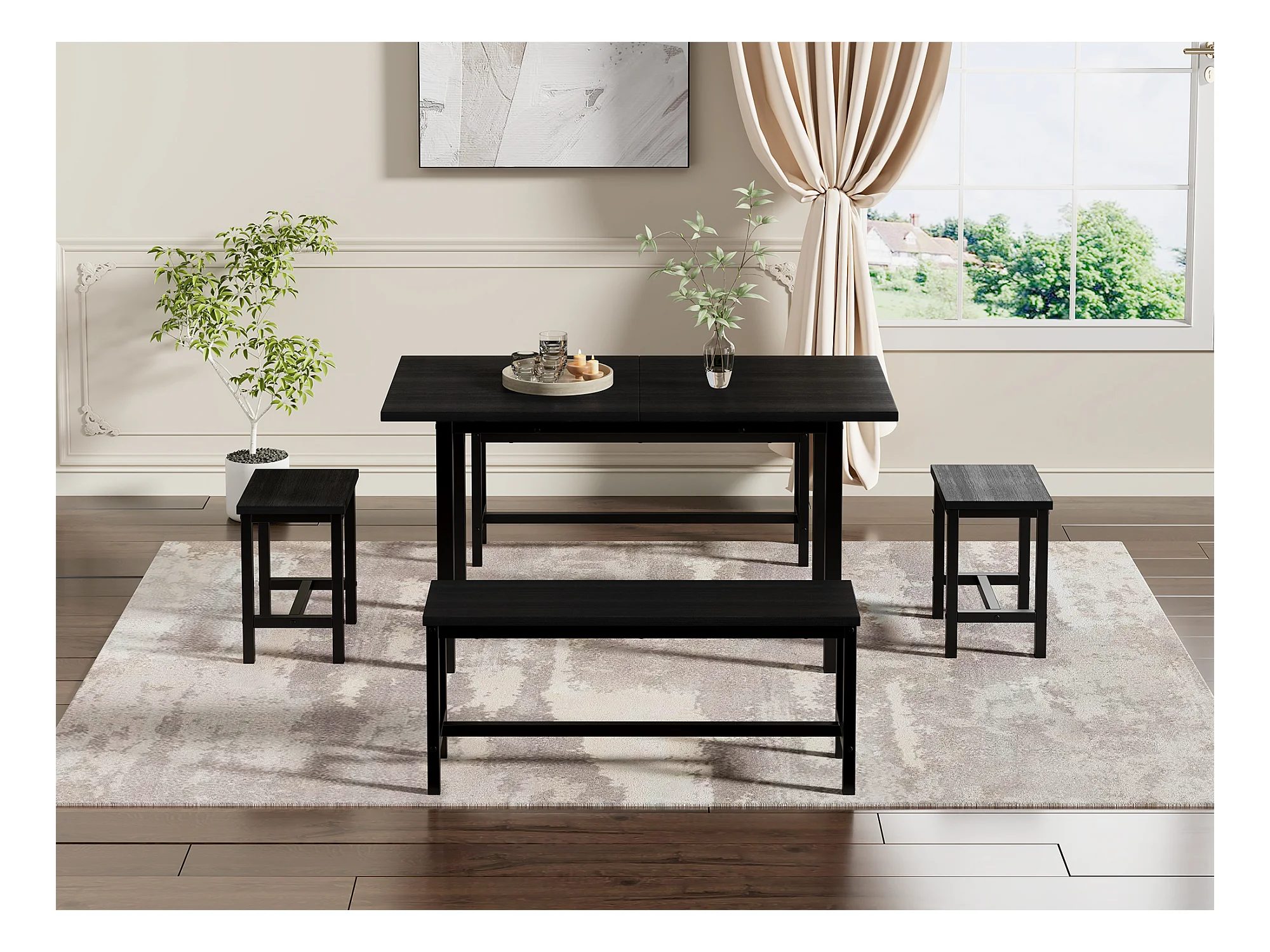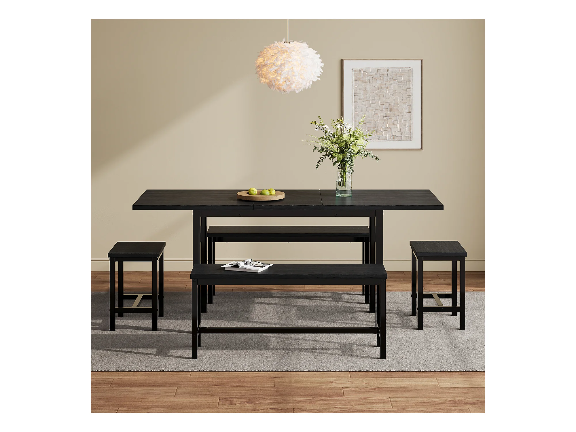 Ausziehbares Tischset + 4 Stühle - 160/120 x 80 x 75 cm - MDF-Holz und Metall - Schwarz
