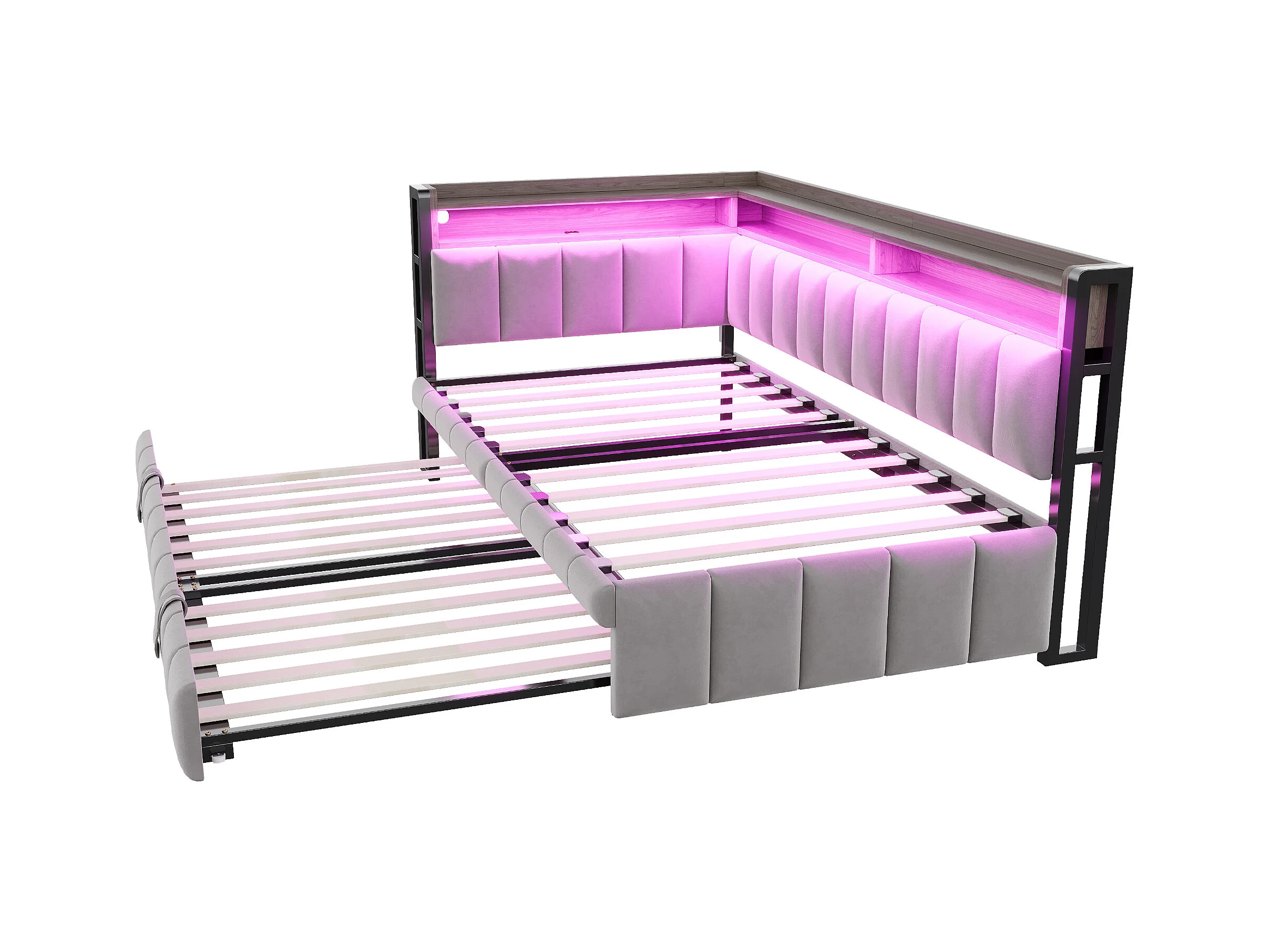 Ausziehbett 90 x 200 cm – Kinderbett mit LED-Beleuchtung und Stauraum – hellgrauer Samt – Matratze nicht enthalten