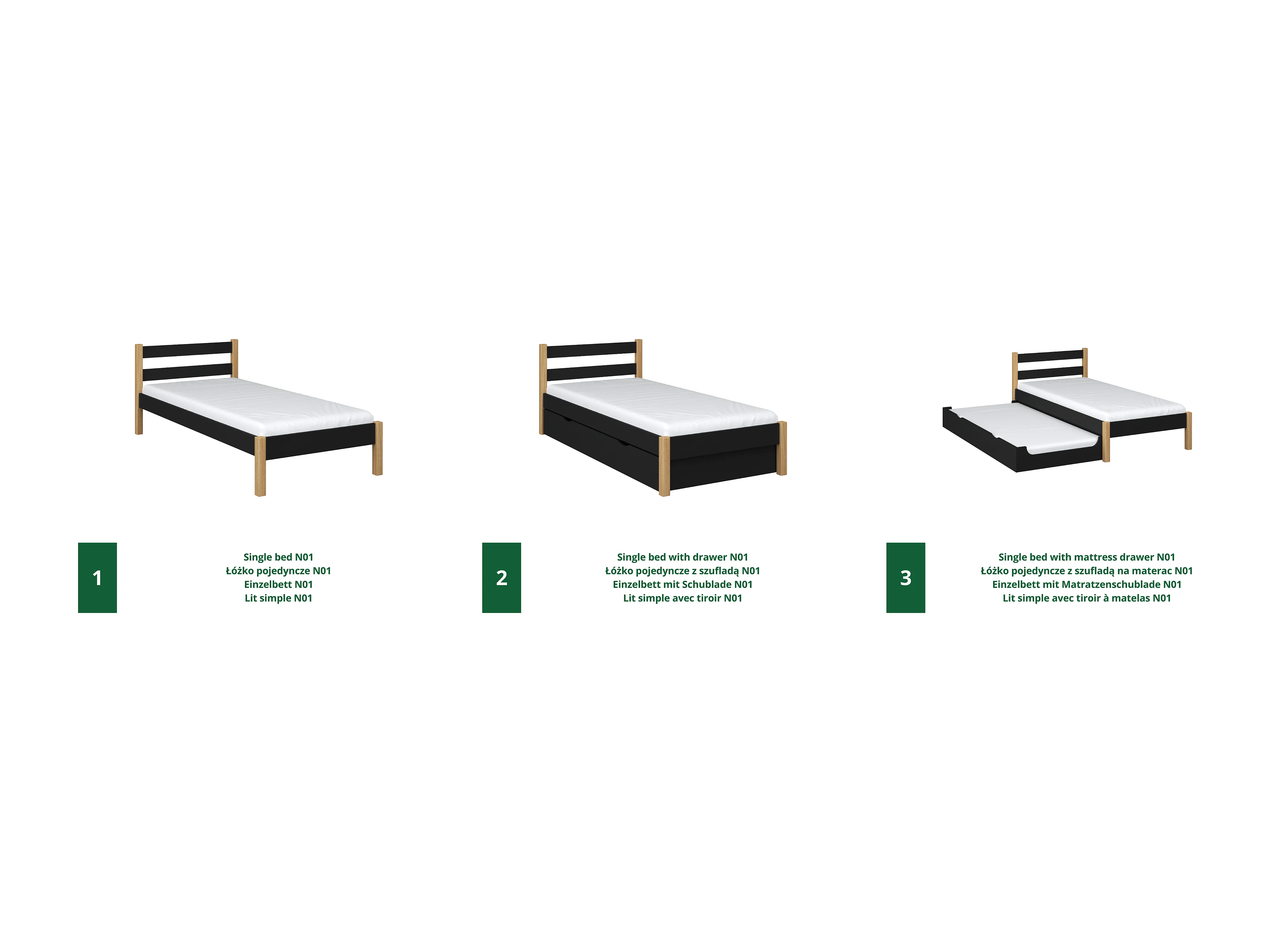 AUSZIEHBETT N01 Schwarz / Eiche Natur 90x200