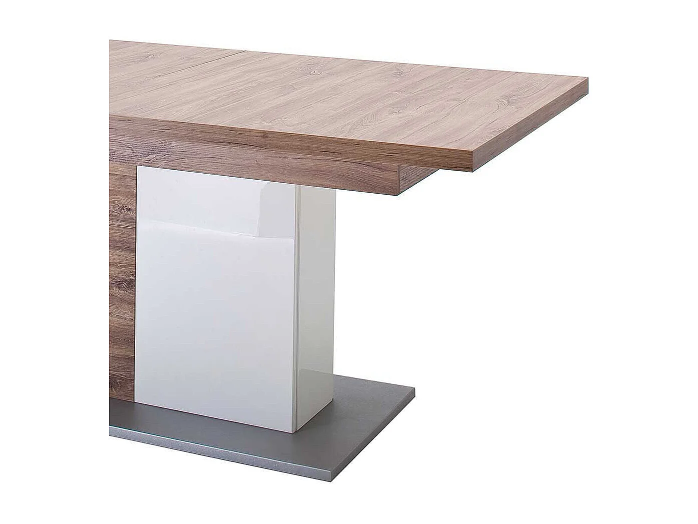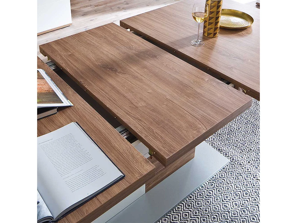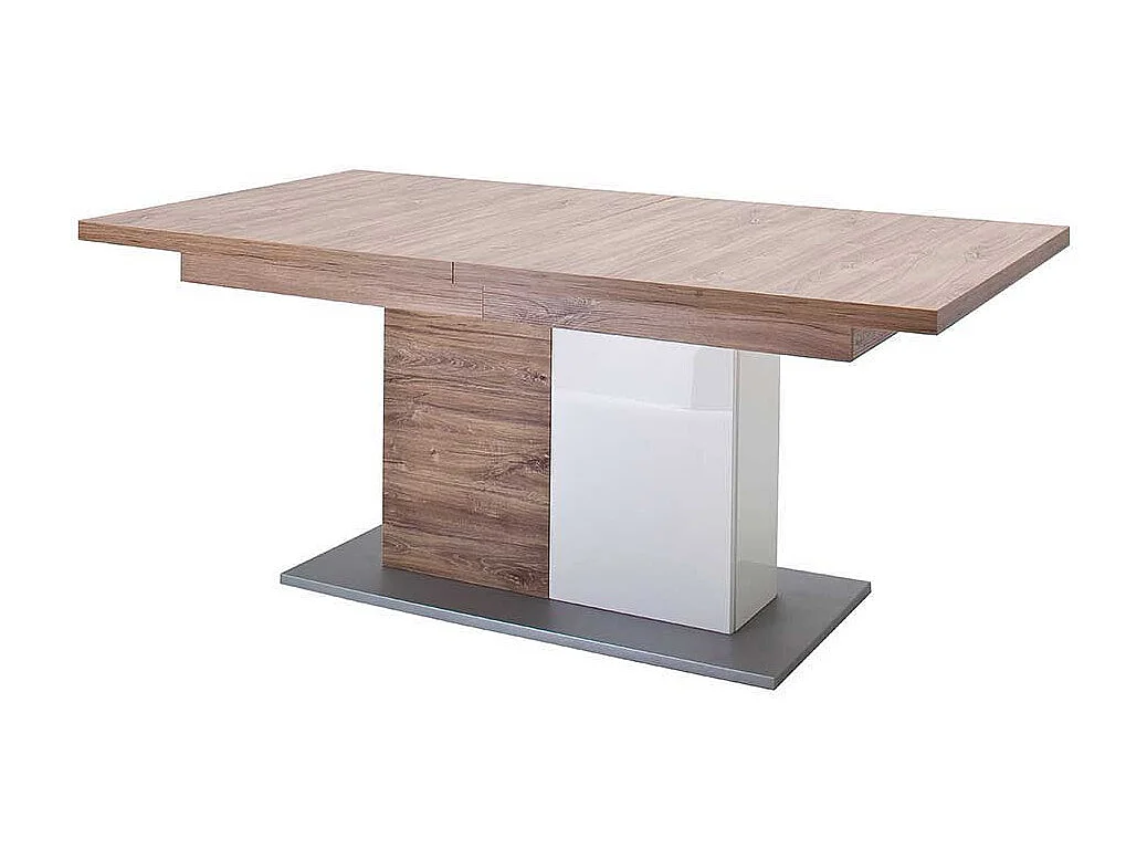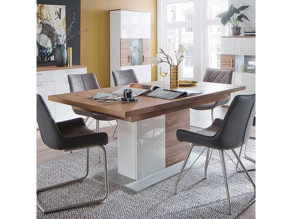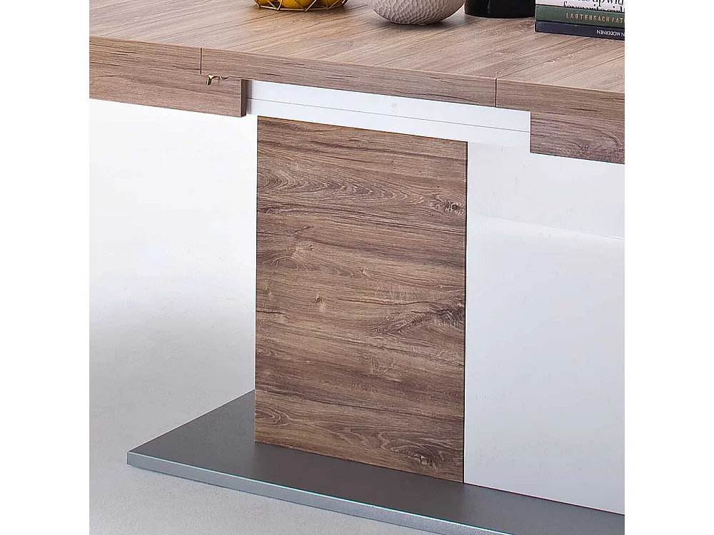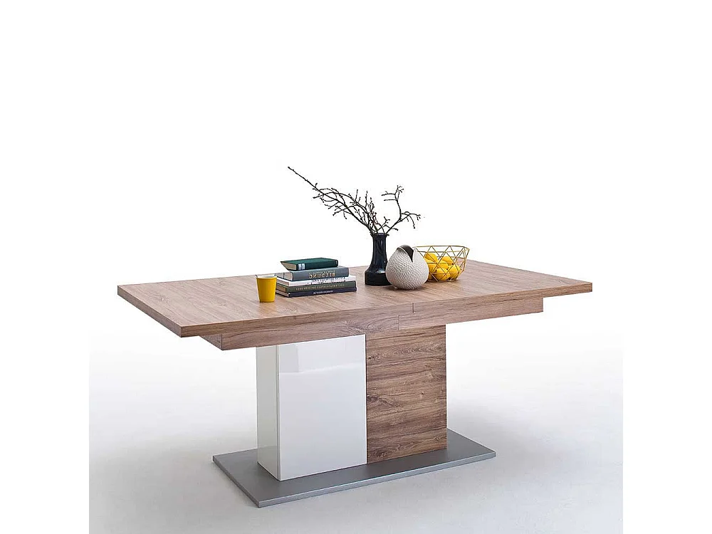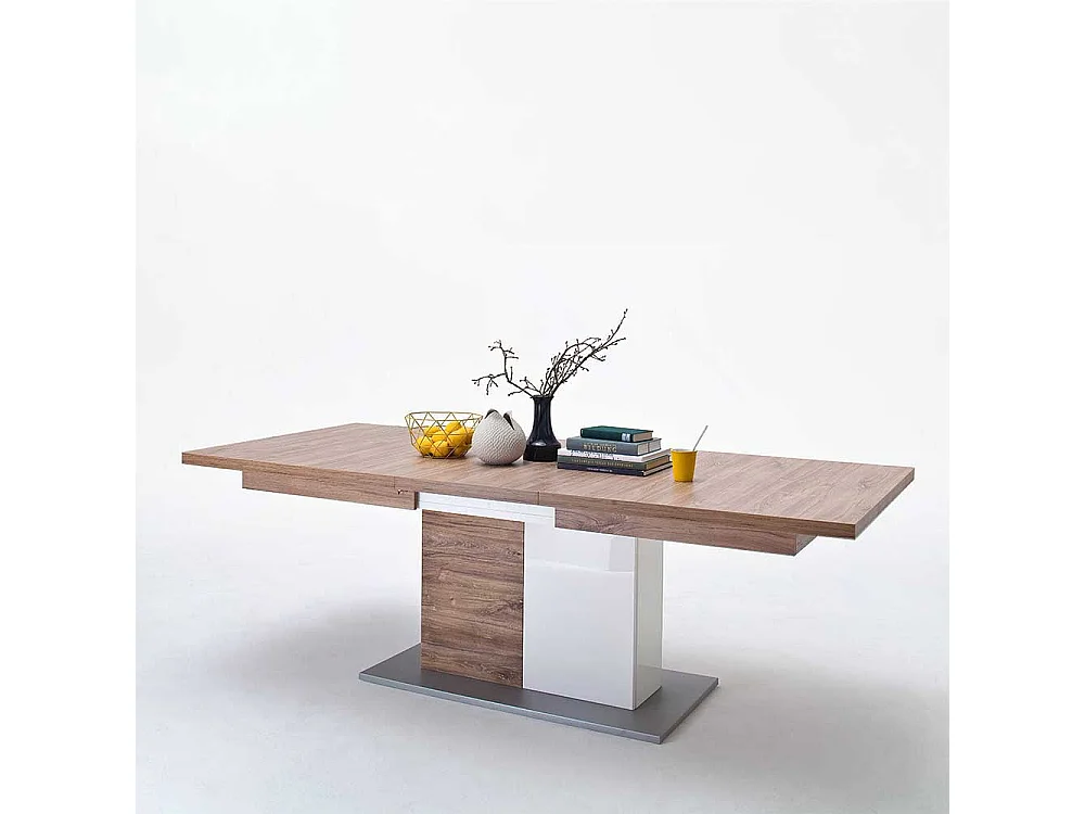 Ausziehtisch in Eiche Dekor und Weiß Hochglanz Säulengestell
