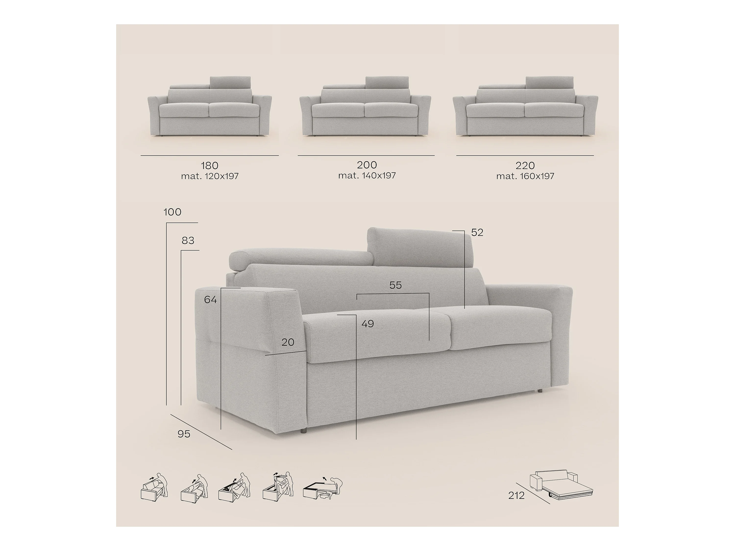 Avalon Schlafsofa mit 18 cm hoher Matratze aus wasserfestem Stoff T03 180 cm (120x197) hellblau