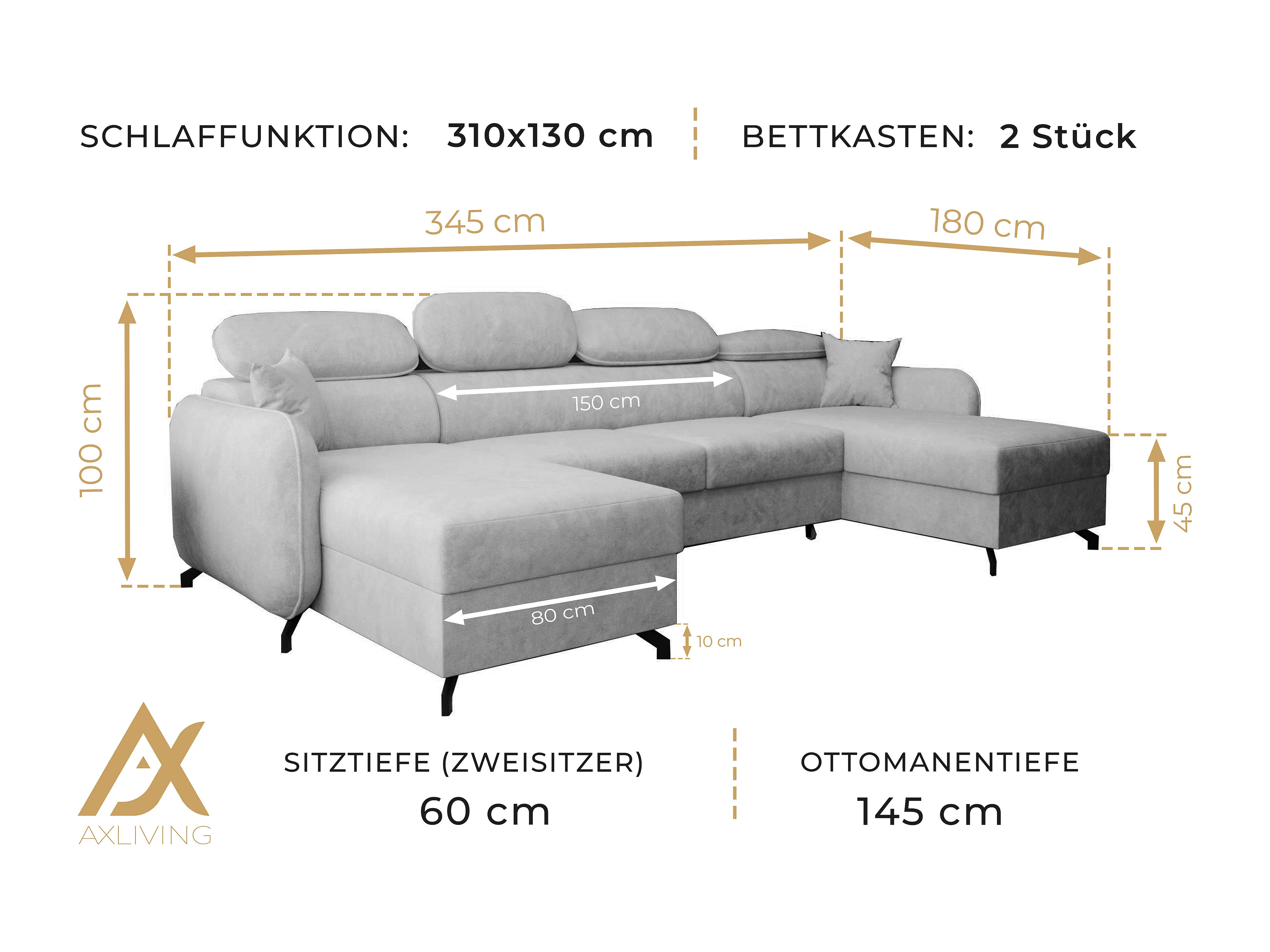 AX LIVING Ecksofa mit Schlaffunktion Ribella 5 345cm Bernstein U-Form