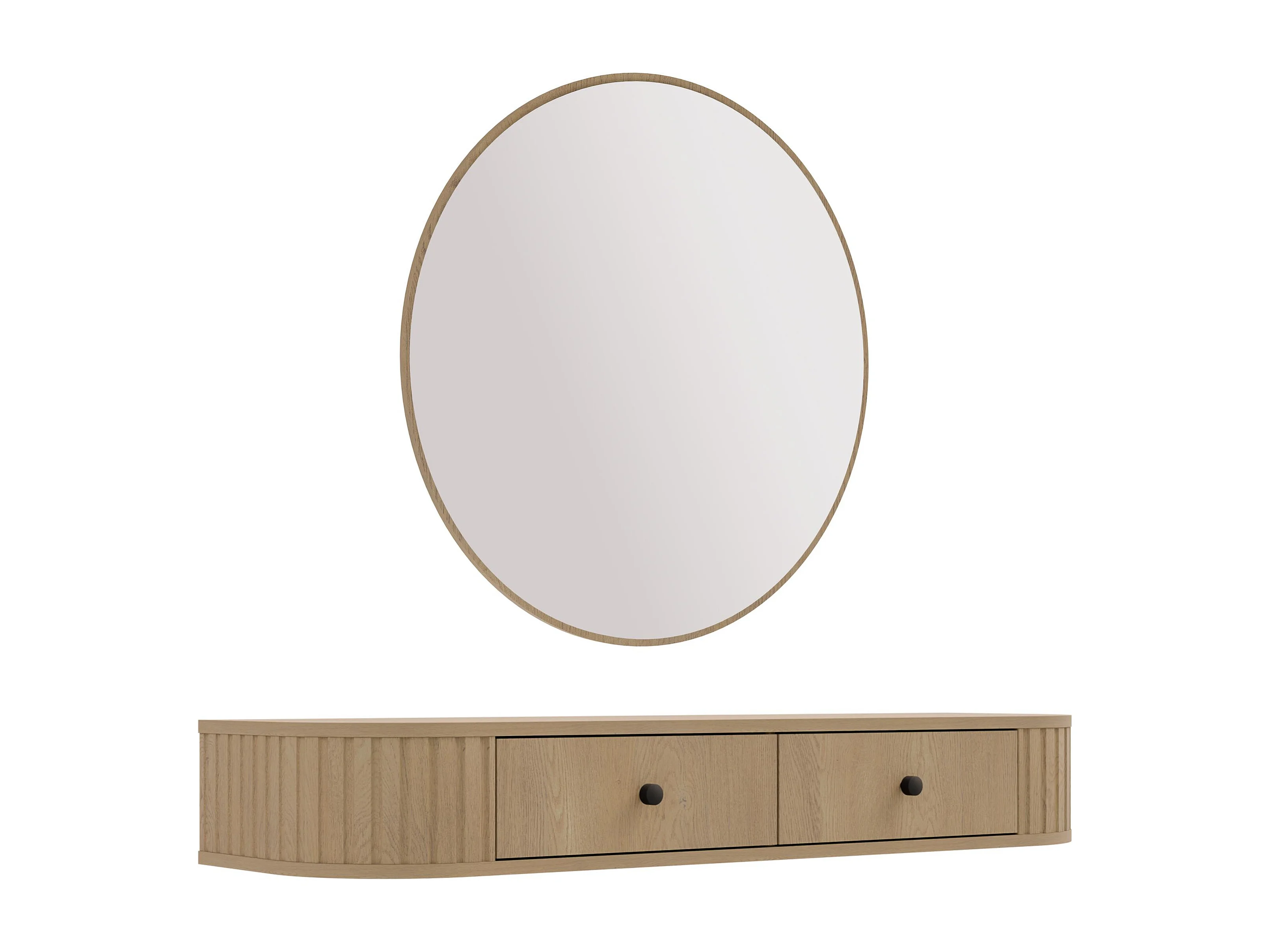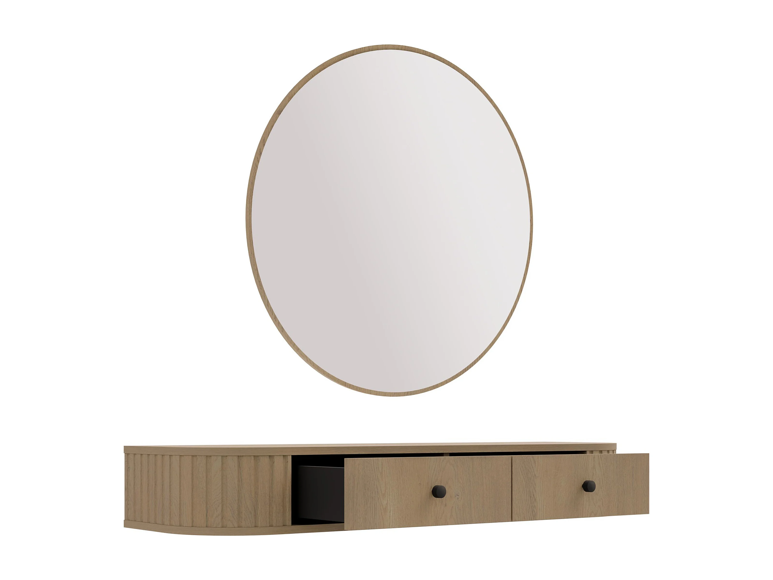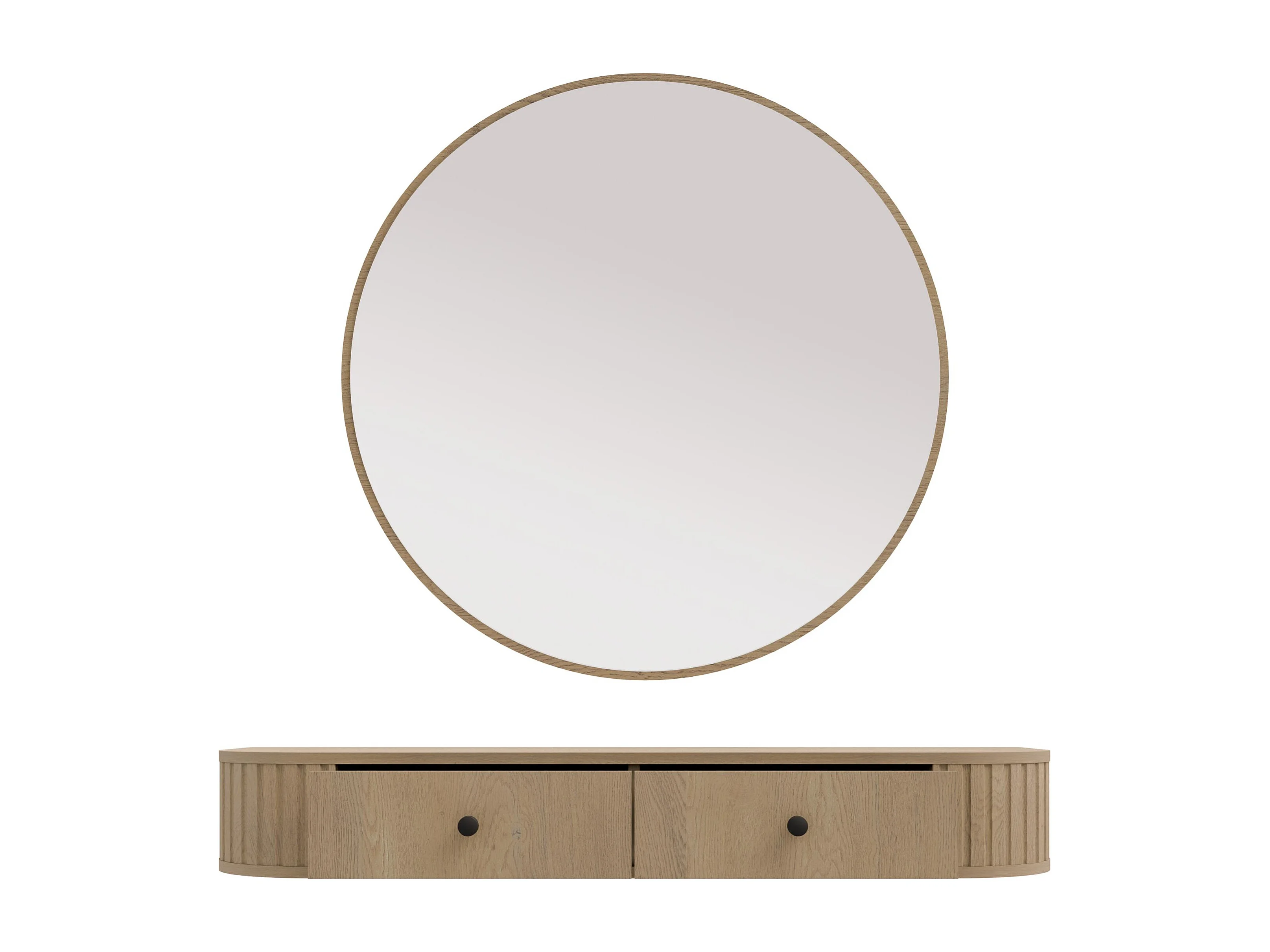 AX LIVING Schminktisch Halay Eiche Cremona 2 Schubladen mit runden Kanten + Rund Spiegel 100 cm