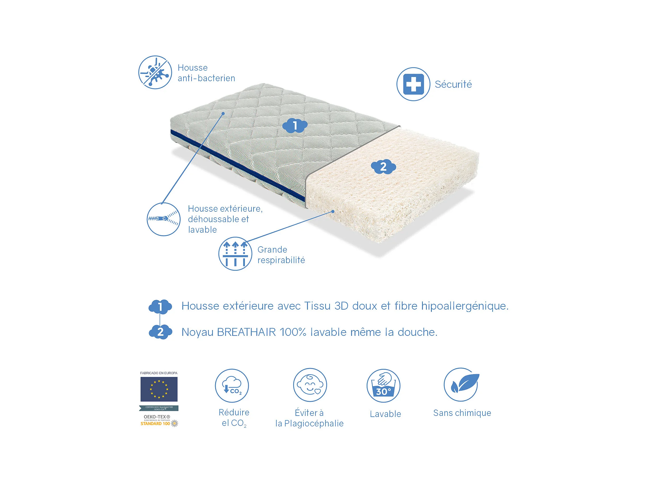 Babybettmatratze 60x120 OCEAN BREATHAIR Höhe 11 CM - Kern 100% waschbar, atmungsaktiv, ökologisch und recycelbar
