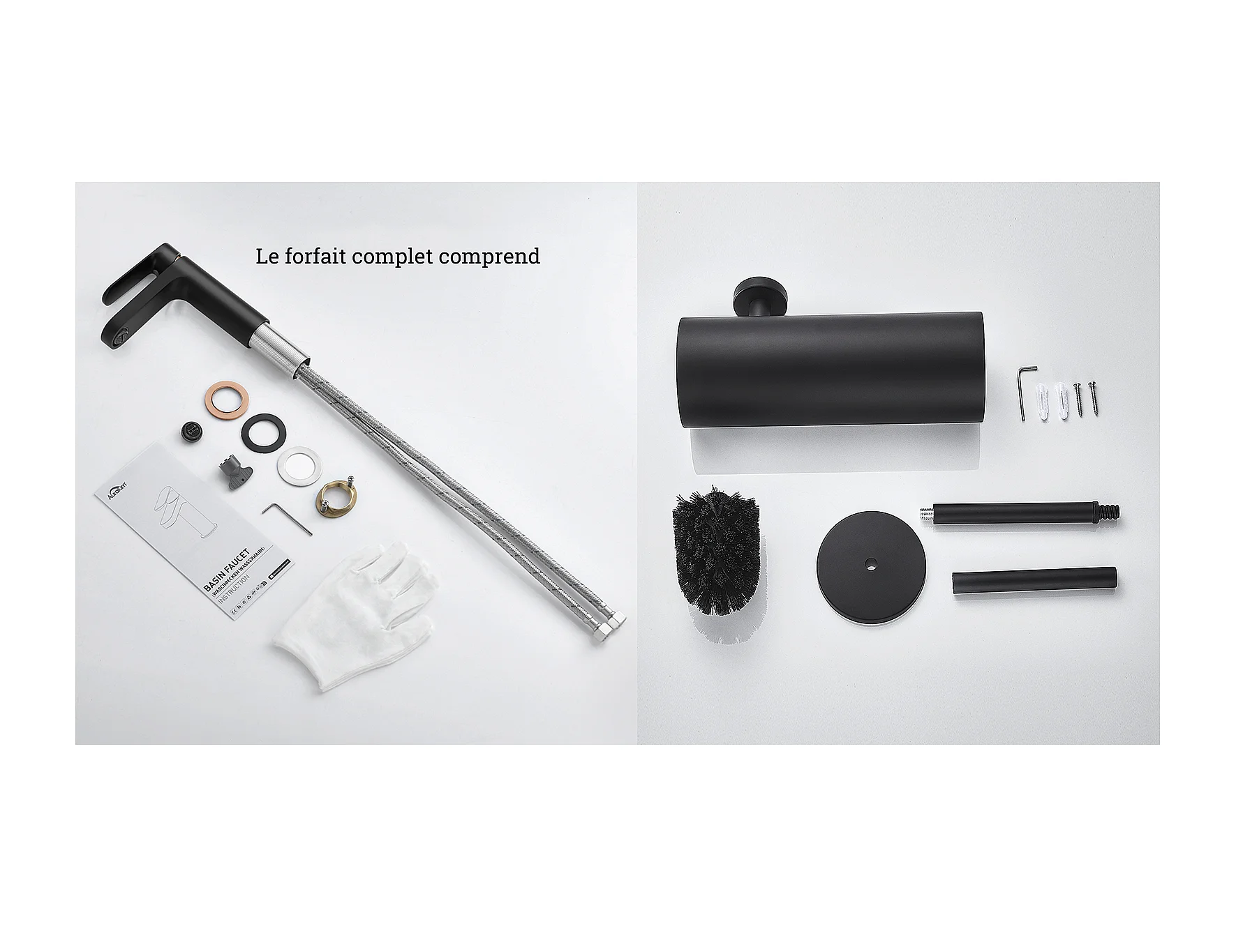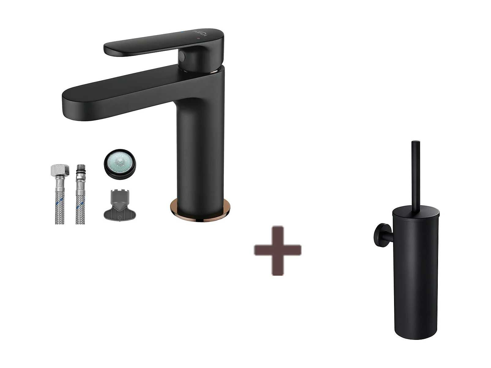 Badarmatur, schwarz, mit abnehmbarem Luftsprudler, Kalt-/Warmwasser + WC-Bürste, Wand-WC mit Bürstenhalter, Edelstahl, schwarz